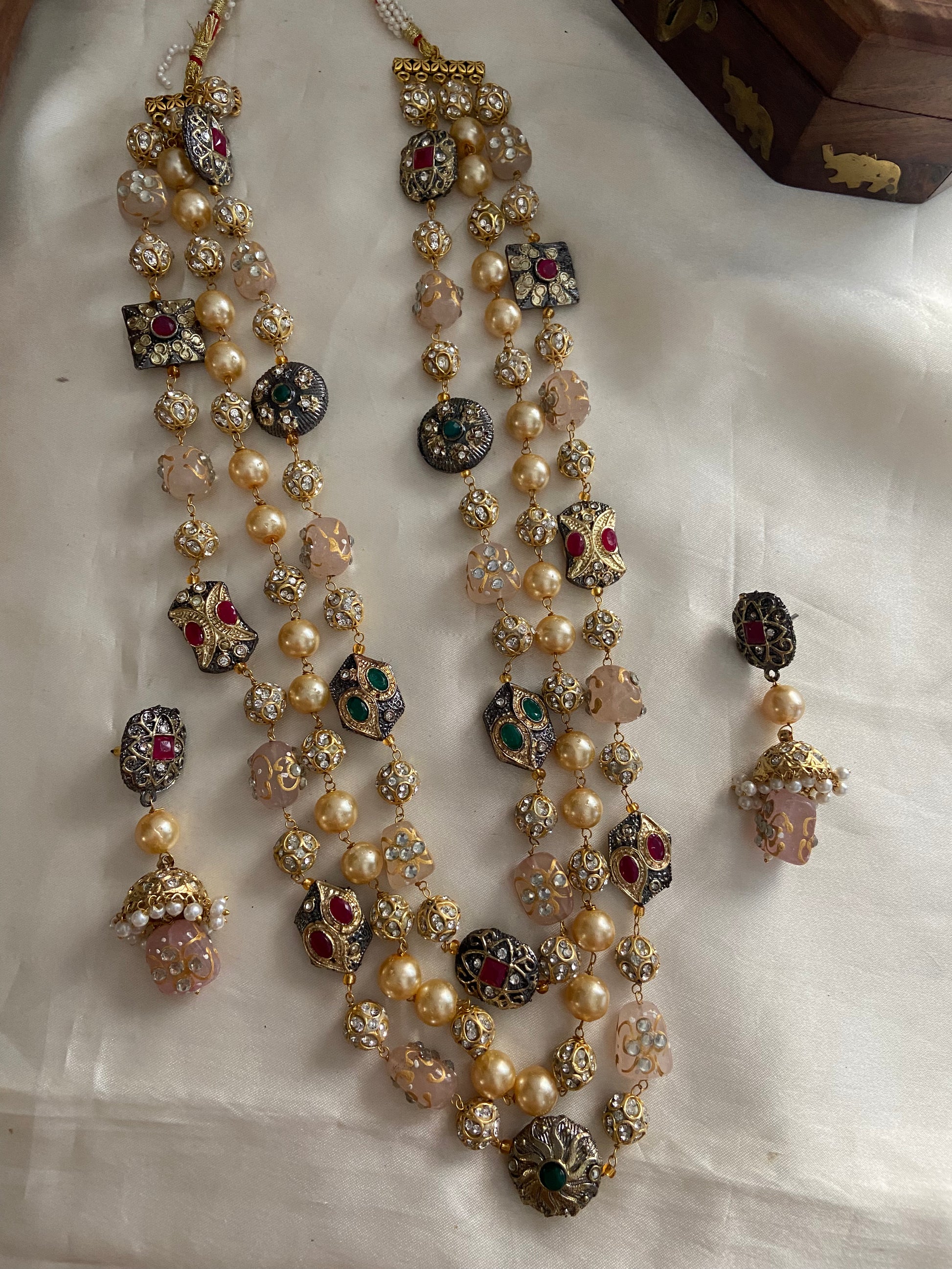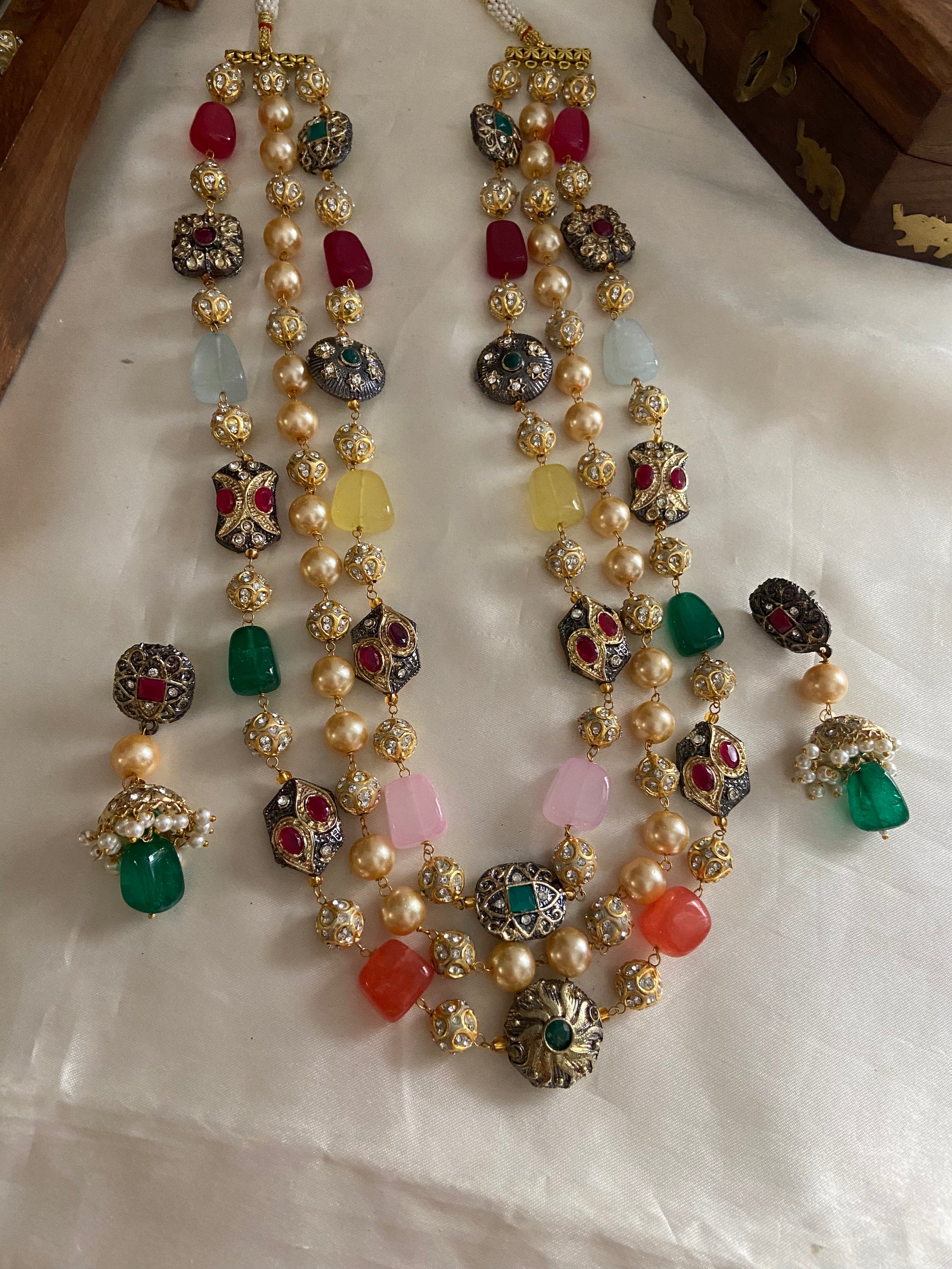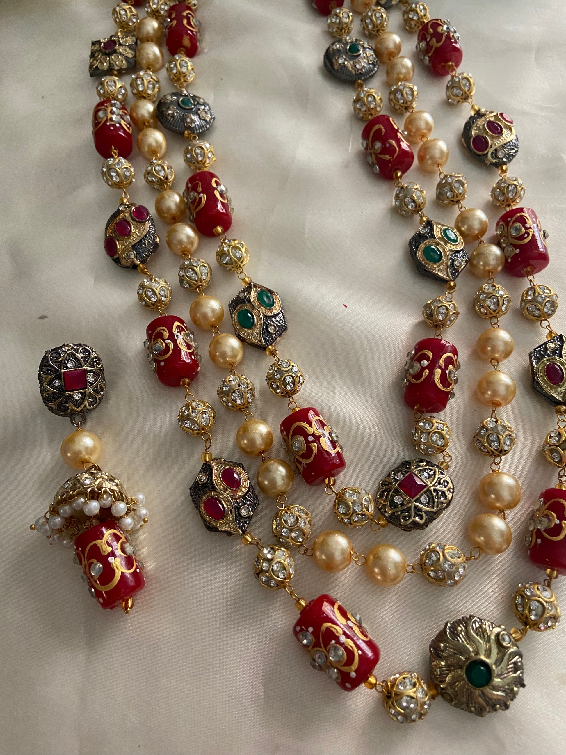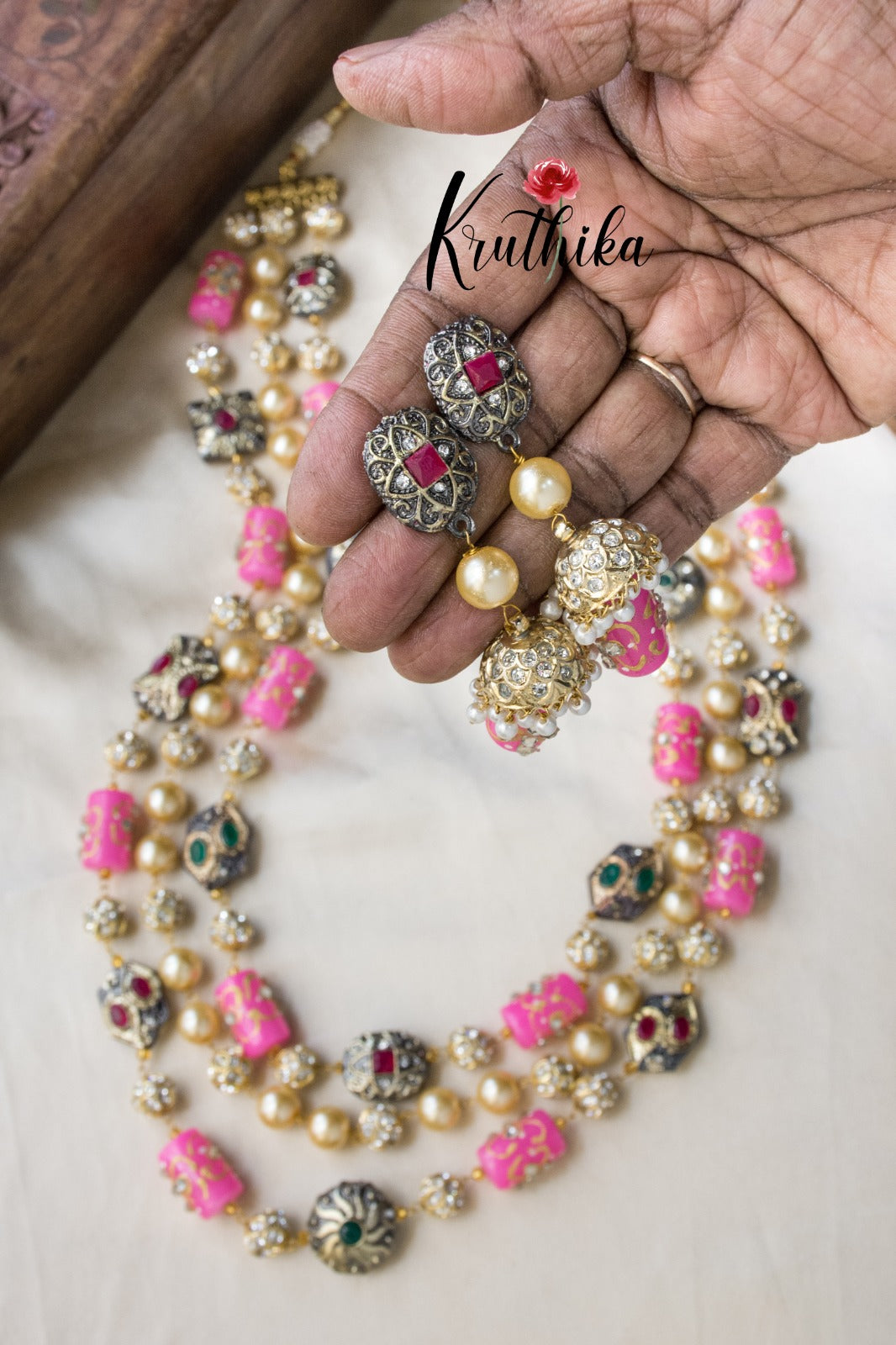 Enhance your style with our stunning 3 lines beads Haaram with earrings, paired perfectly with matching earrings. Crafted with high-quality stones & beads, this set combines timeless elegance with a modern touch. Ideal for special occasions or adding a touch of glamour to your look.