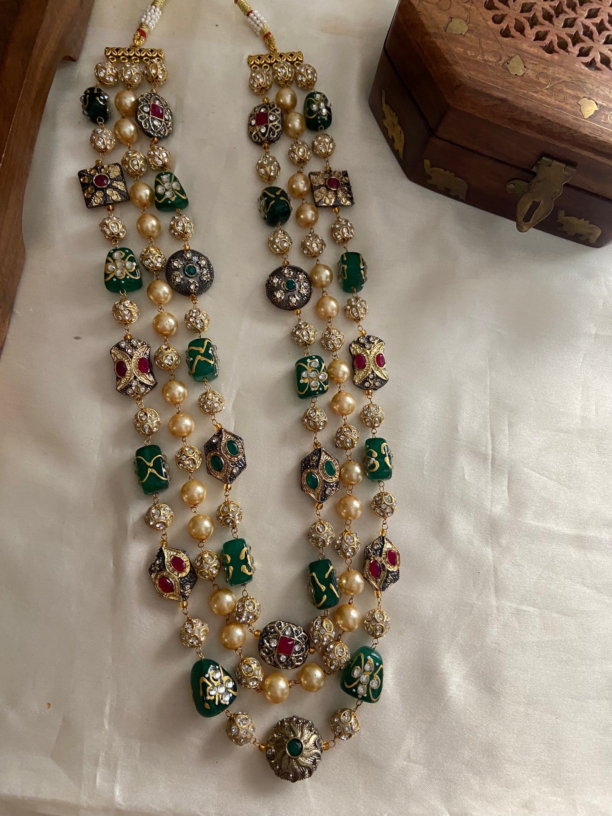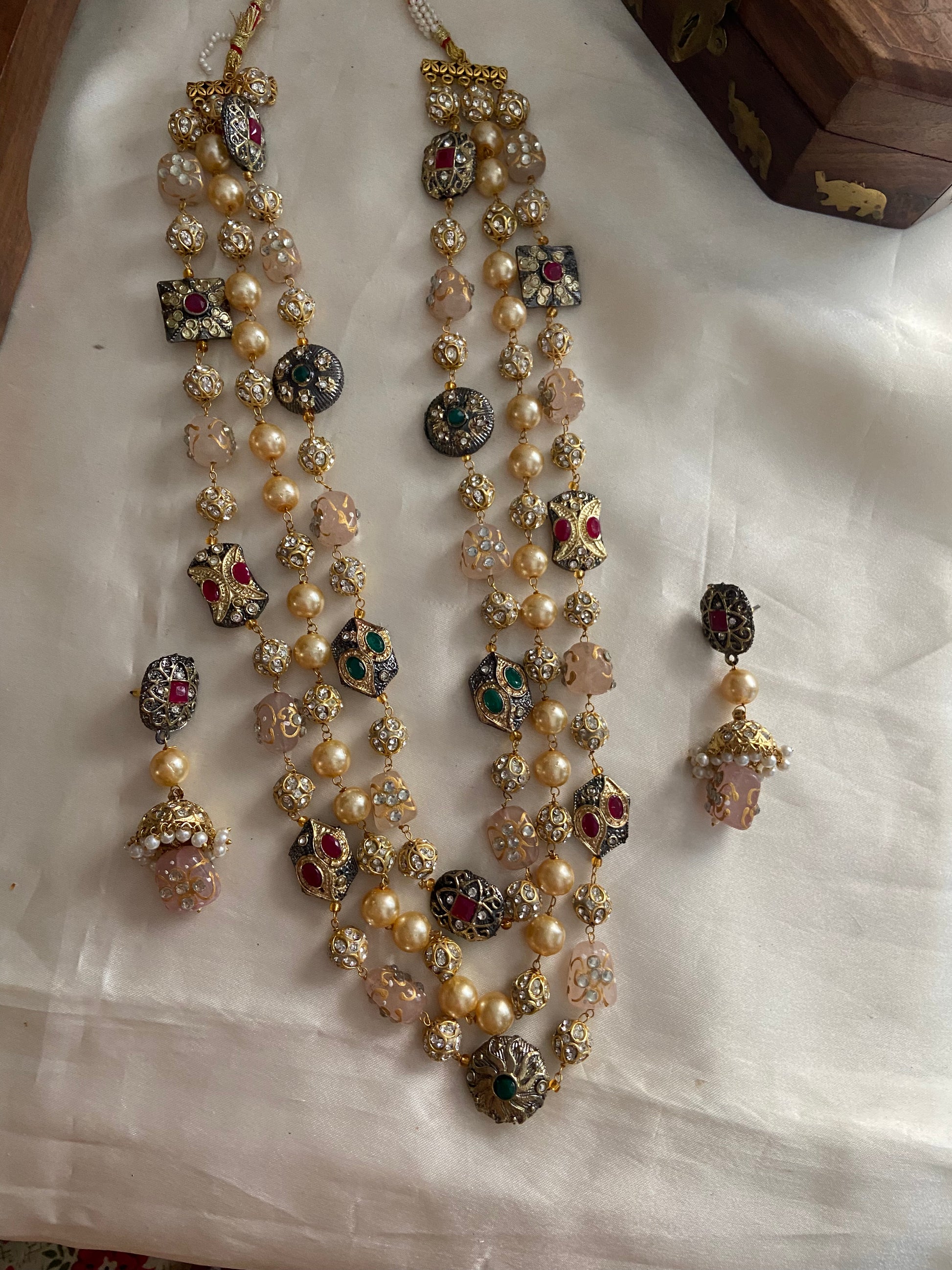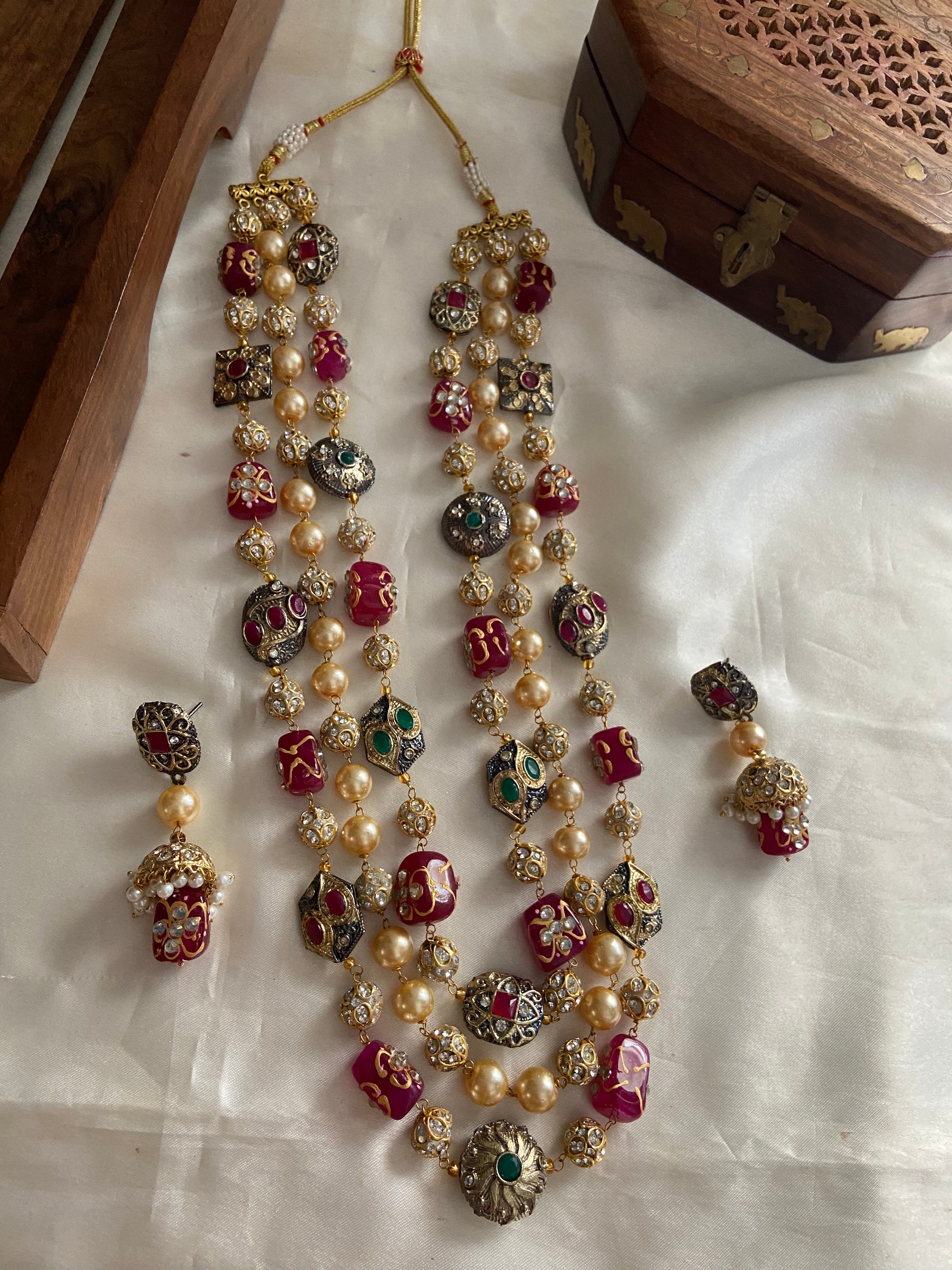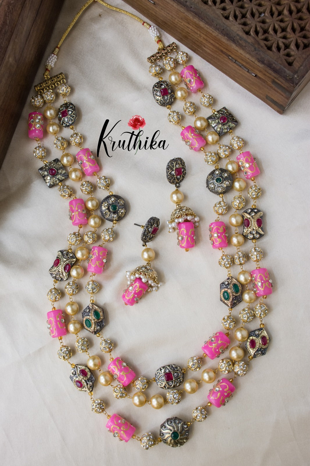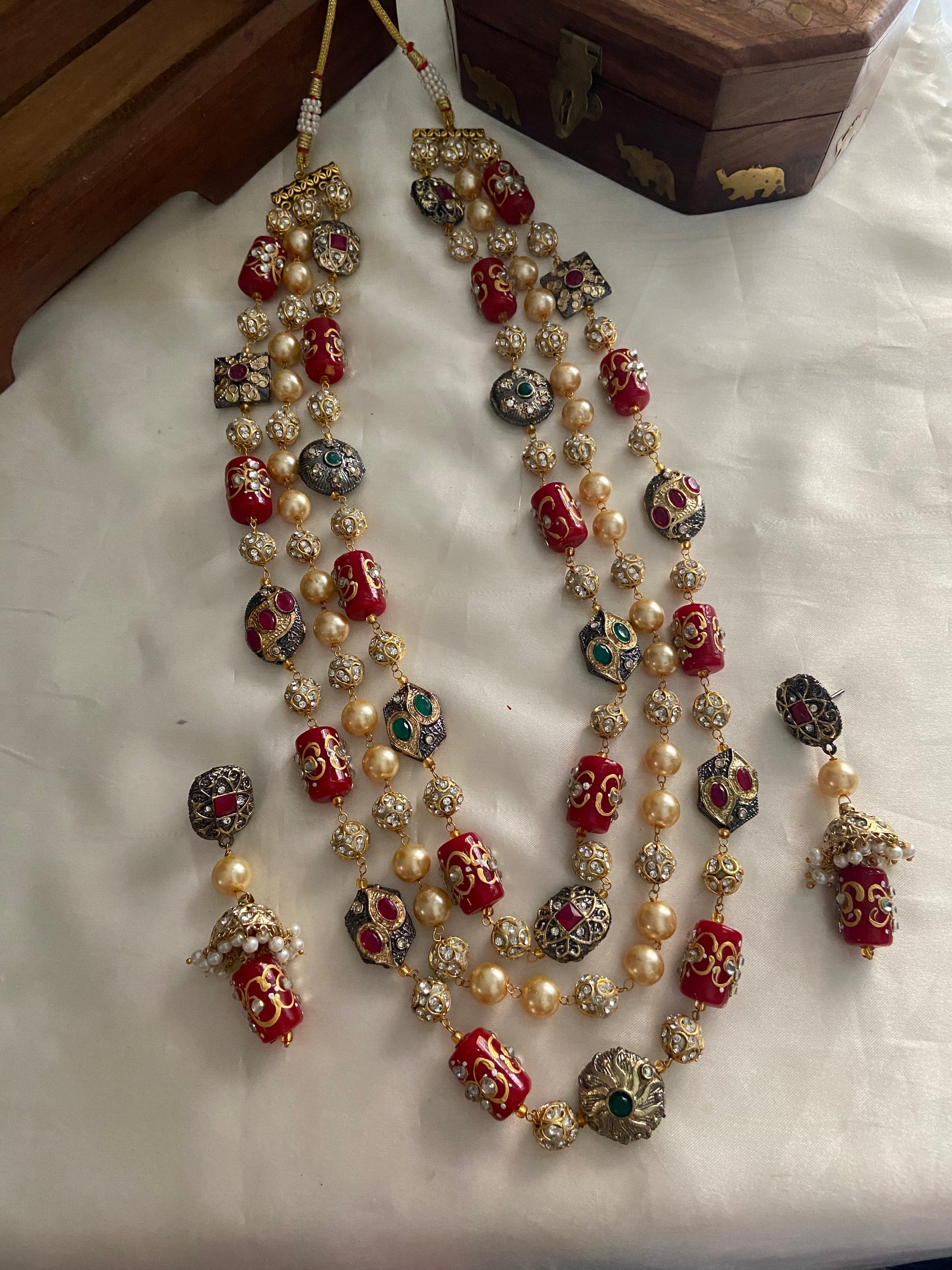 Enhance your style with our stunning 3 lines beads Haaram with earrings, paired perfectly with matching earrings. Crafted with high-quality stones & beads, this set combines timeless elegance with a modern touch. Ideal for special occasions or adding a touch of glamour to your look.