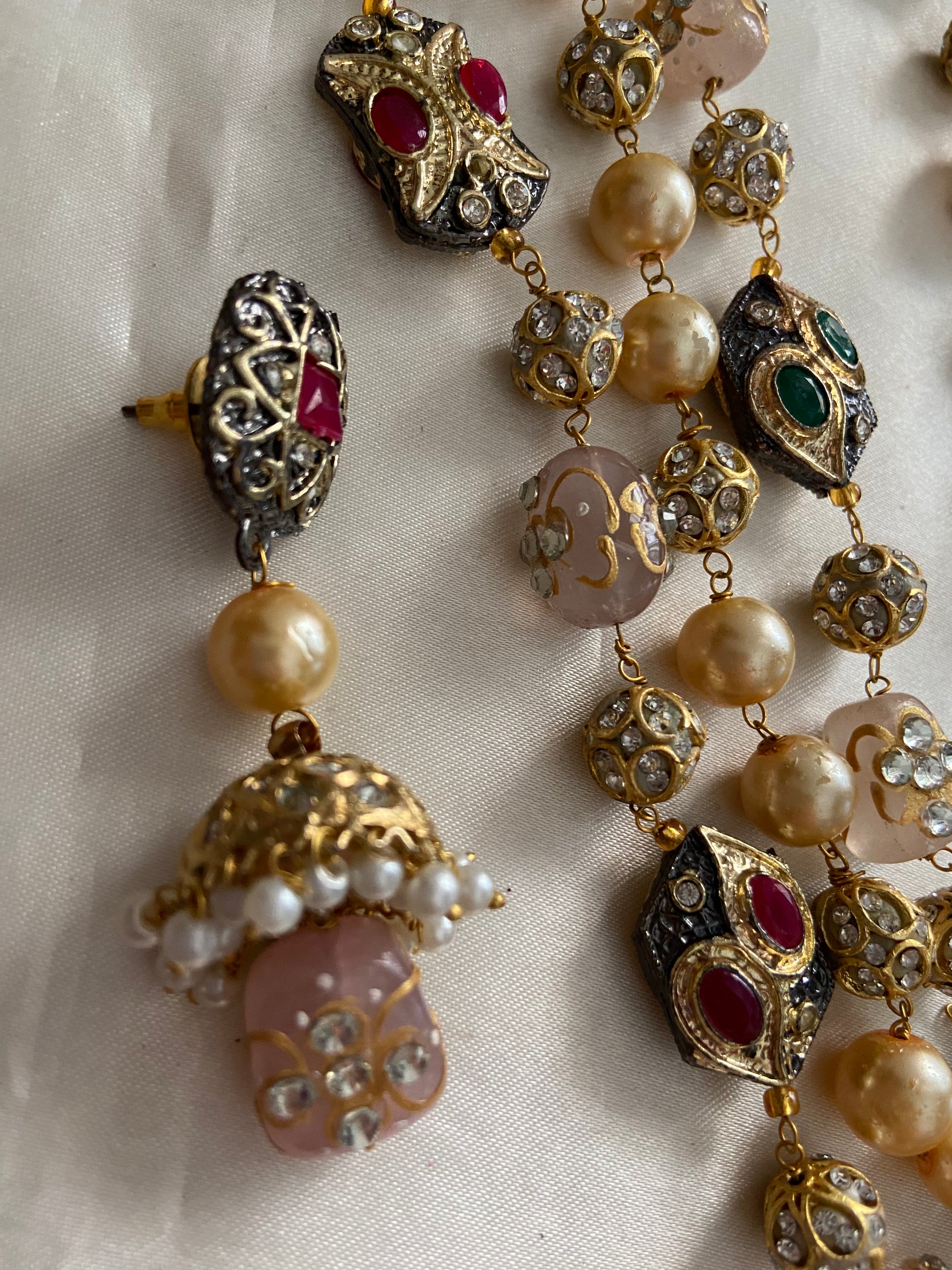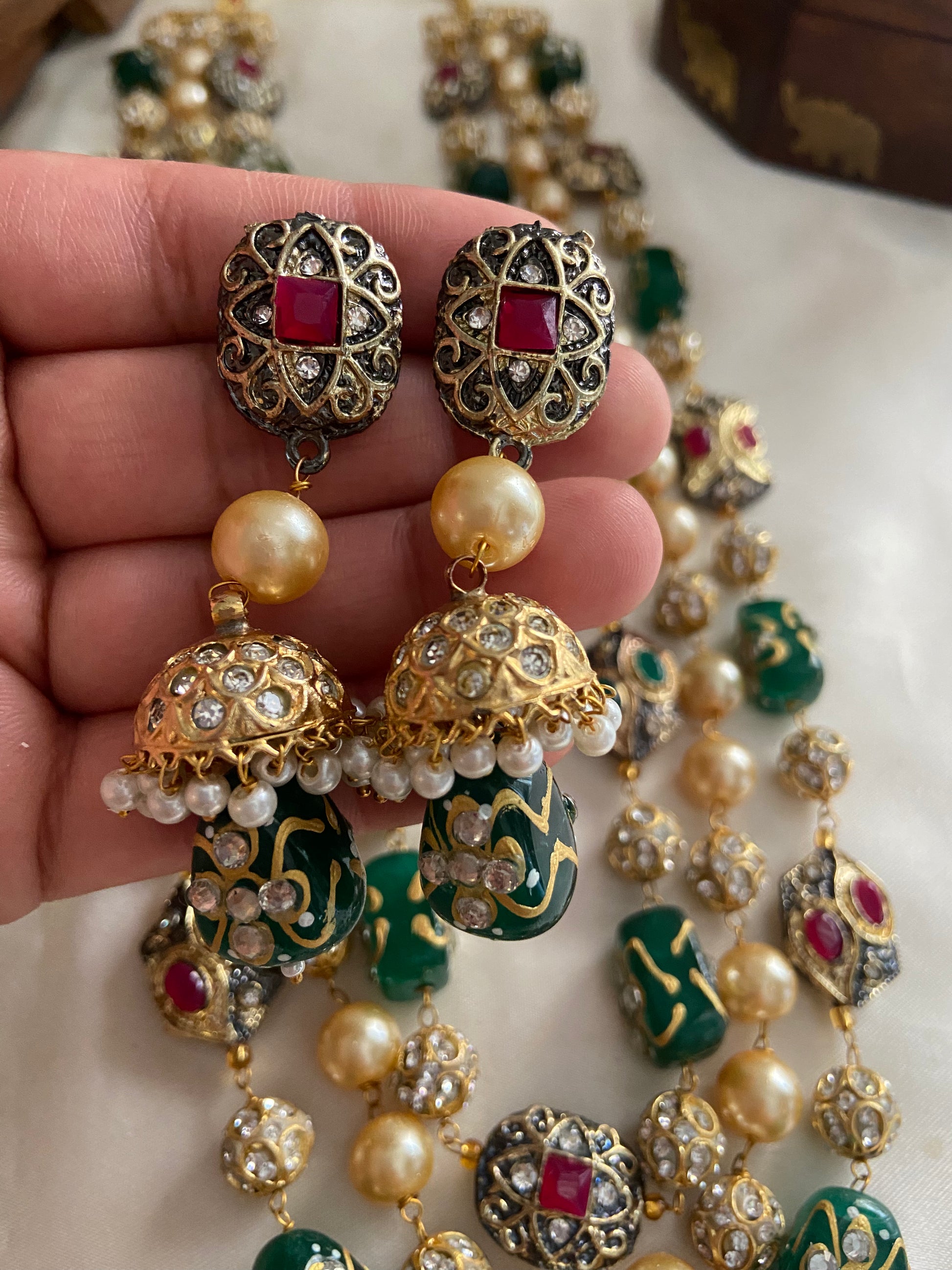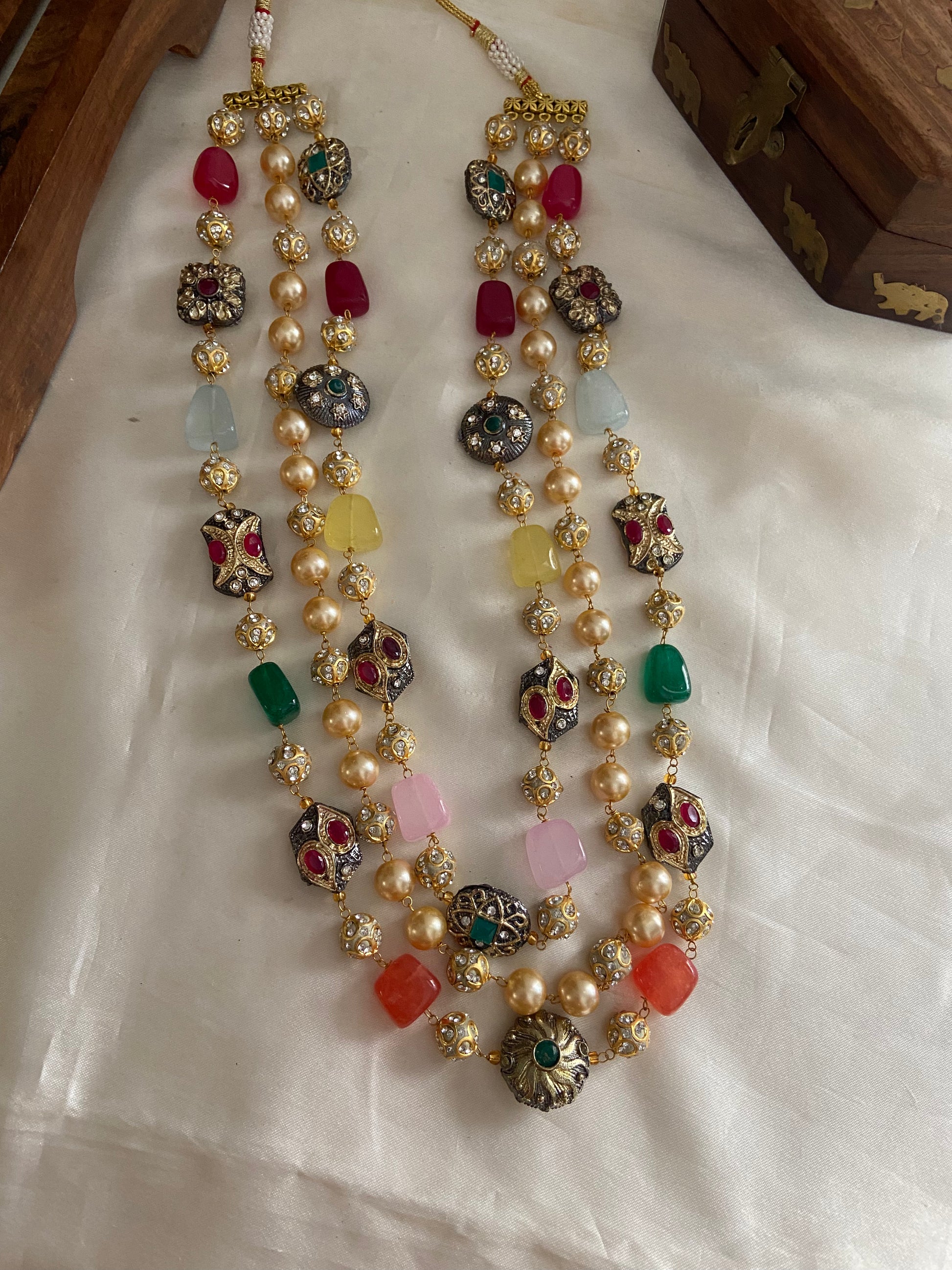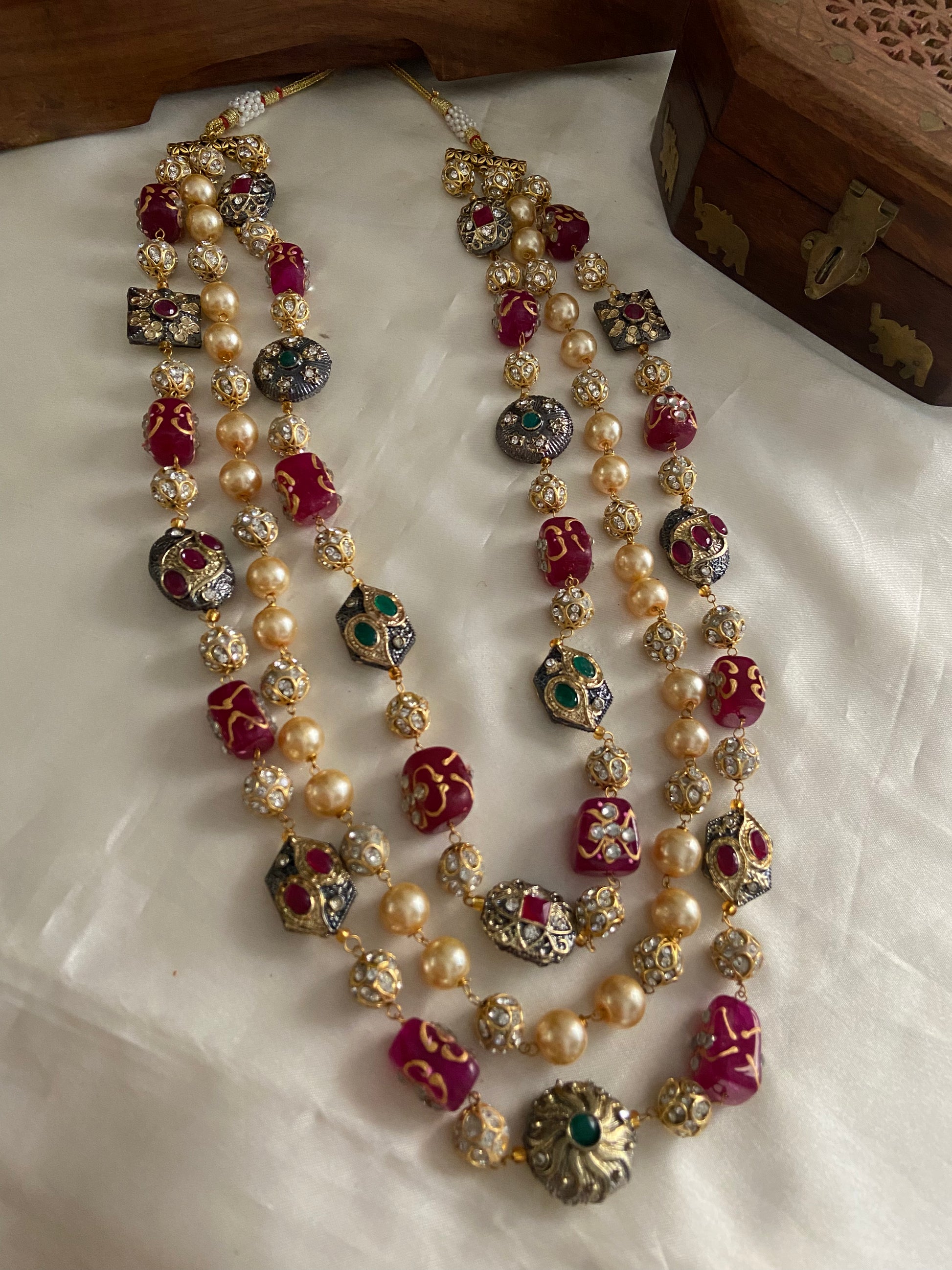 Enhance your style with our stunning 3 lines beads Haaram with earrings, paired perfectly with matching earrings. Crafted with high-quality stones & beads, this set combines timeless elegance with a modern touch. Ideal for special occasions or adding a touch of glamour to your look.