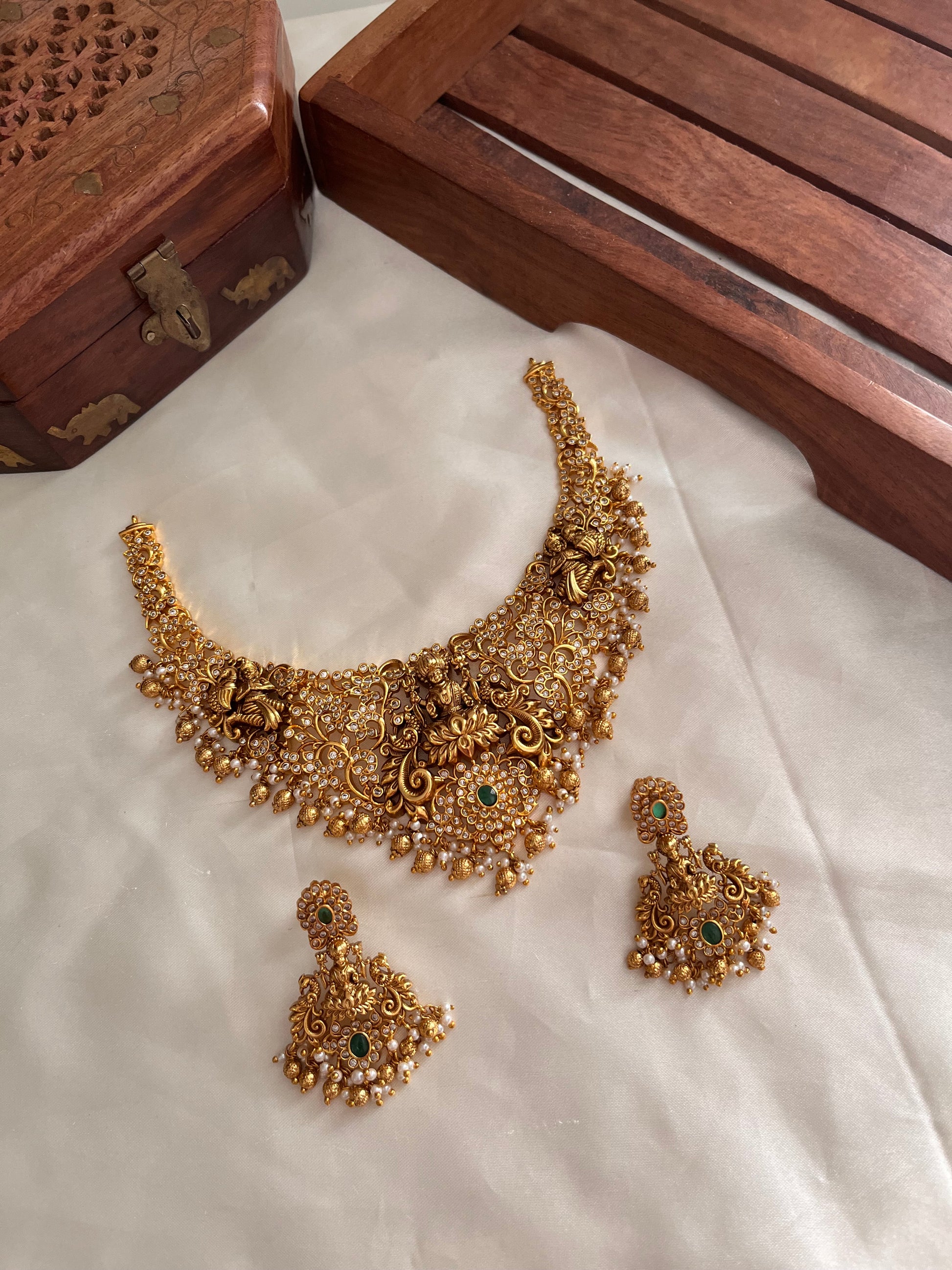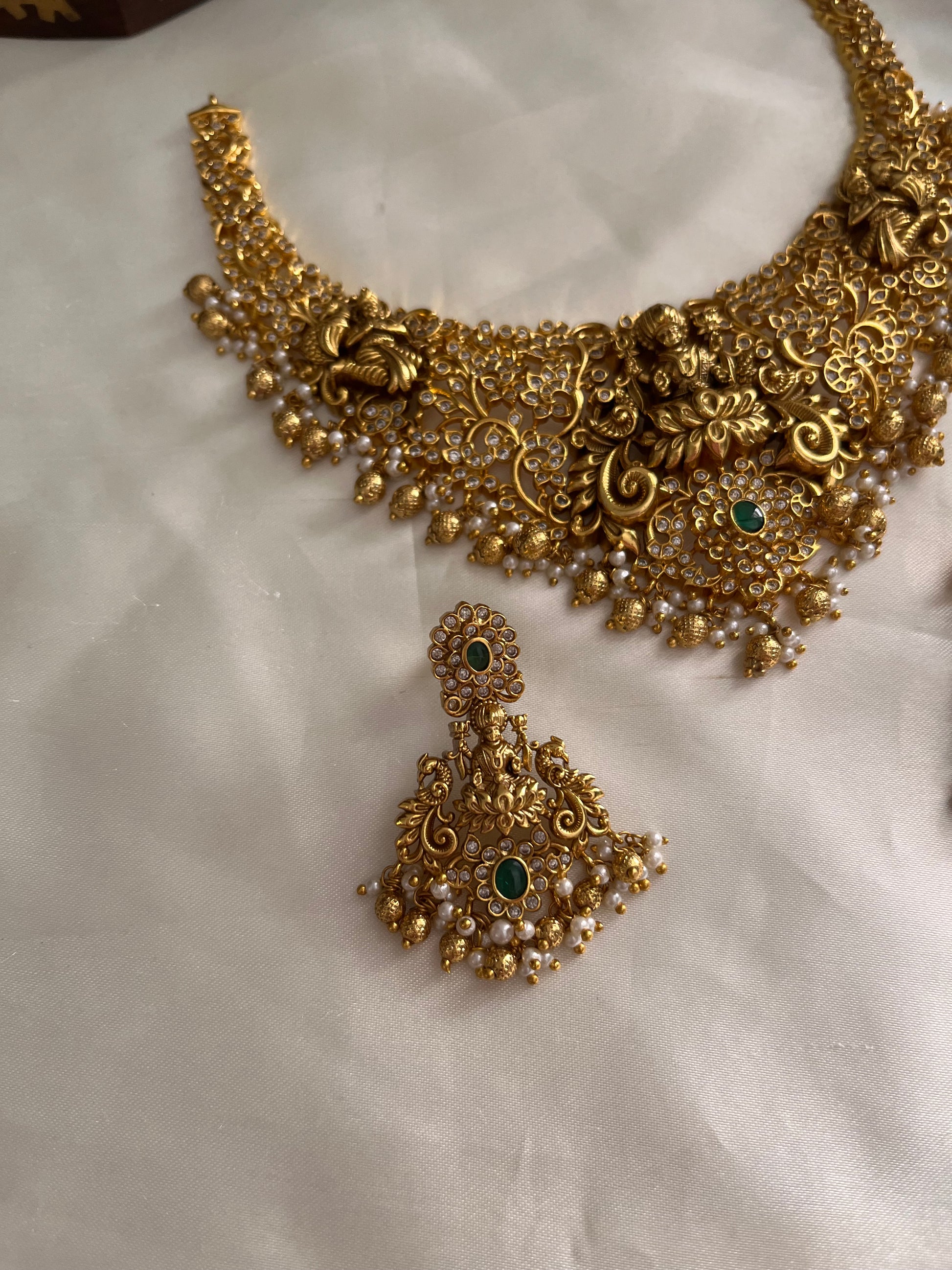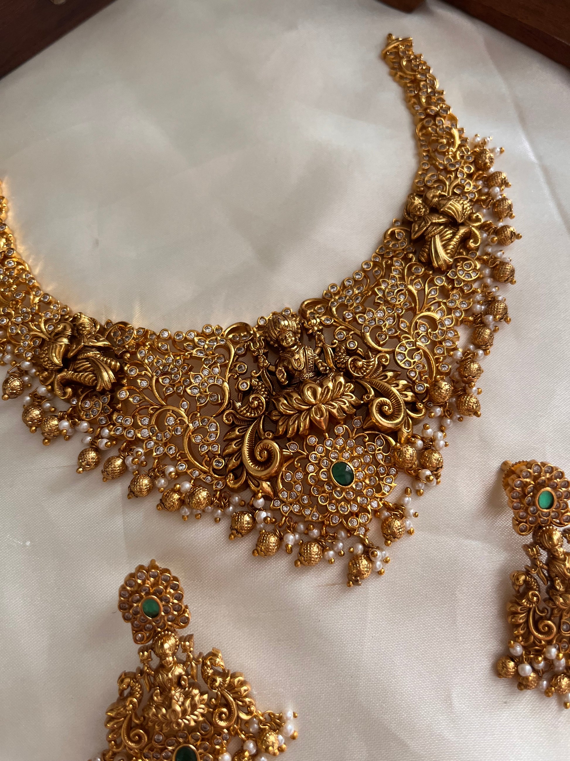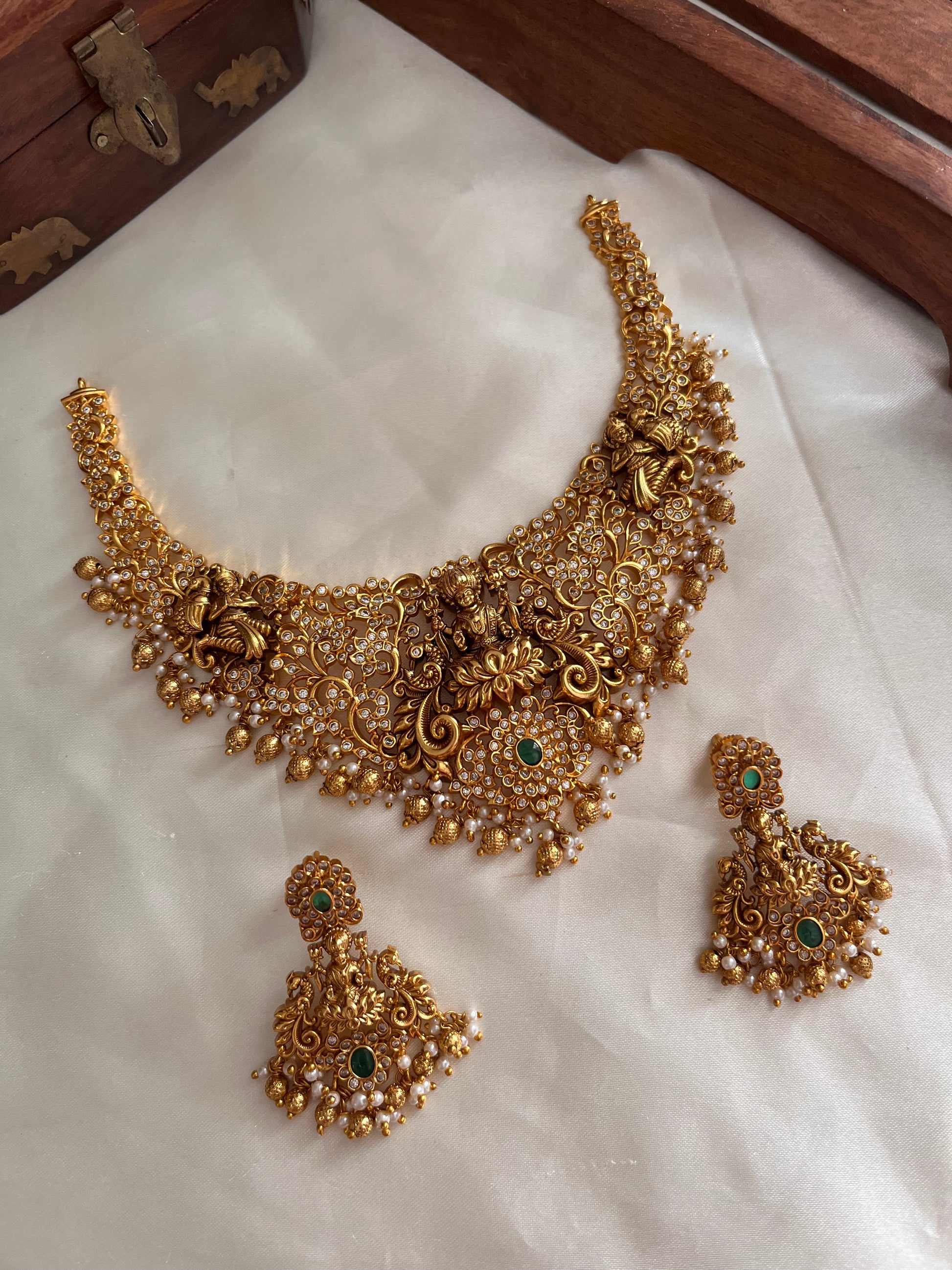 Enhance your style with our stunning AD cutwork Lakshmi necklace, paired perfectly with matching earrings. Crafted with high-quality stones & beads, this set combines timeless elegance with a modern touch. Ideal for special occasions or adding a touch of glamour to your look.