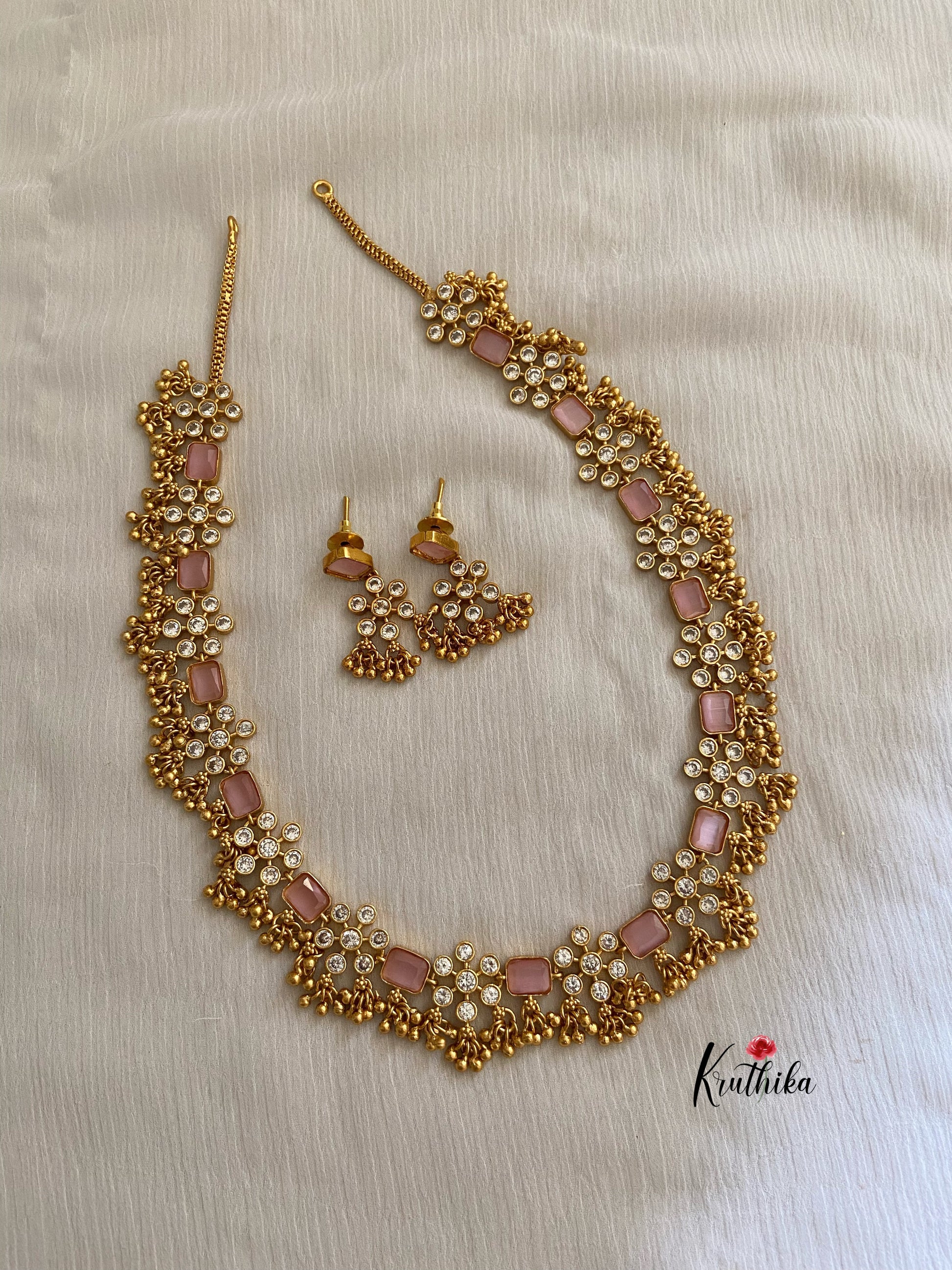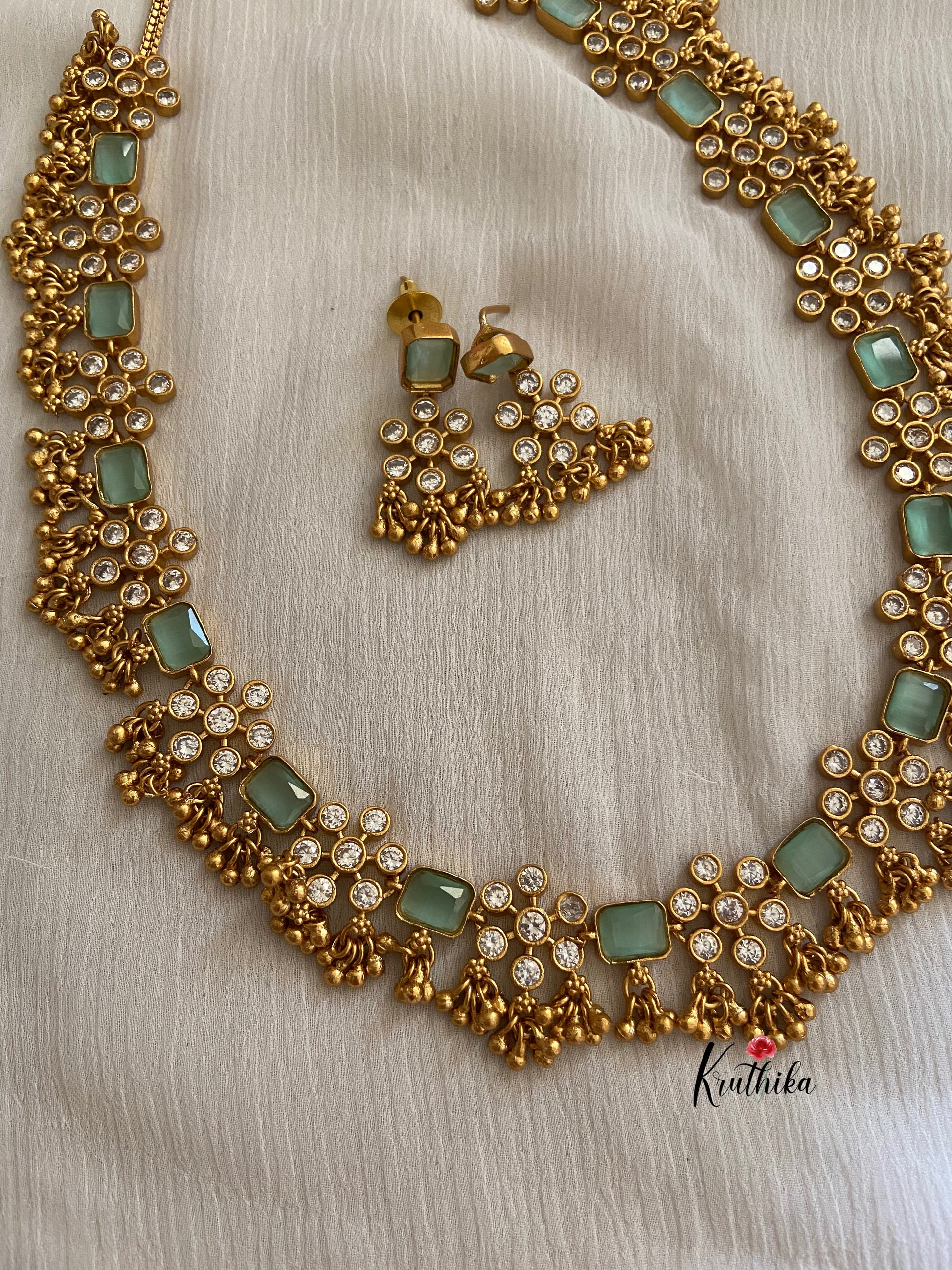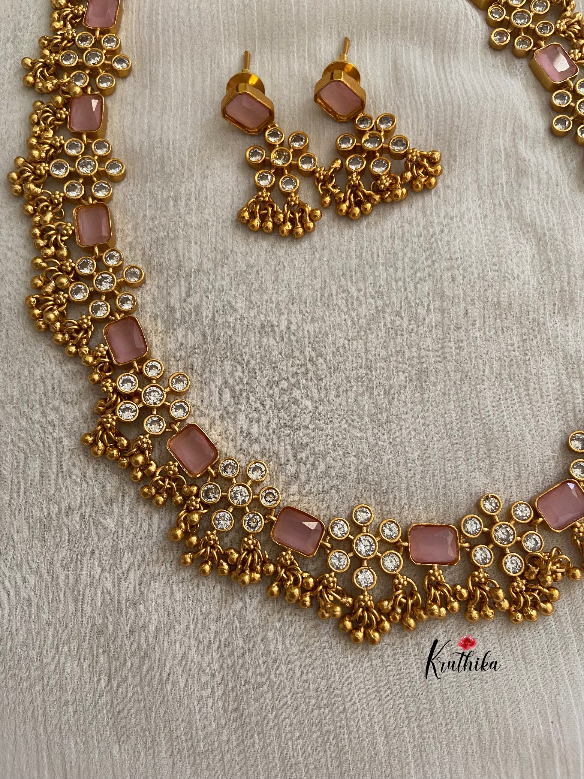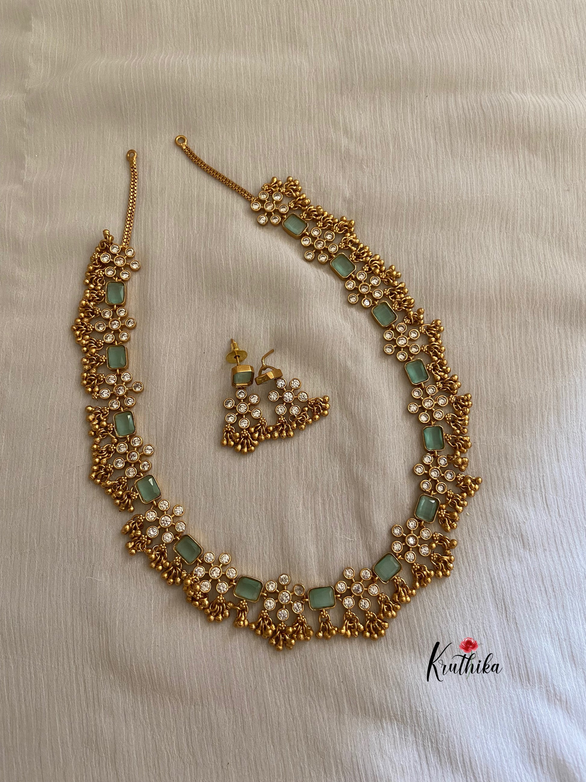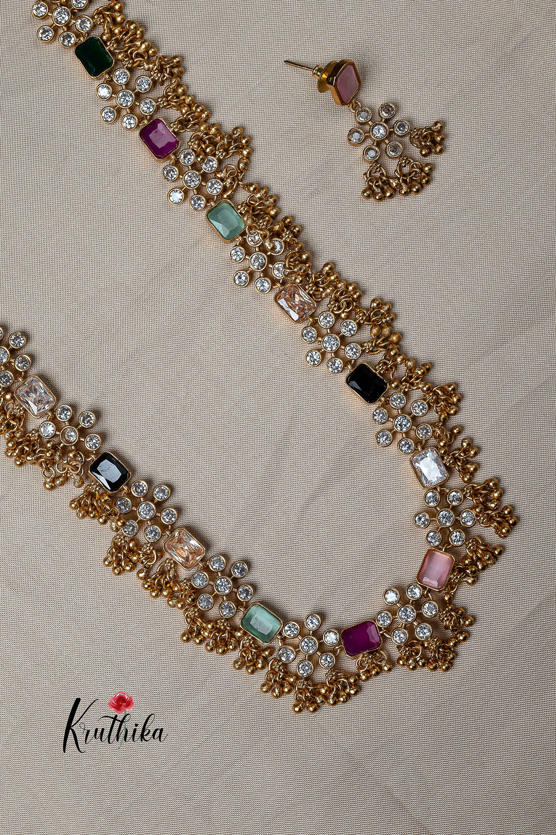 Enhance your style with our stunning AD ghunghroo Guttapoosalu Haaram, paired perfectly with matching earrings. Crafted with high-quality stones & beads, this set combines timeless elegance with a modern touch. Ideal for special occasions or adding a touch of glamour to your look.