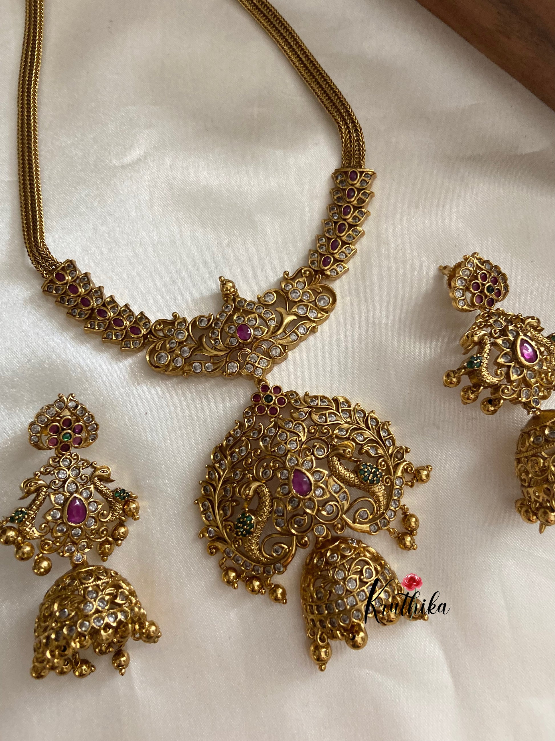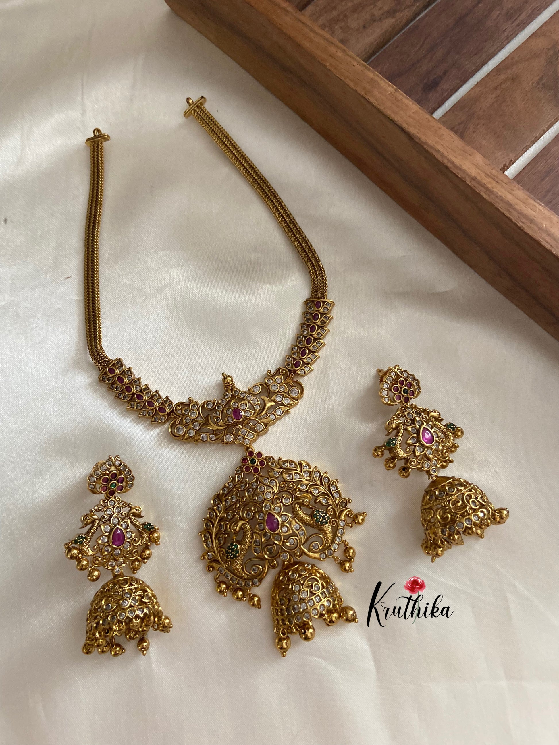 Enhance your style with our stunning AD peacock Chain Necklace, paired perfectly with matching earrings. Crafted with high-quality stones & beads, this set combines timeless elegance with a modern touch. Ideal for special occasions or adding a touch of glamour to your look.