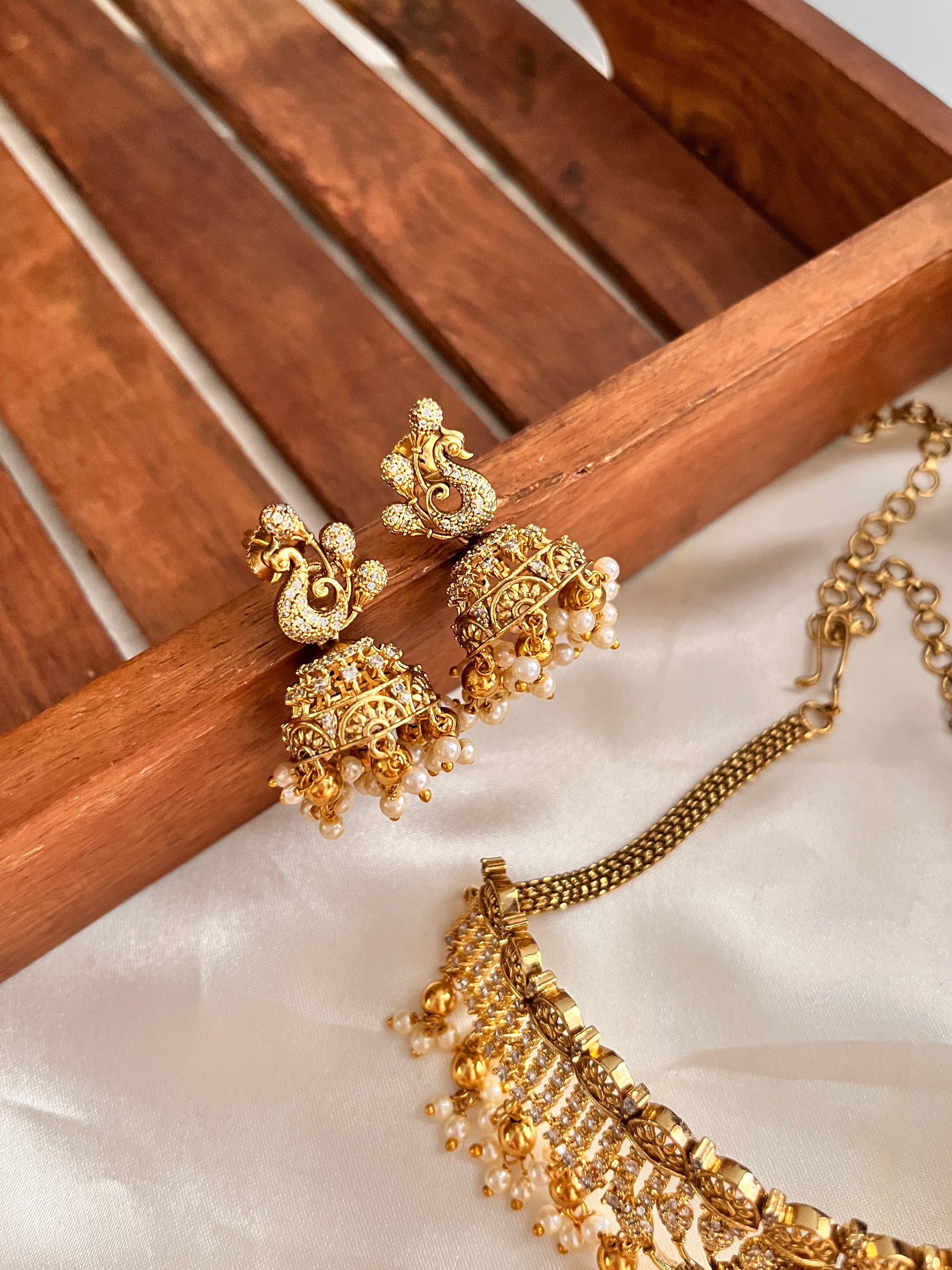 Enhance your style with our stunning AD peacock guttapoosalu choker Necklace, paired perfectly with matching earrings. Crafted with high-quality stones & beads, this set combines timeless elegance with a modern touch. Ideal for special occasions or adding a touch of glamour to your look.