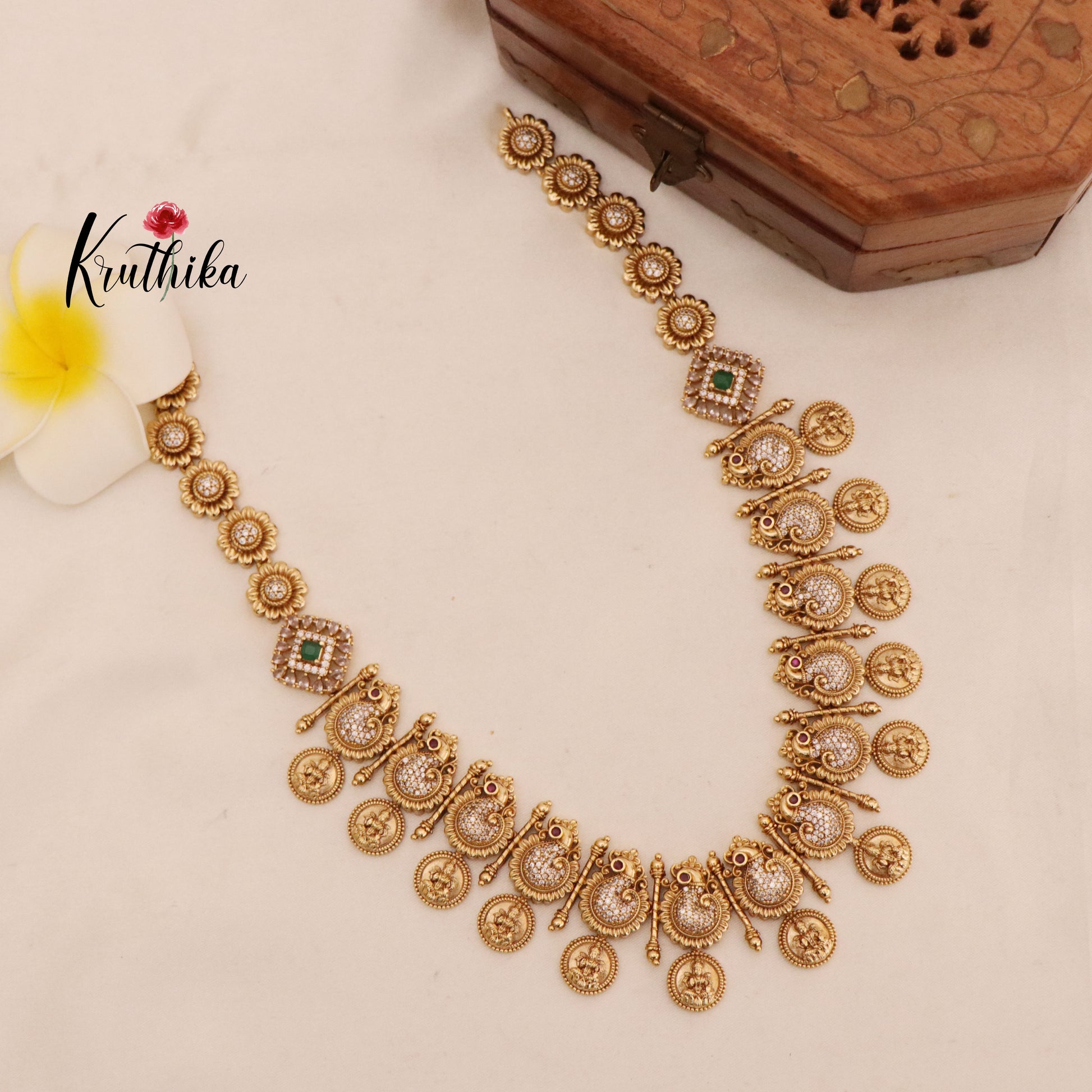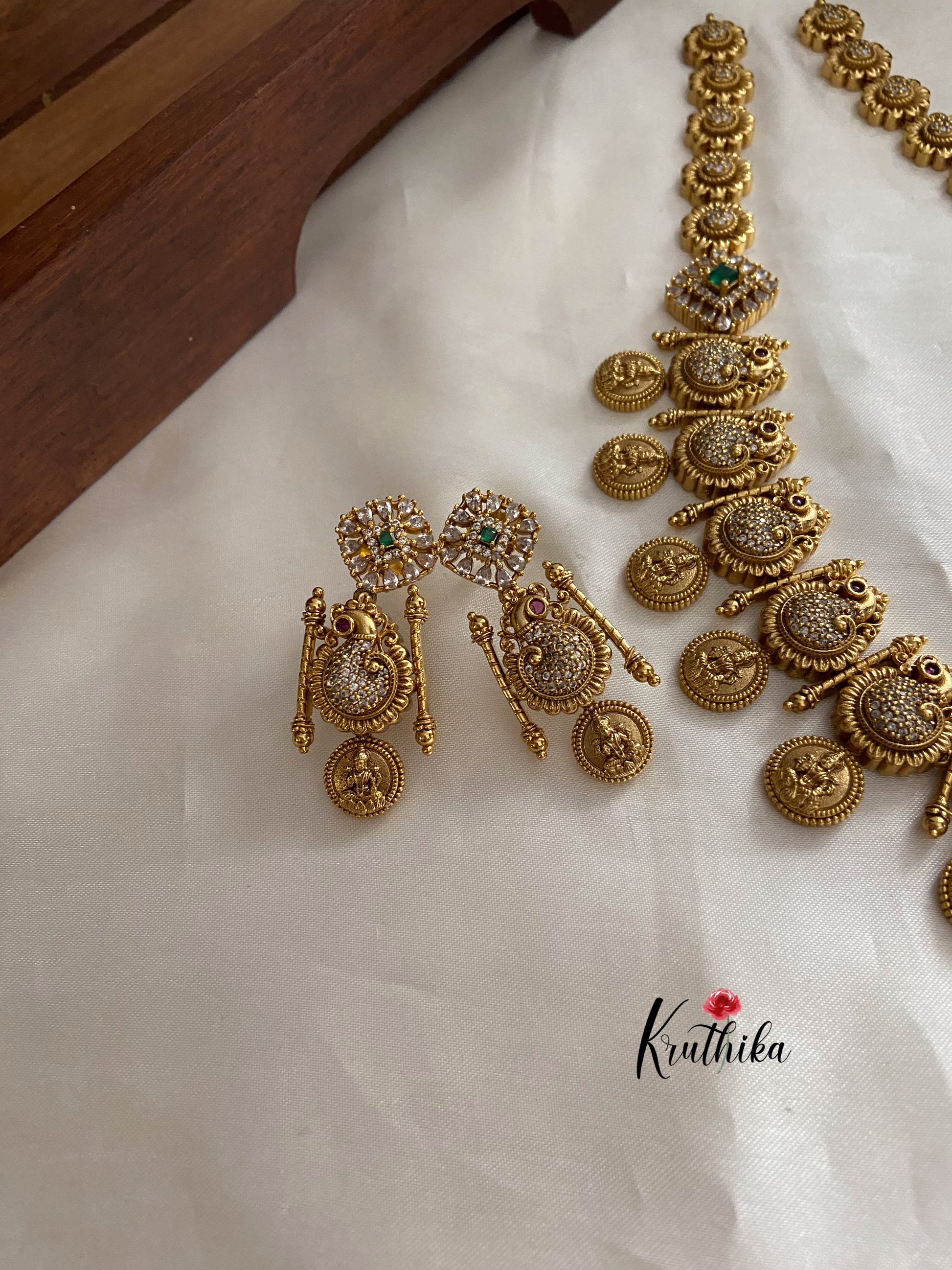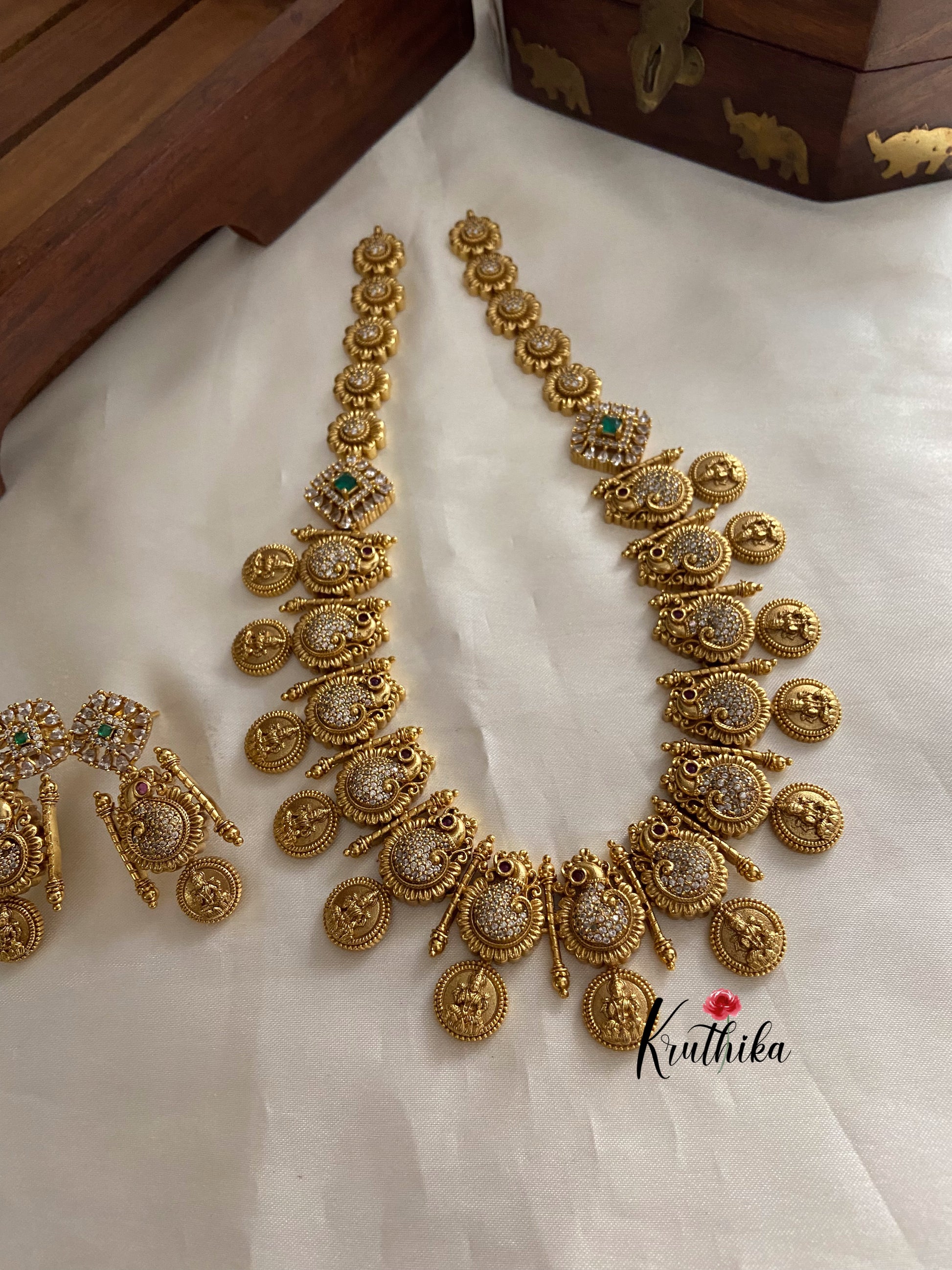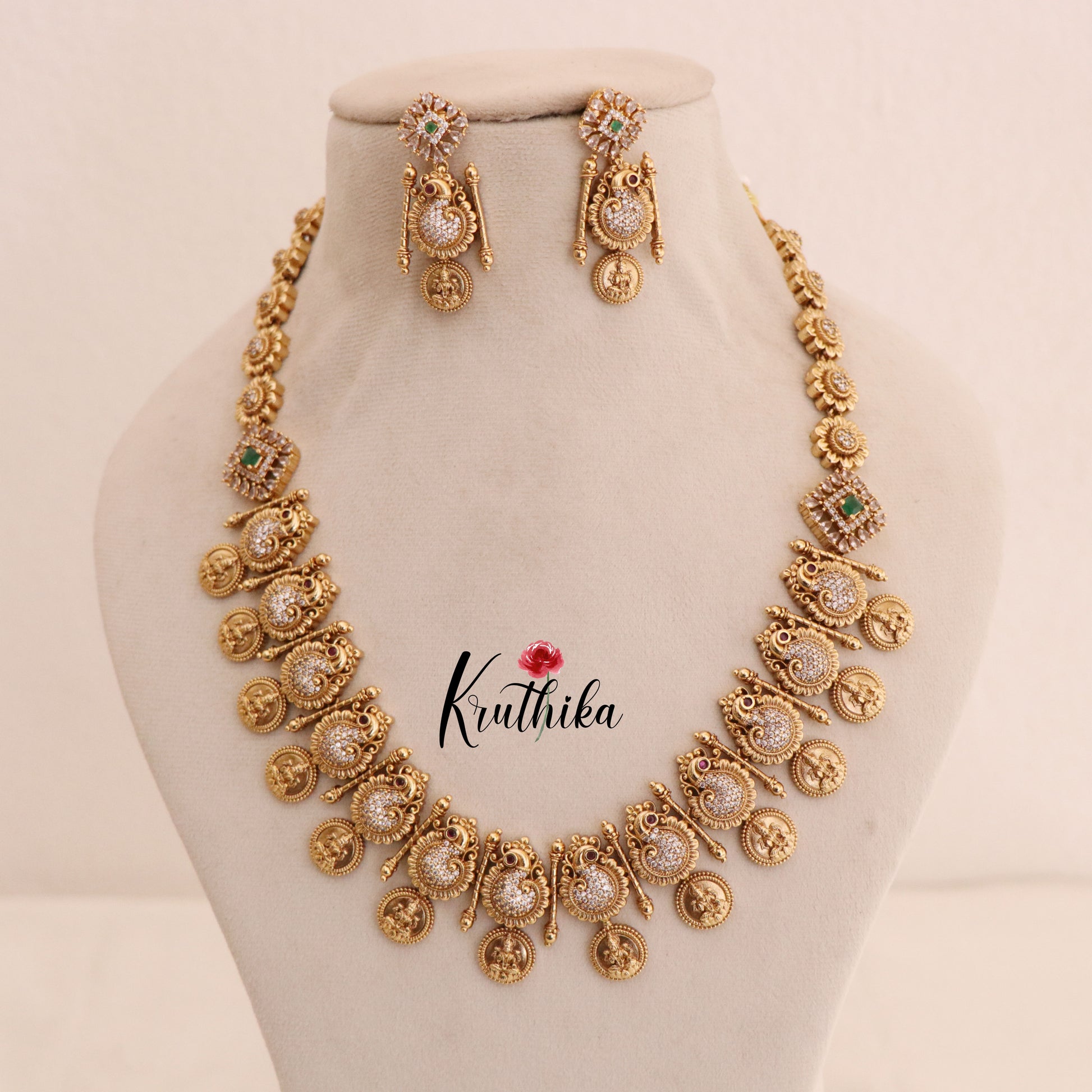 Enhance your style with our stunning AD peacock kasu Haaram, paired perfectly with matching earrings. Crafted with high-quality stones & beads, this set combines timeless elegance with a modern touch. Ideal for special occasions or adding a touch of glamour to your look.