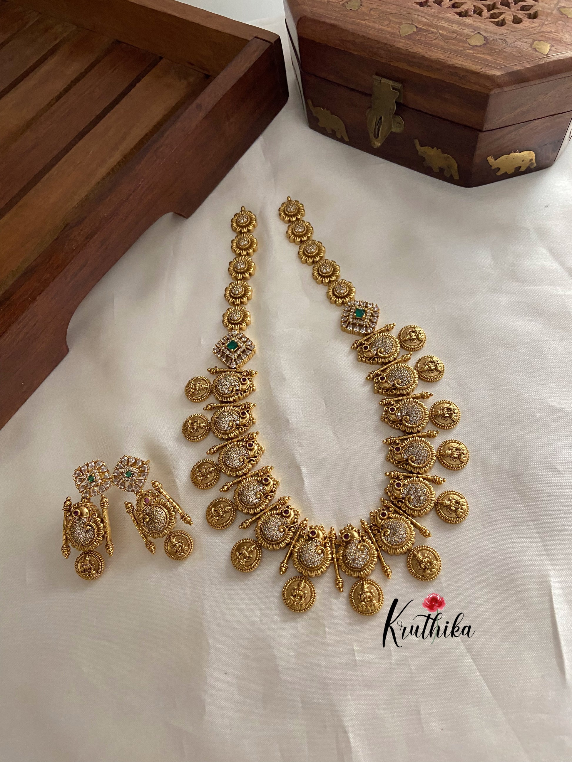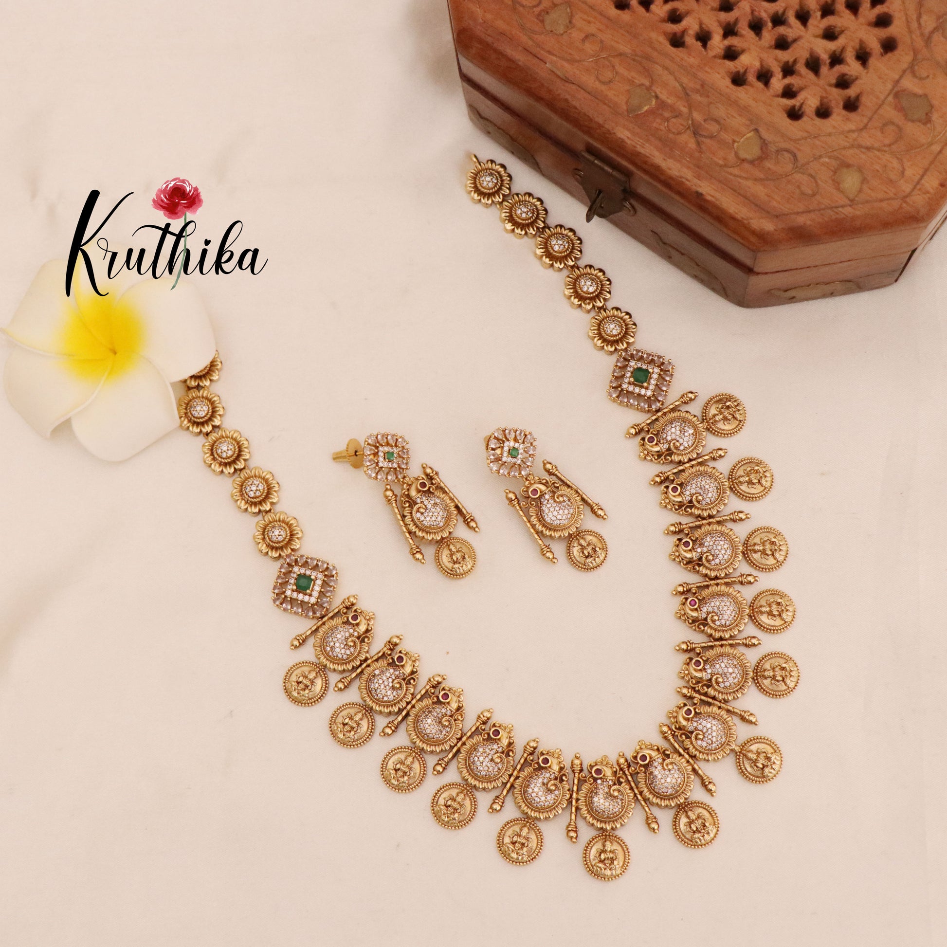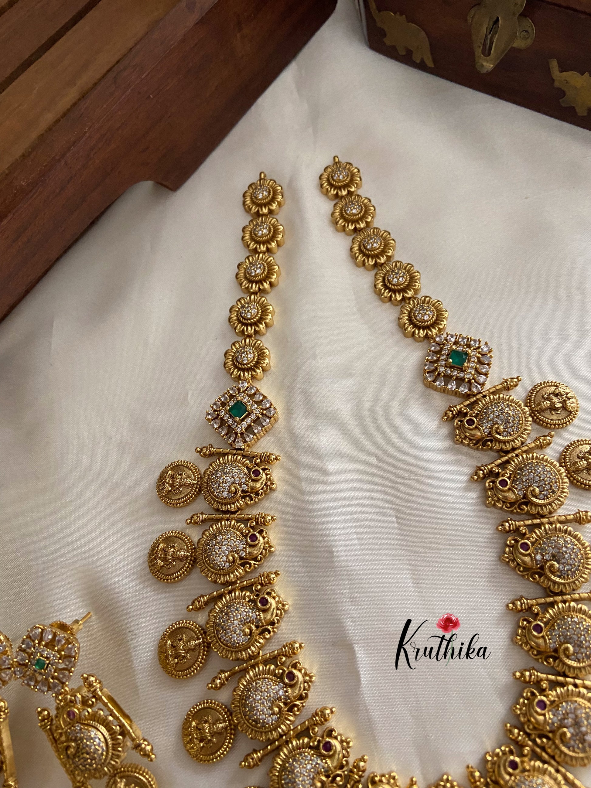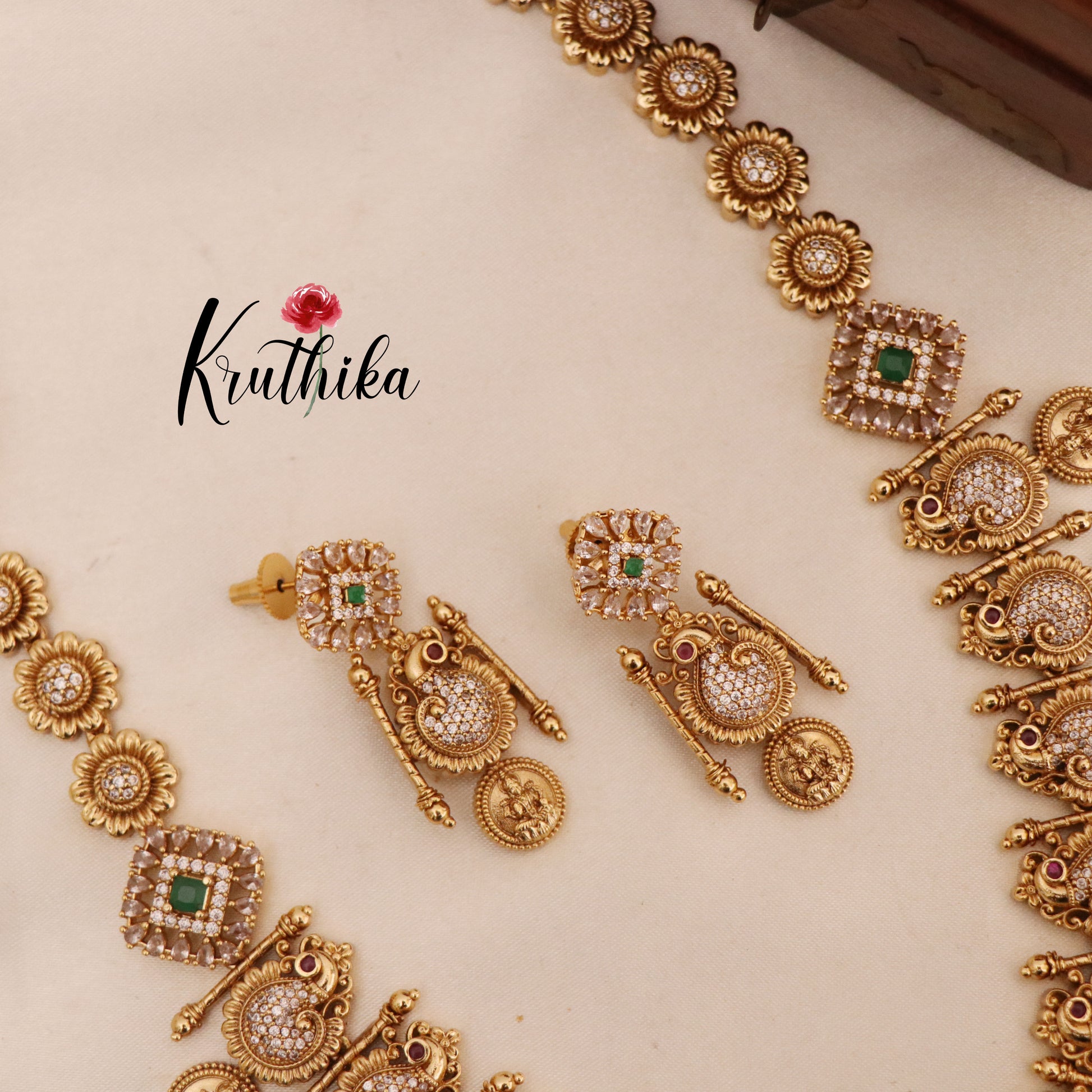 Enhance your style with our stunning AD peacock kasu Haaram, paired perfectly with matching earrings. Crafted with high-quality stones & beads, this set combines timeless elegance with a modern touch. Ideal for special occasions or adding a touch of glamour to your look.