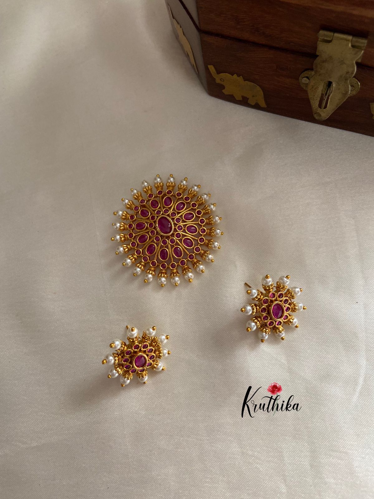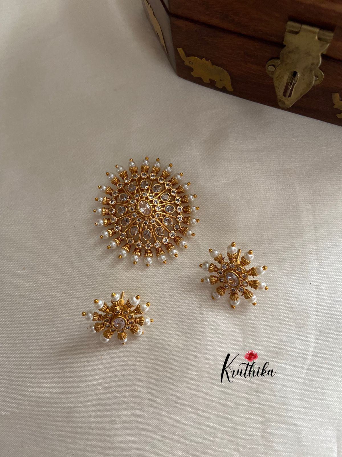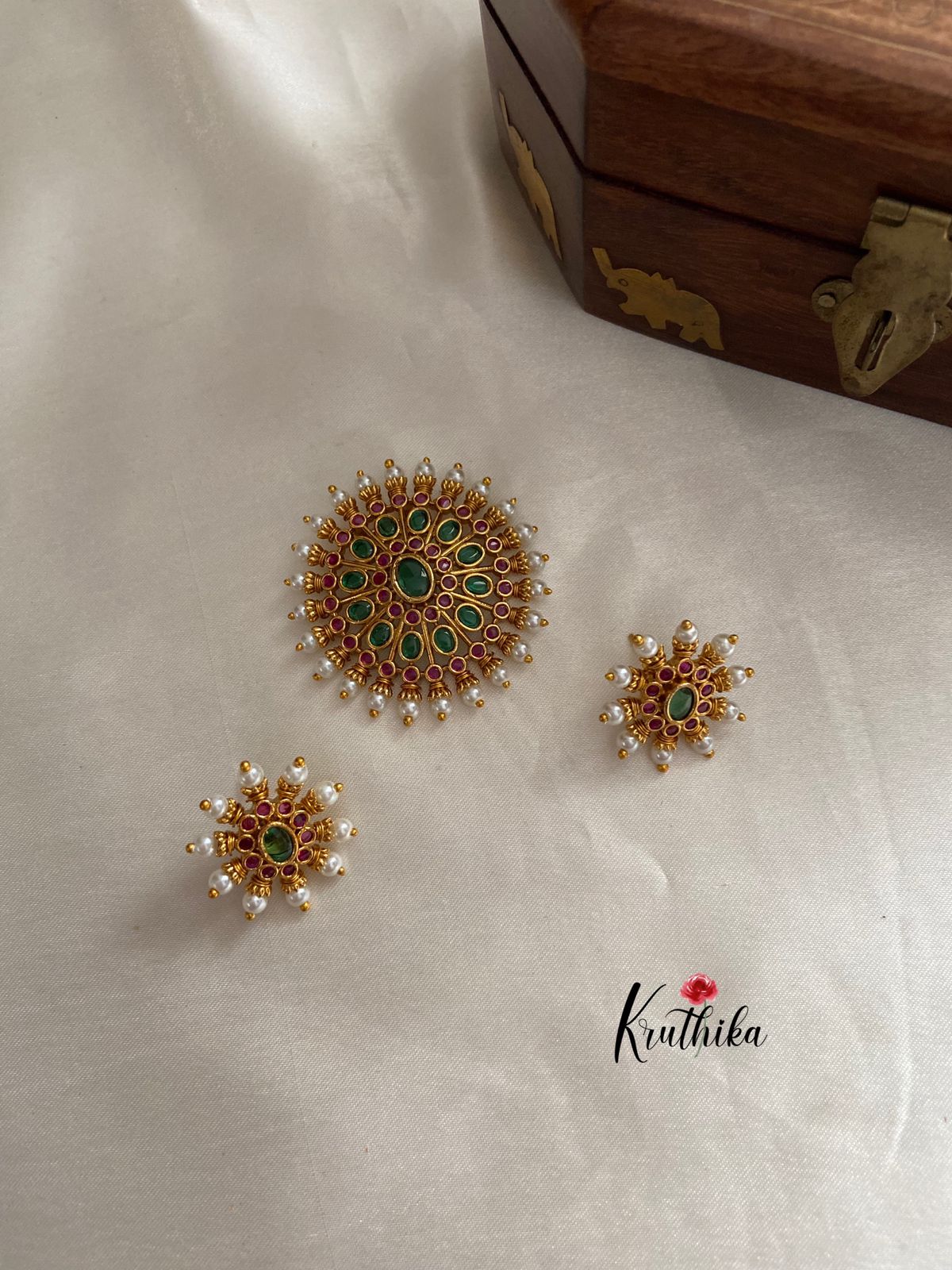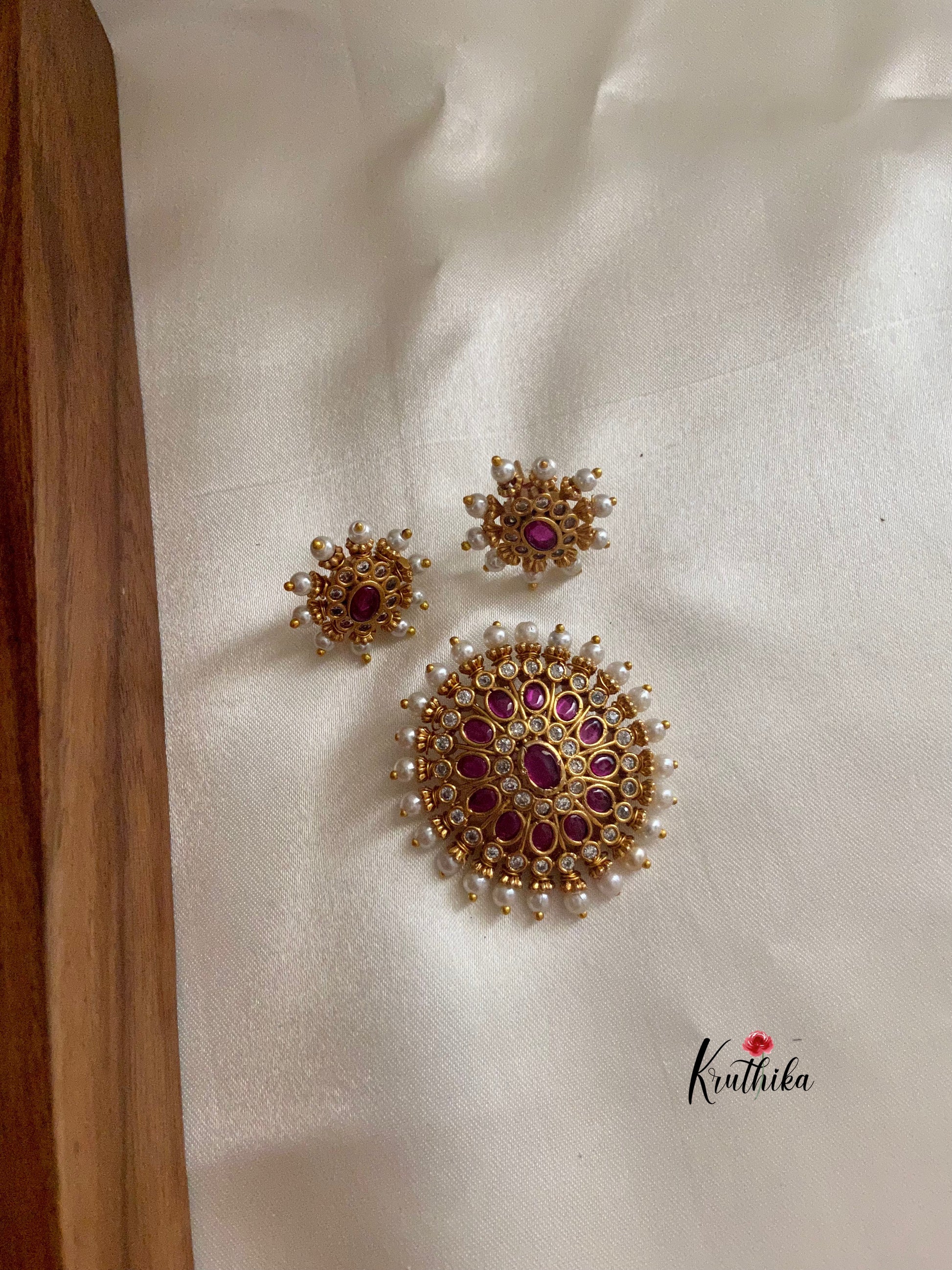 Enhance your style with our stunning AD pearl pendant set, paired perfectly with matching earrings. Crafted with high-quality stones & beads, this set combines timeless elegance with a modern touch. Ideal for special occasions or adding a touch of glamour to your look.
