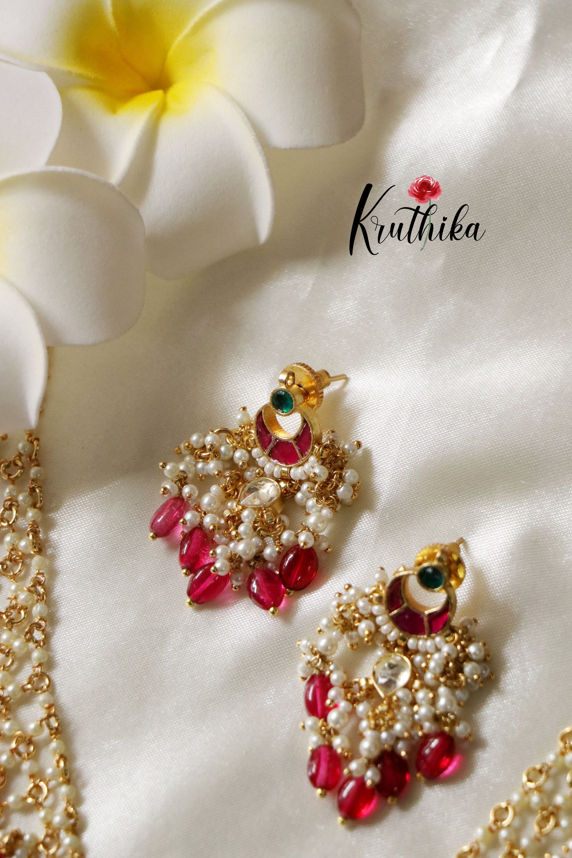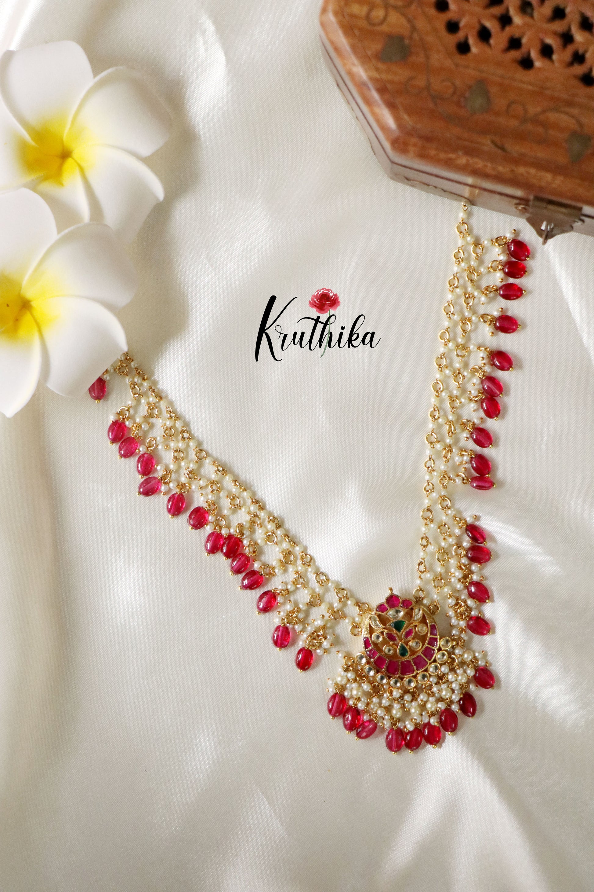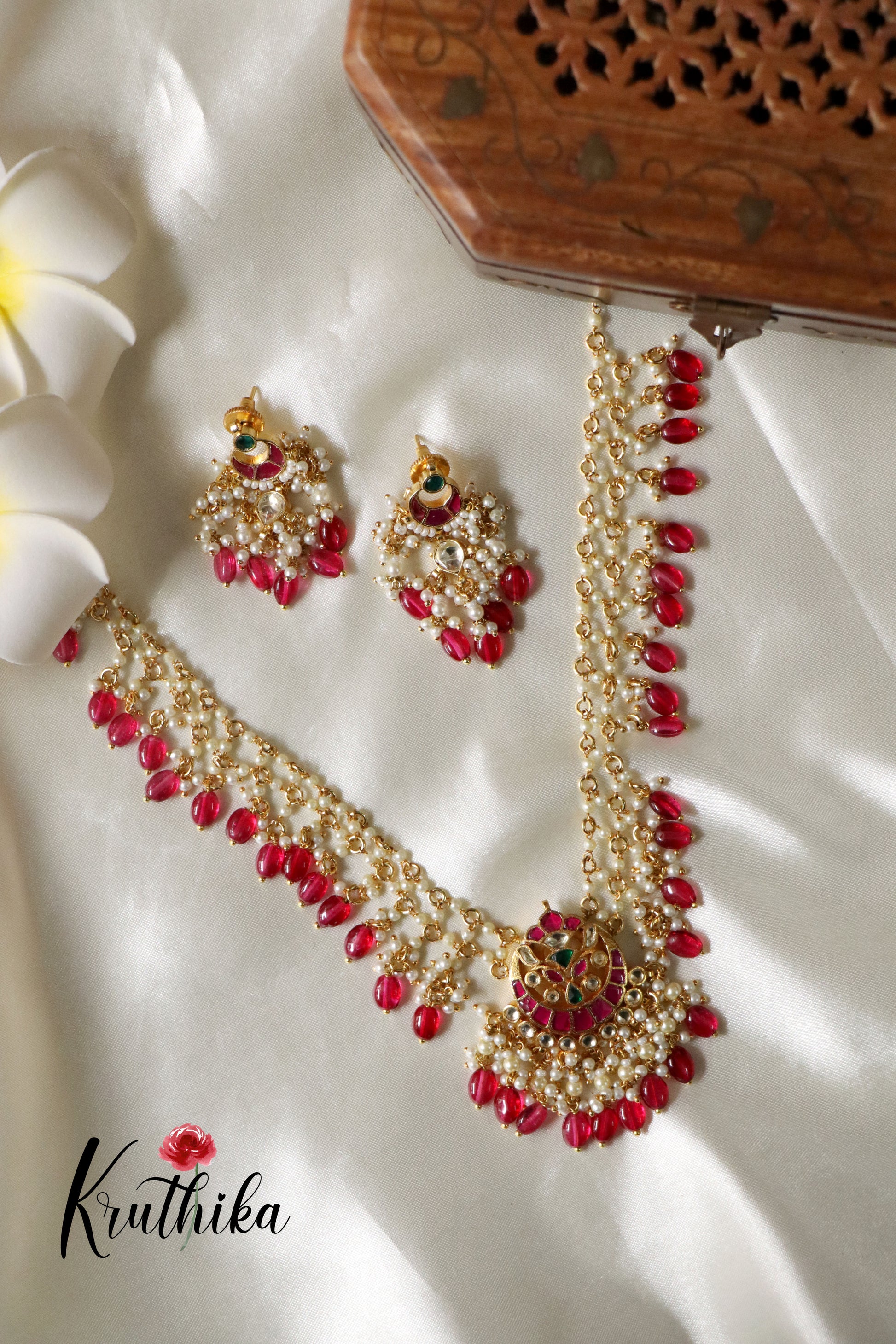 Enhance your style with our stunning Ahemdabadi Jadau Kudan Necklace, paired perfectly with matching earrings. Crafted with high-quality stones & beads, this set combines timeless elegance with a modern touch. Ideal for special occasions or adding a touch of glamour to your look.
