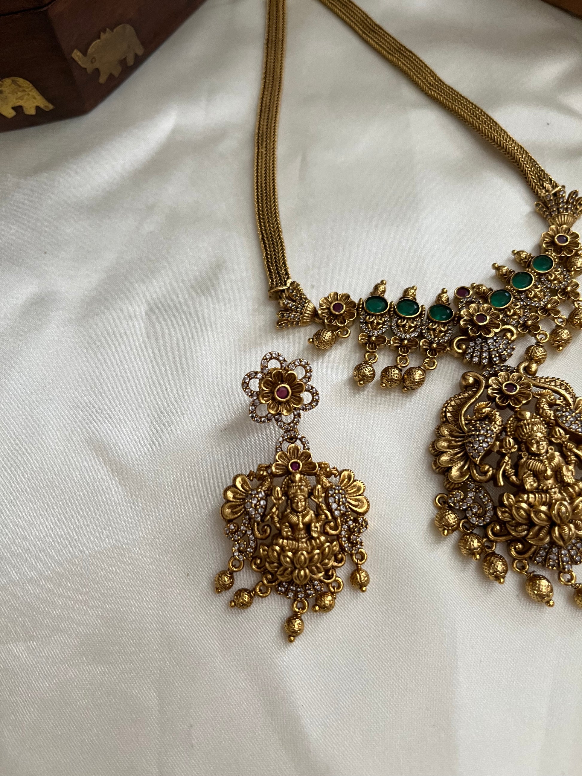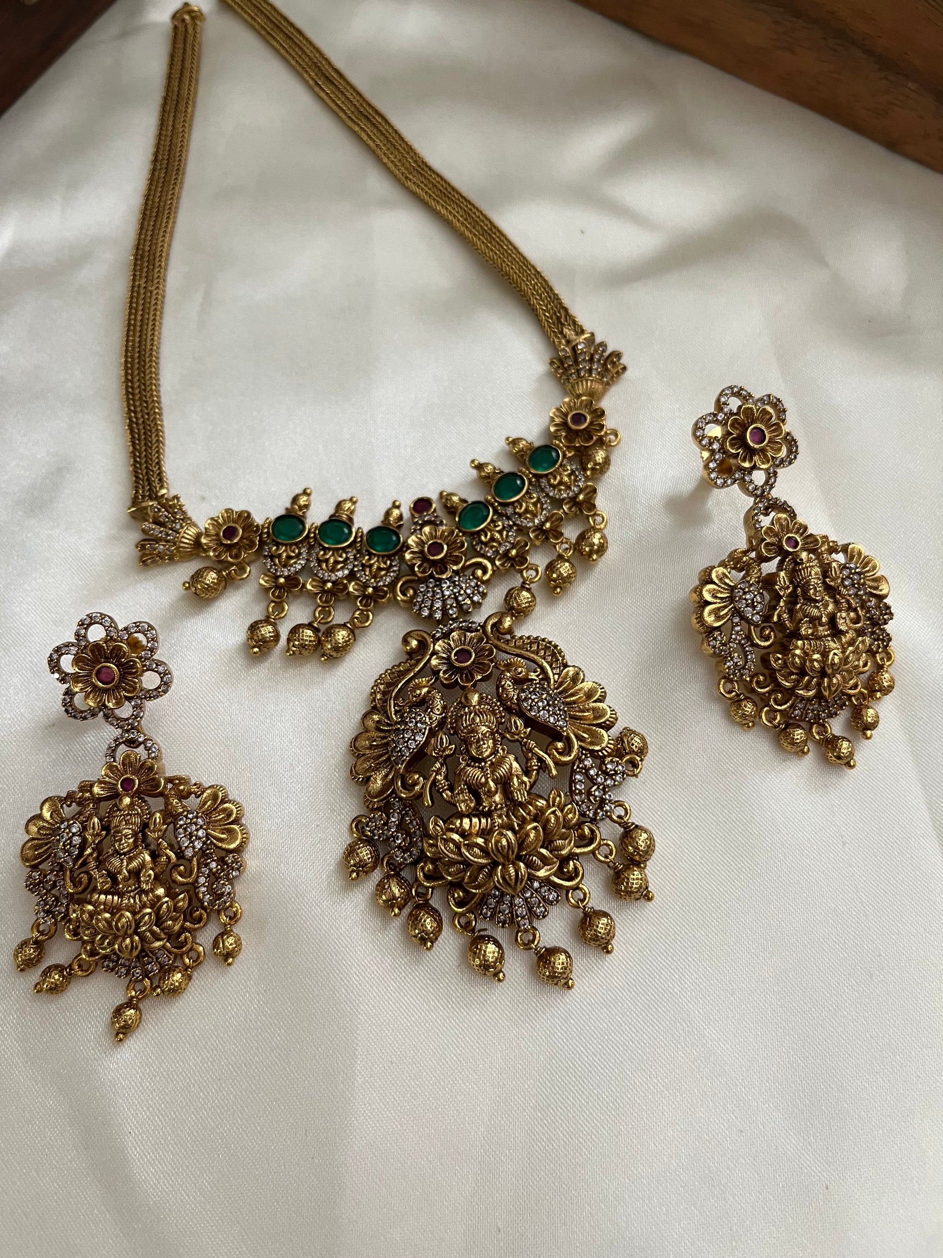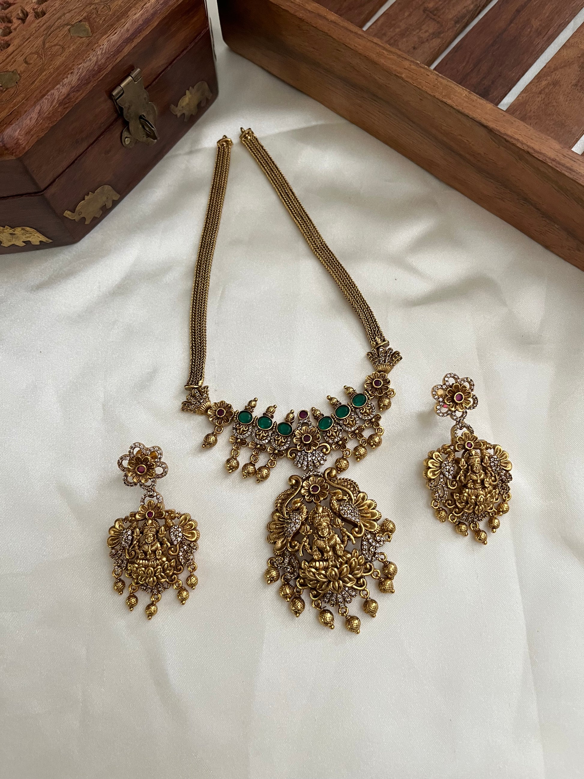 Enhance your style with our stunning Antique Lakshmi Devi chain set, paired perfectly with matching earrings. Crafted with high-quality stones & beads, this set combines timeless elegance with a modern touch. Ideal for special occasions or adding a touch of glamour to your look.