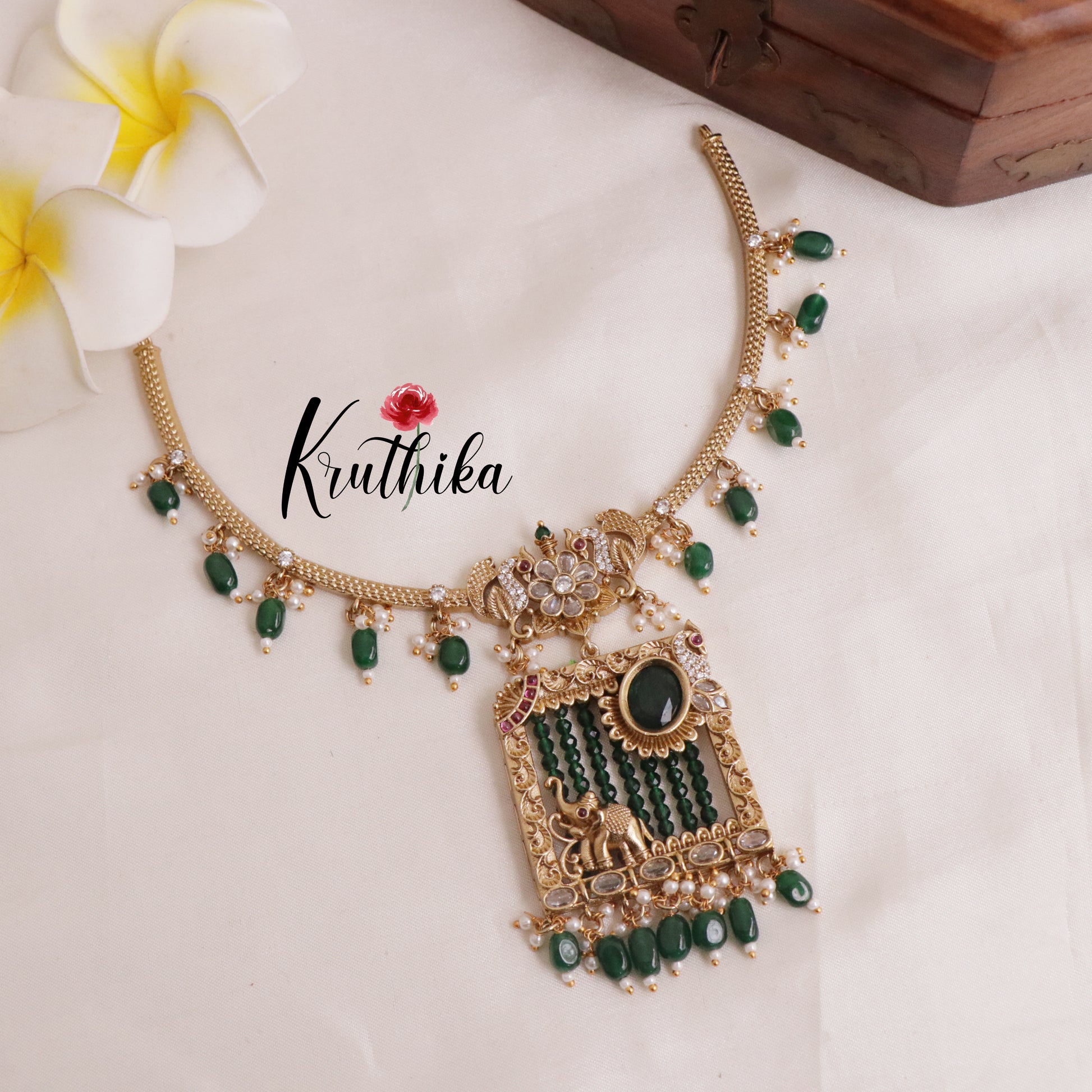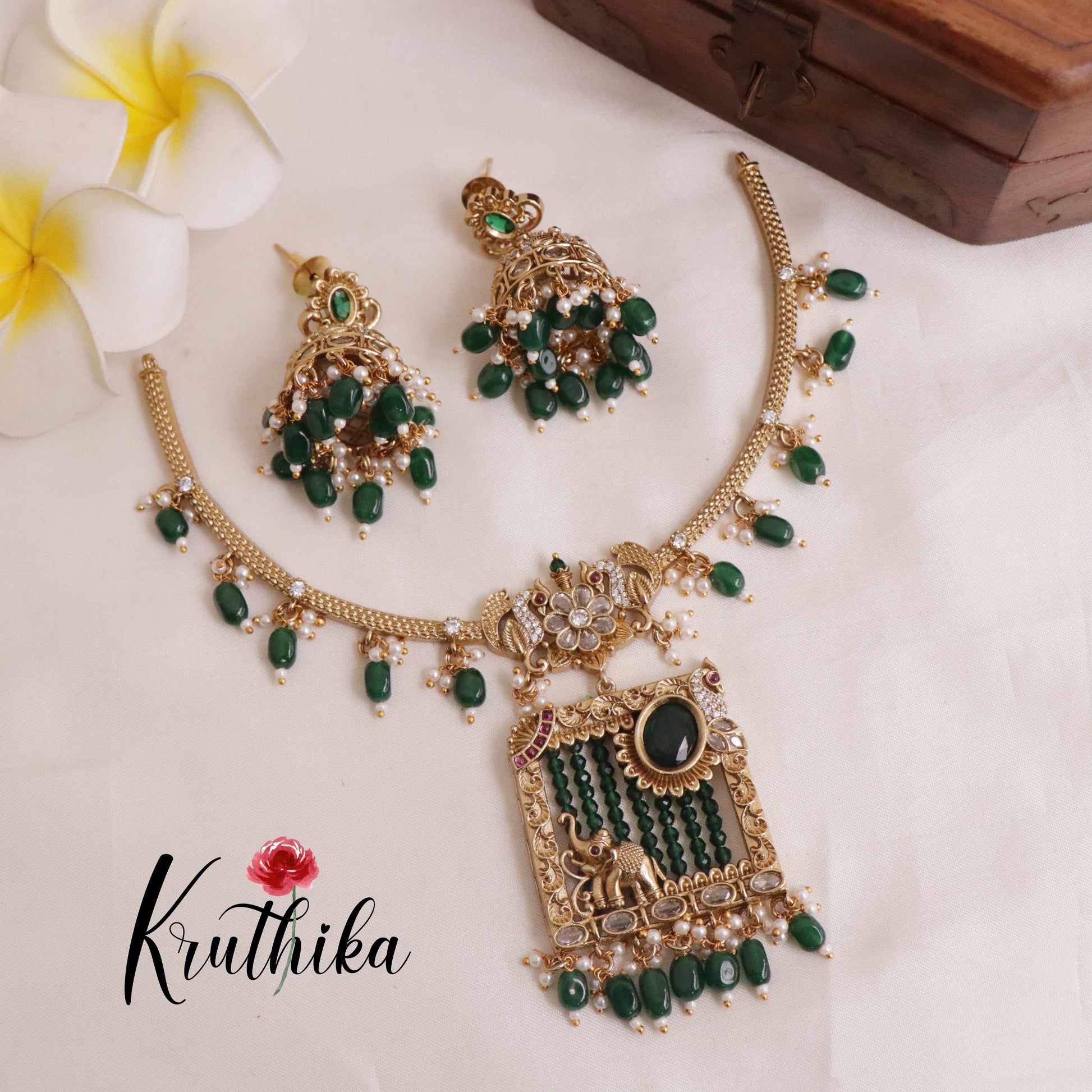 Enhance your style with our stunning, Antique Uncuts Green Beads Elephant Hasli/Kanti Necklace paired perfectly with matching earrings. Crafted with high-quality stones & beads, this set combines timeless elegance with a modern touch. Ideal for special occasions or adding a touch of glamour to your look.