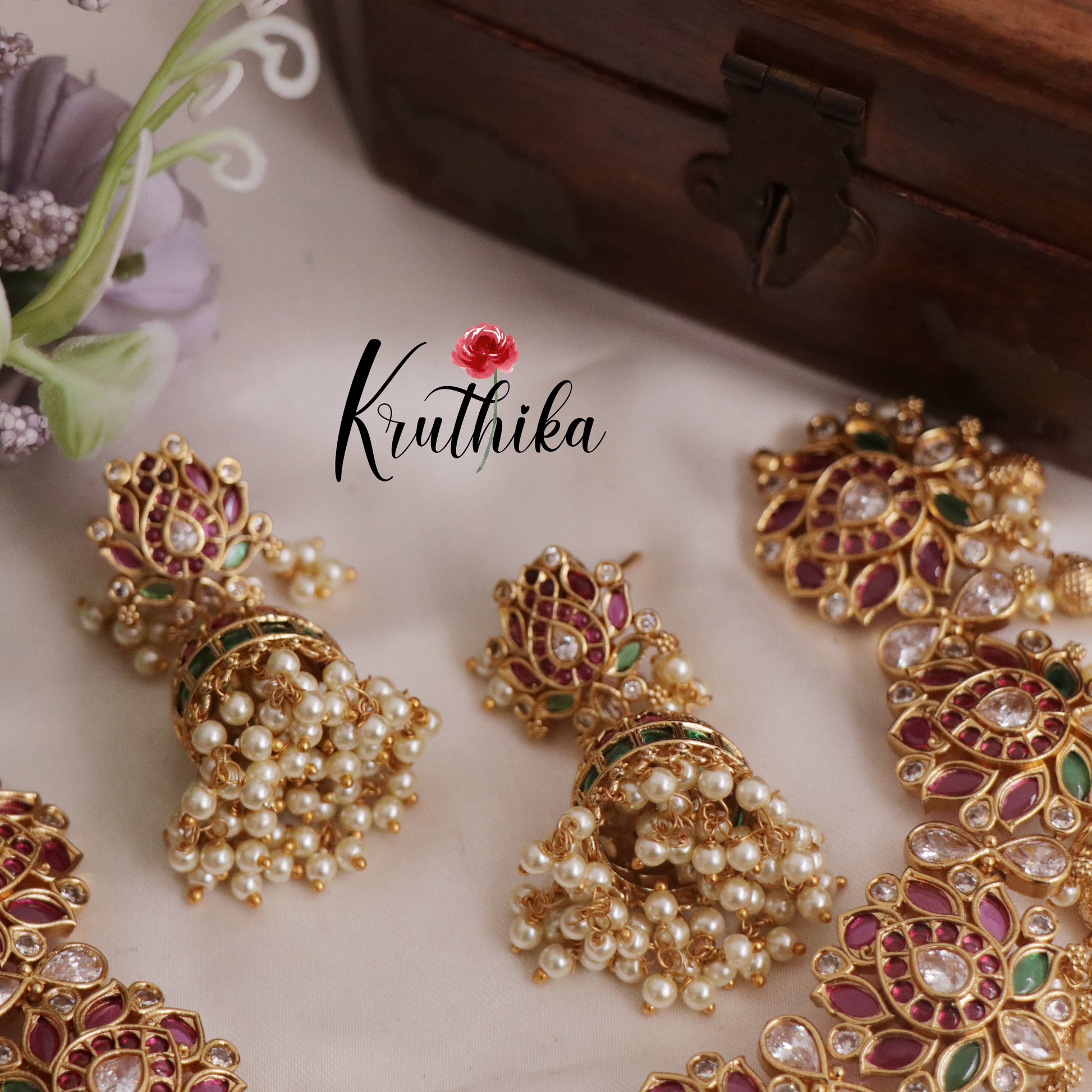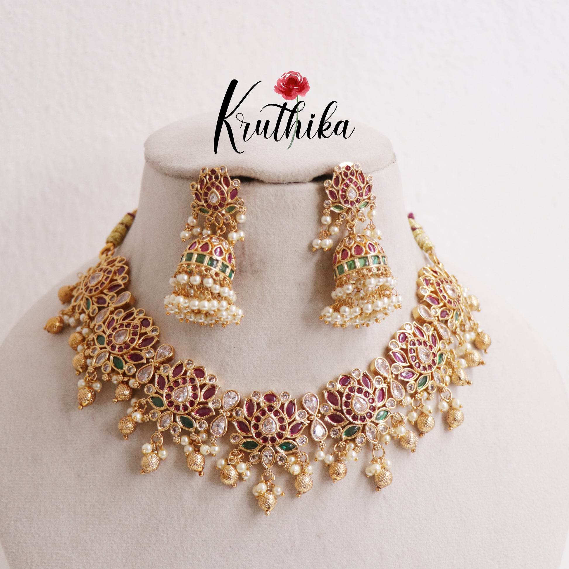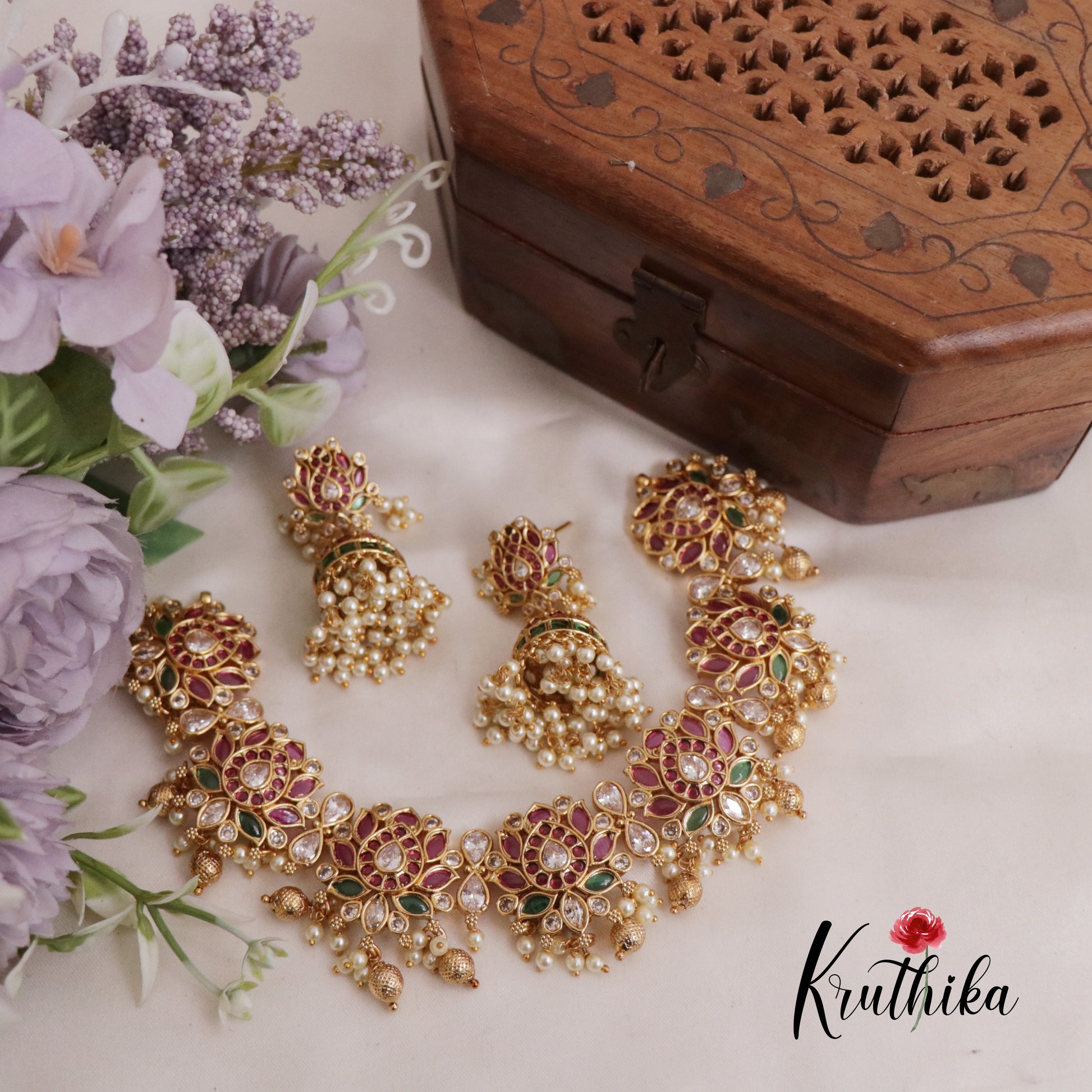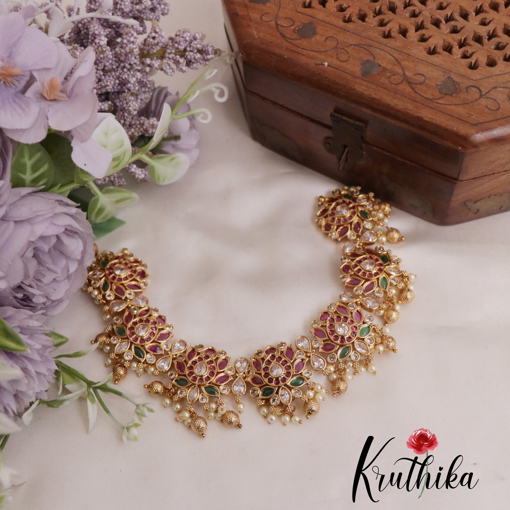Enhance your style with our stunning Beautiful AD Kemp Lotus Guttapusalu Necklace paired perfectly with matching earrings. Crafted with high-quality stones & beads, this set combines timeless elegance with a modern touch. Ideal for special occasions or adding a touch of glamour to your look.
