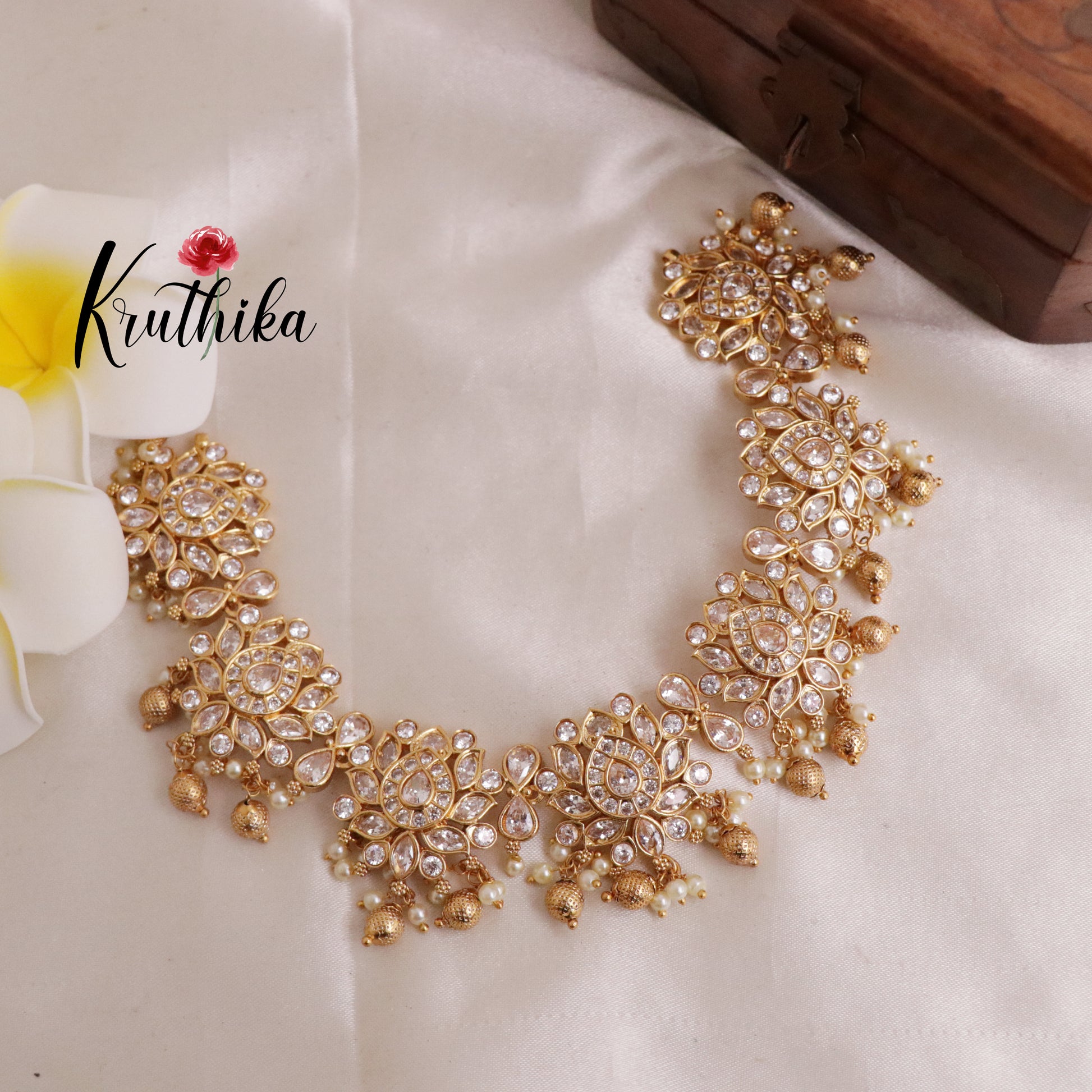 Enhance your style with our stunning Beautiful Ad Kundan Lotus Choker with Golden Beads Drops paired perfectly with matching earrings. Crafted with high-quality stones & beads, this set combines timeless elegance with a modern touch. Ideal for special occasions or adding a touch of glamour to your look.