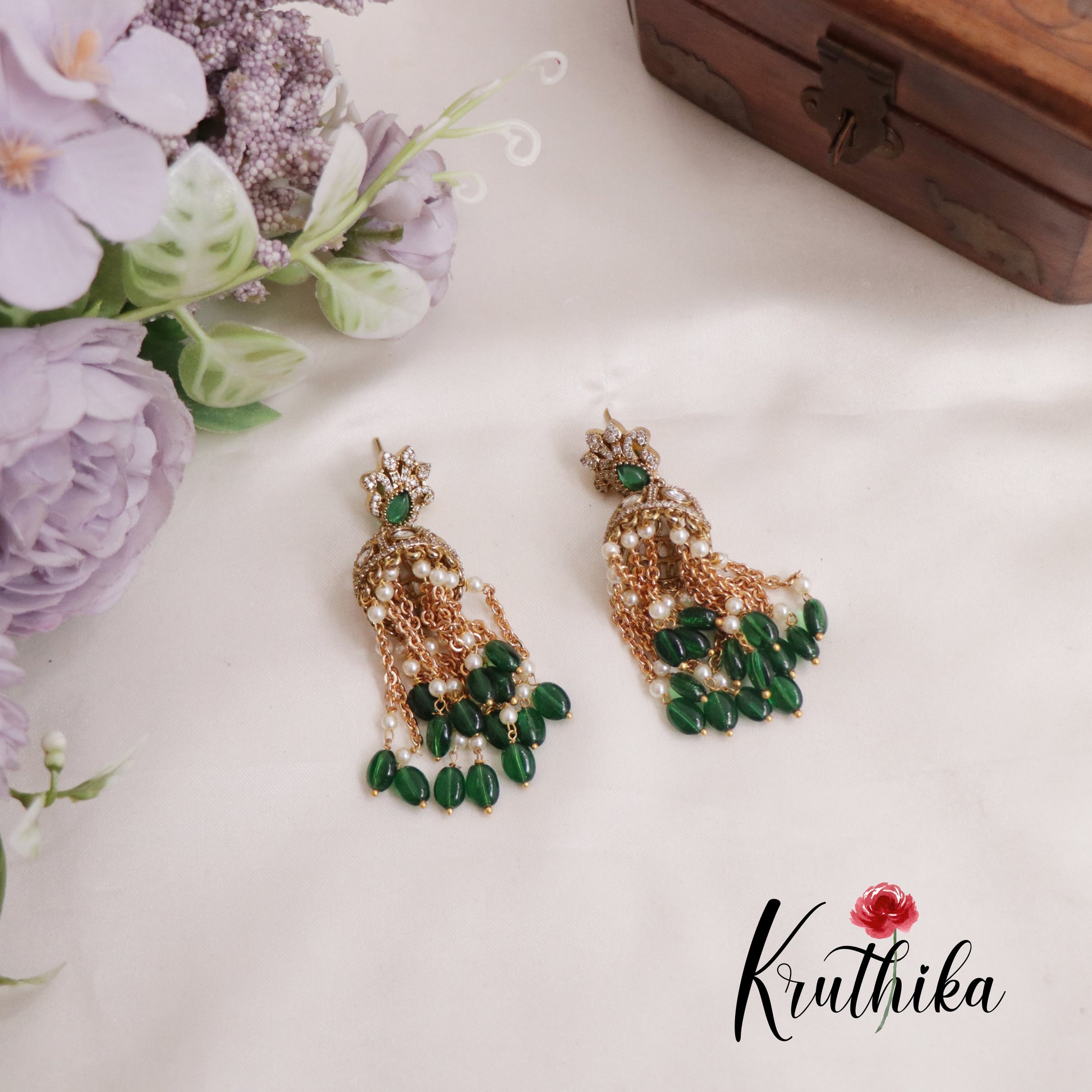 These elegant Jhumka earrings feature an intricate antique gold toned finish, blending traditional craftsmanship with a modern. The design showcases a floral inspired set with a vibrant emerald green stone, leading down to a bell shaped dome adorned with shimmering white crystals and pearls. Adding a unique touch of movement, the earrings are finished with cascading gold chains interspersed with delicate pearls and deep green glass beads, making them a perfect statement piece for festive occasions.