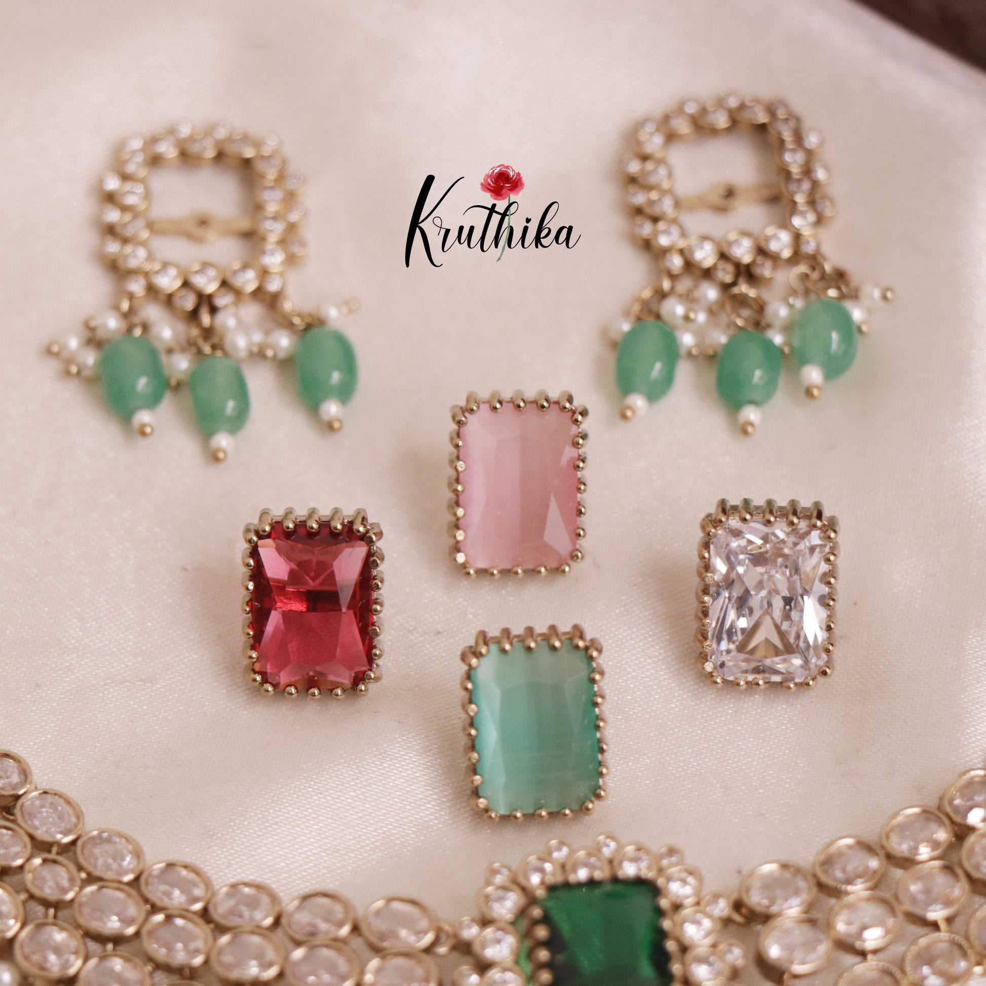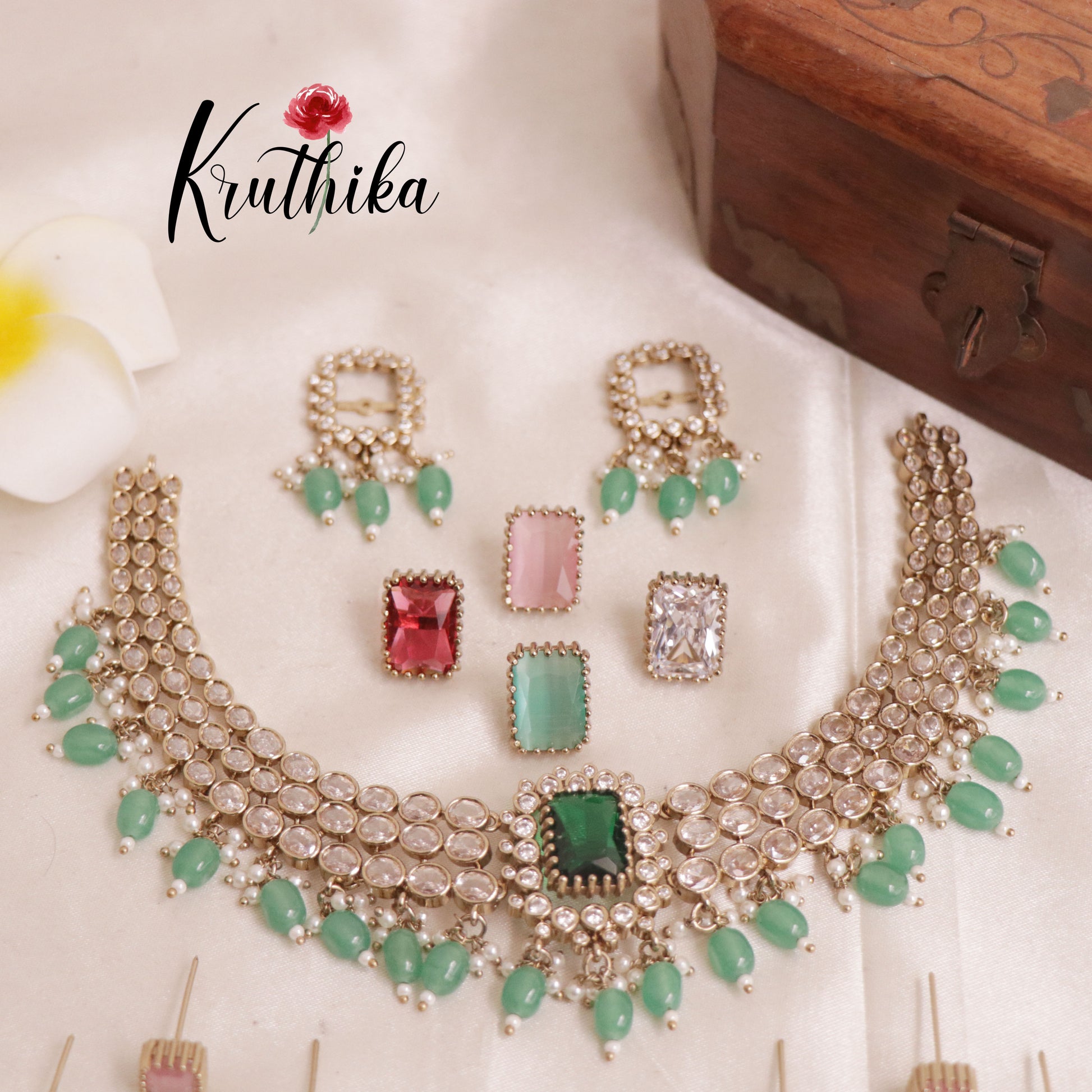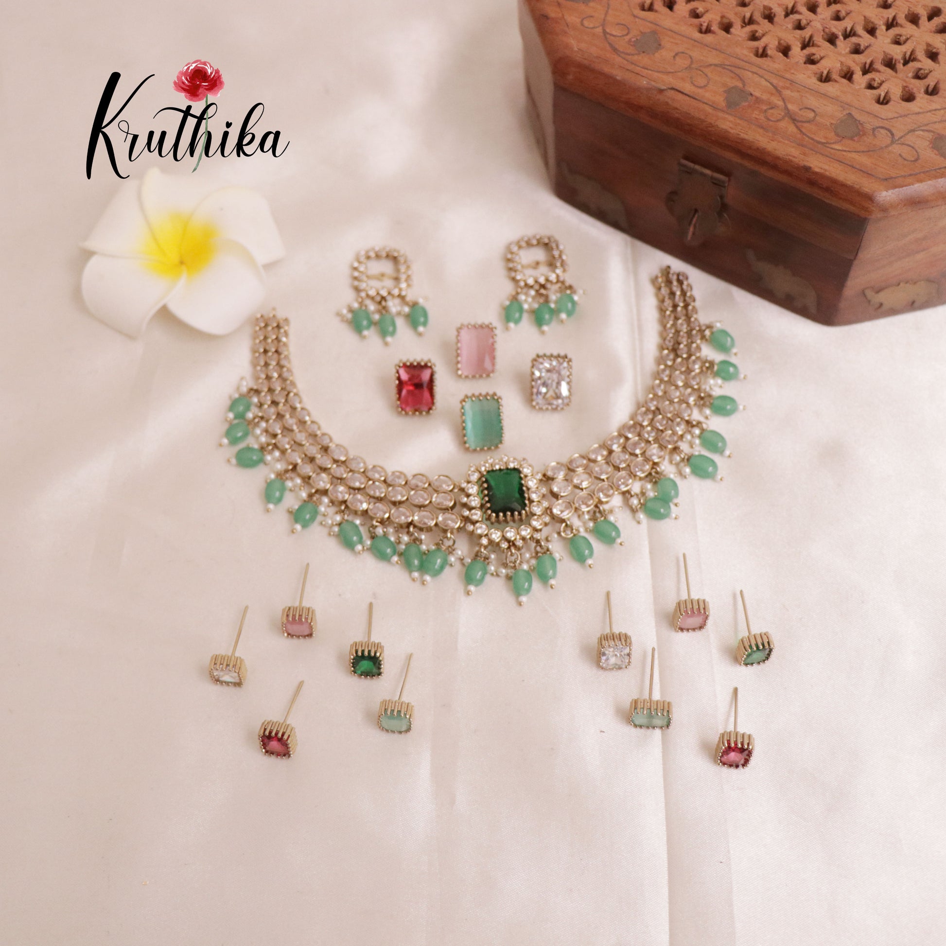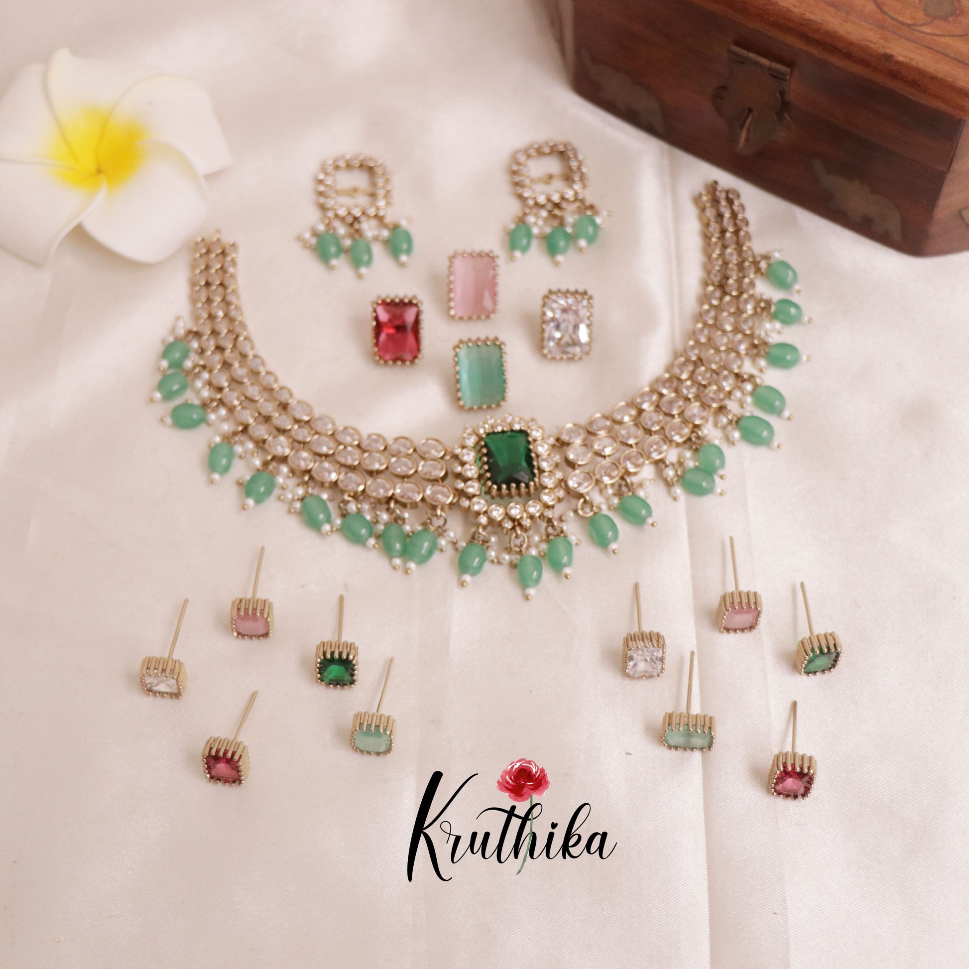 Enhance your style with our stunning, Beautiful AD/Victorian Changeable Stones Necklace, paired perfectly with matching earrings. Crafted with high-quality stones & beads, this set combines timeless elegance with a modern touch. Ideal for special occasions or adding a touch of glamour to your look.