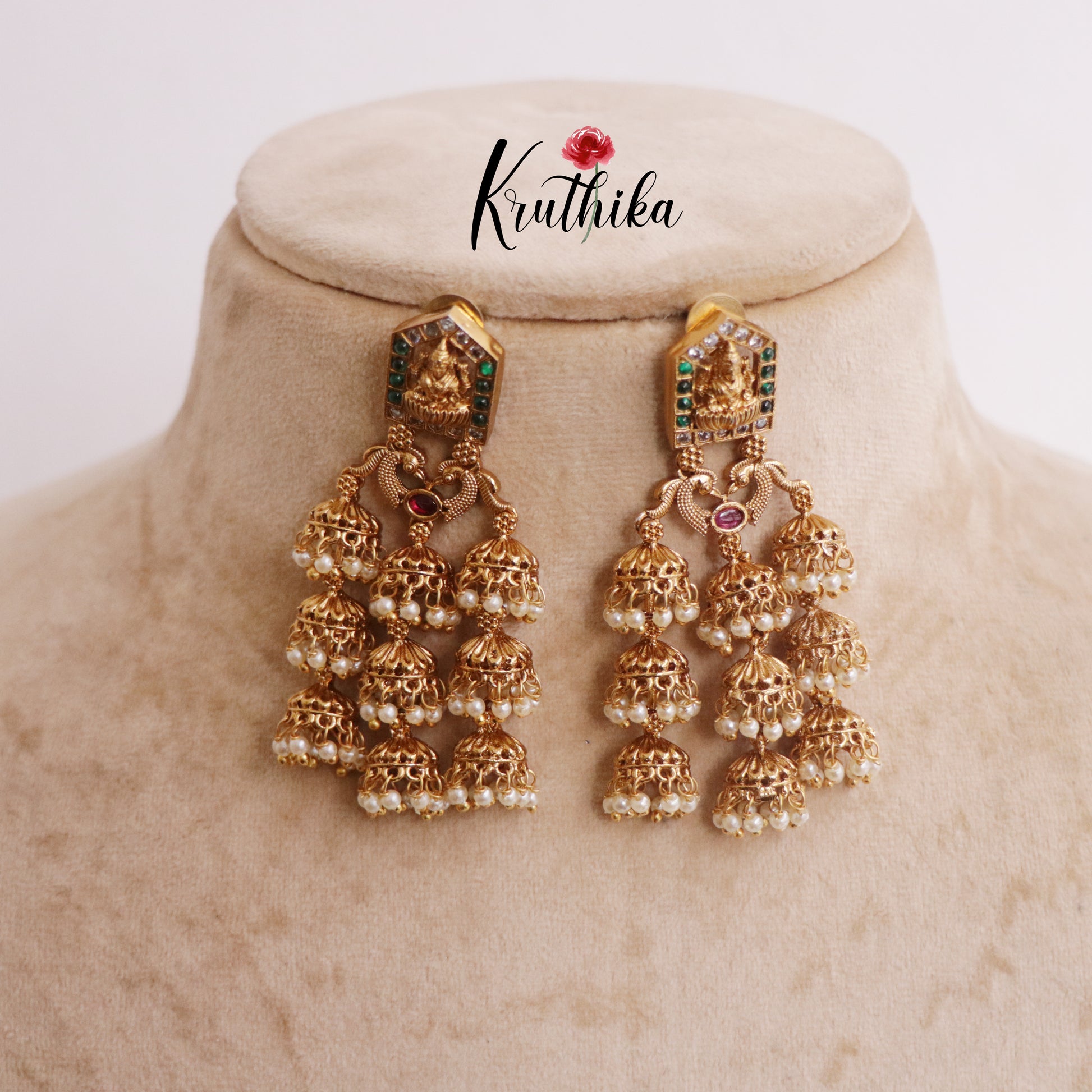 Elevate your ethnic collection with these stunning Temple Lakshmi Jhumkas, where traditional craftsmanship meets timeless elegance. Each earring features an intricately designed Lakshmi motif paired with lustrous pearl drops that catch the light beautifully. Perfect for festivals, weddings, or special occasions, these jhumkas add a touch of divine grace to any outfit. The classic temple design ensures they complement both traditional sarees and contemporary ethnic wear. Wear them with confidence and celebrate your heritage in style.