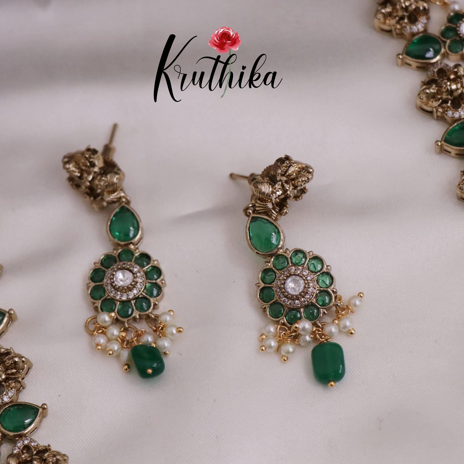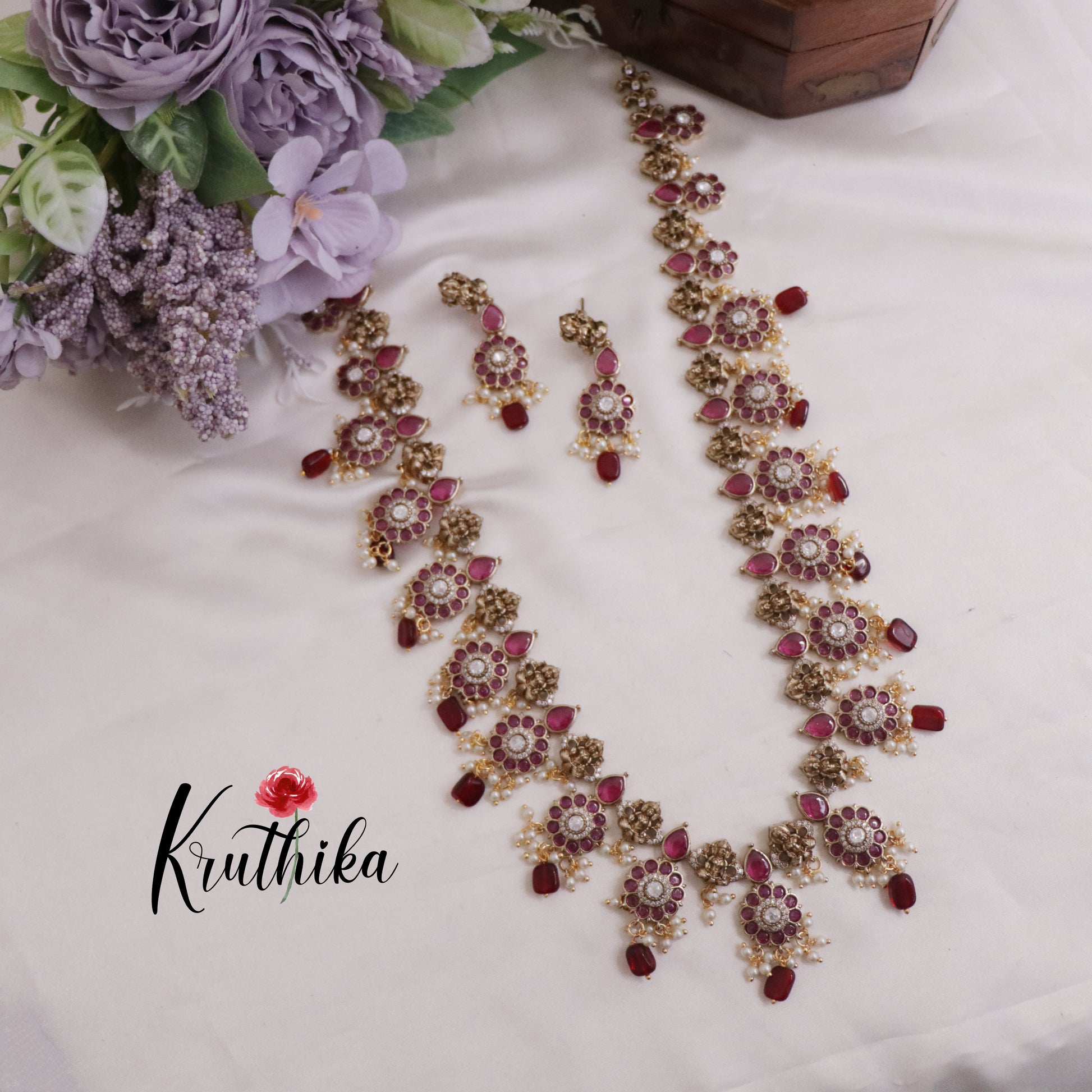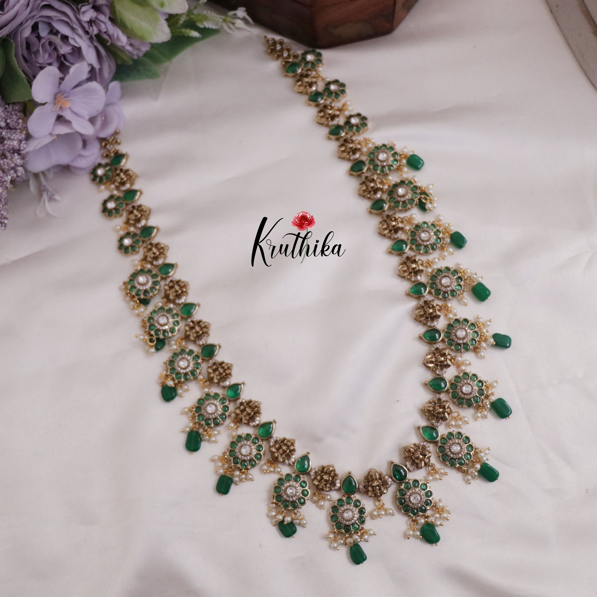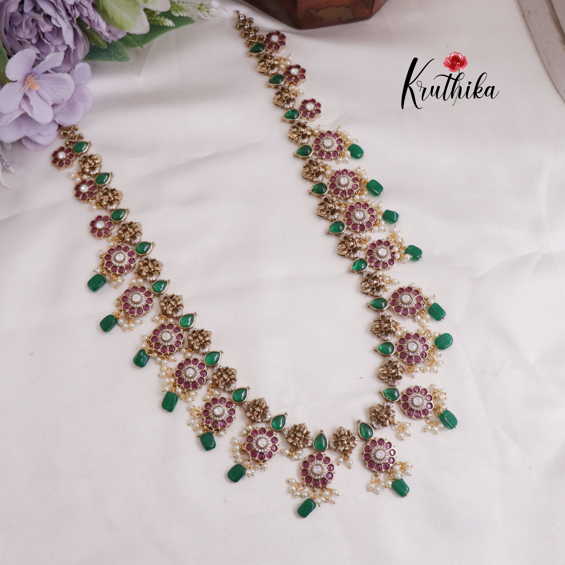 Enhance your style with our stunning Beautiful AD Floral Haram with Beads Drops paired perfectly with matching earrings. Crafted with high-quality stones & beads, this set combines timeless elegance with a modern touch. Ideal for special occasions or adding a touch of glamour to your look.