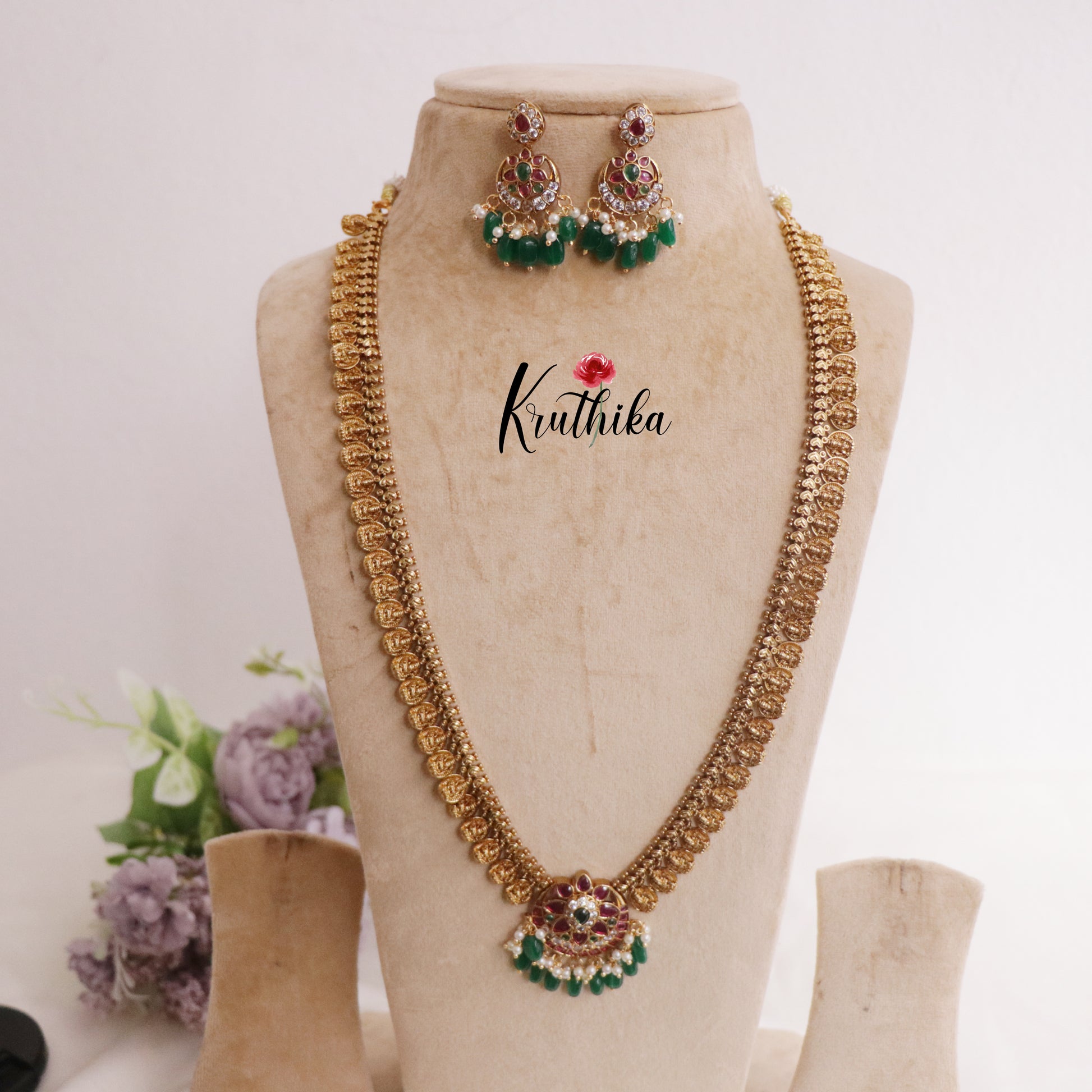 Enhance your style with our stunning Beautiful Antique Kemp Floral and Kasu Mala Haaram with Green Beads Crafted with high-quality stones & beads, this set combines timeless elegance with a modern touch. Ideal for special occasions or adding a touch of glamour to your look.