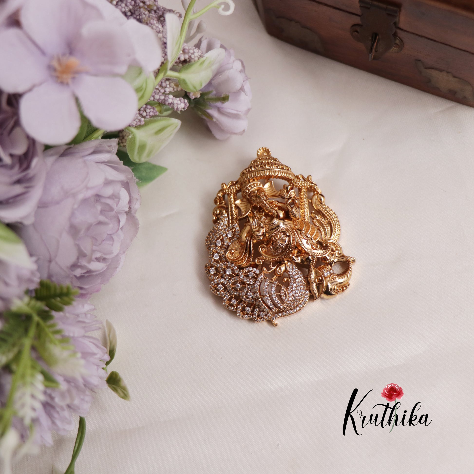 This Beautiful gold toned pendant features a detailed picture of Lord Ganesha. The centerpiece showcases Ganesha in a traditional seated pose and accented by a peacock motif at the base. One side of the design is brilliantly encrusted with shimmering white stones, adding a touch of modern radiance to the classic temple style craftsmanship. With its intricate textures and symbolic elegance, this piece serves as both a spiritual and a sophisticated statement accessory for any special occasion.