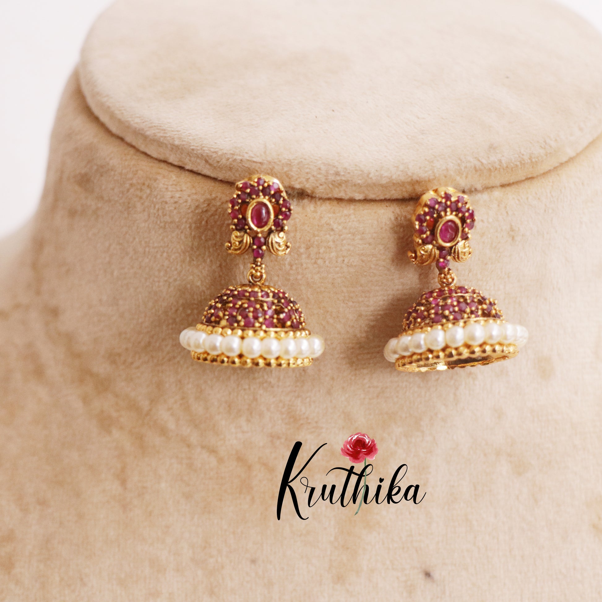 Elevate your ethnic collection with these stunning antique ruby pearl dome jhumkas. Crafted with meticulous attention to detail, these traditional earrings feature a captivating dome design adorned with lustrous pearls and rich ruby accents. The antique finish adds timeless elegance and vintage charm, making them perfect for weddings, festivals, or special occasions. Each pair celebrates classic Indian craftsmanship while offering a sophisticated touch to any ensemble. Lightweight yet striking, these jhumkas are designed to complement your natural beauty and enhance your festive look with grace and poise.