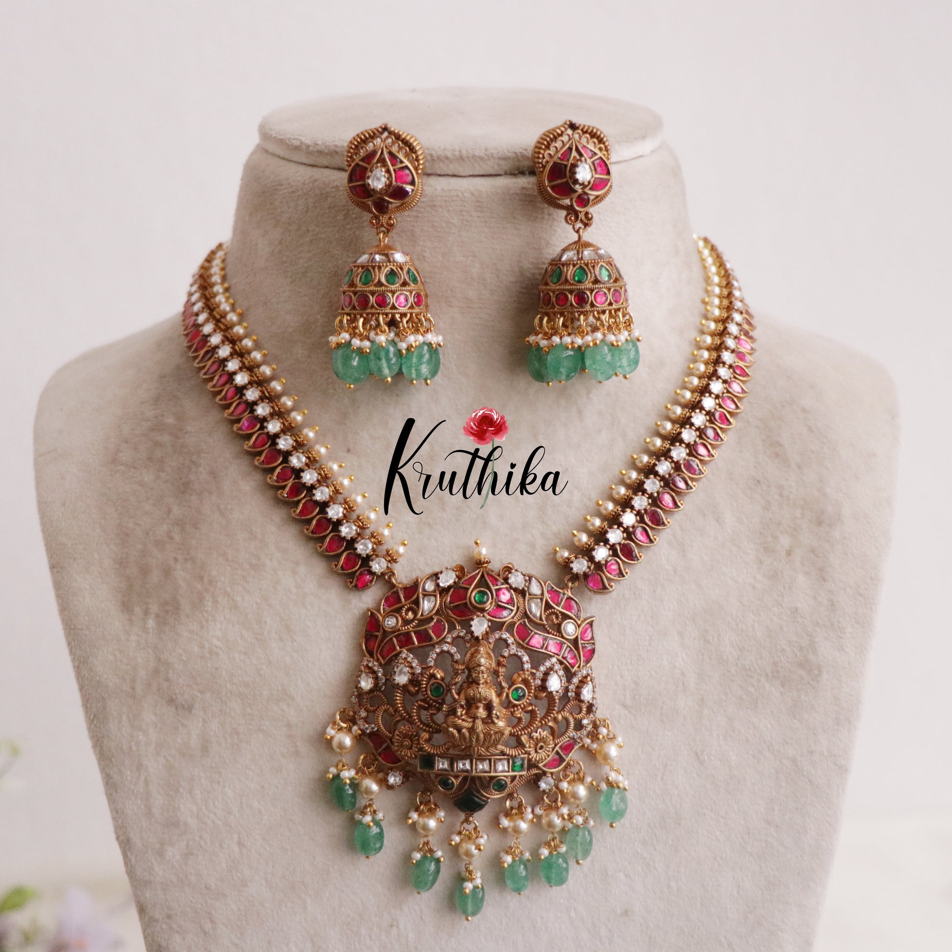 Enhance your style with our stunning, Beautiful Antique Temple Lakshmi Kemp Necklace with Pastel Green Beads paired perfectly with matching earrings. Crafted with high-quality stones & beads, this set combines timeless elegance with a modern touch. Ideal for special occasions or adding a touch of glamour to your look.