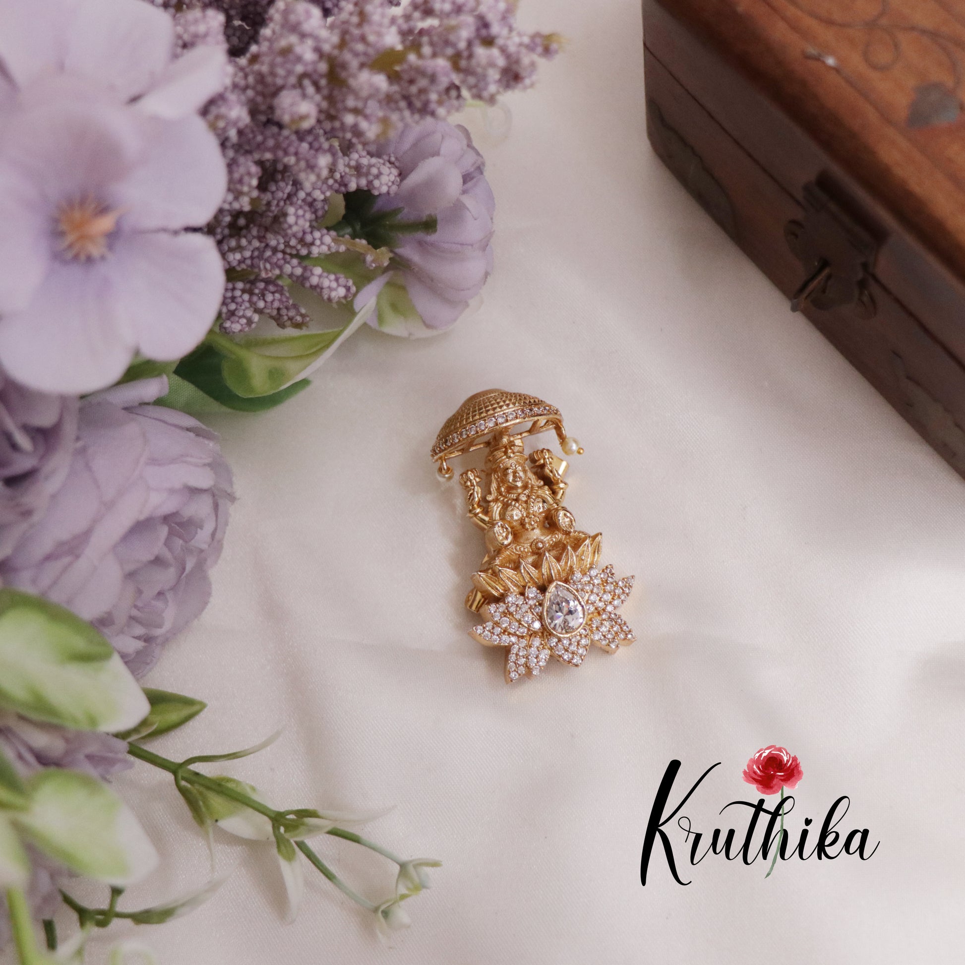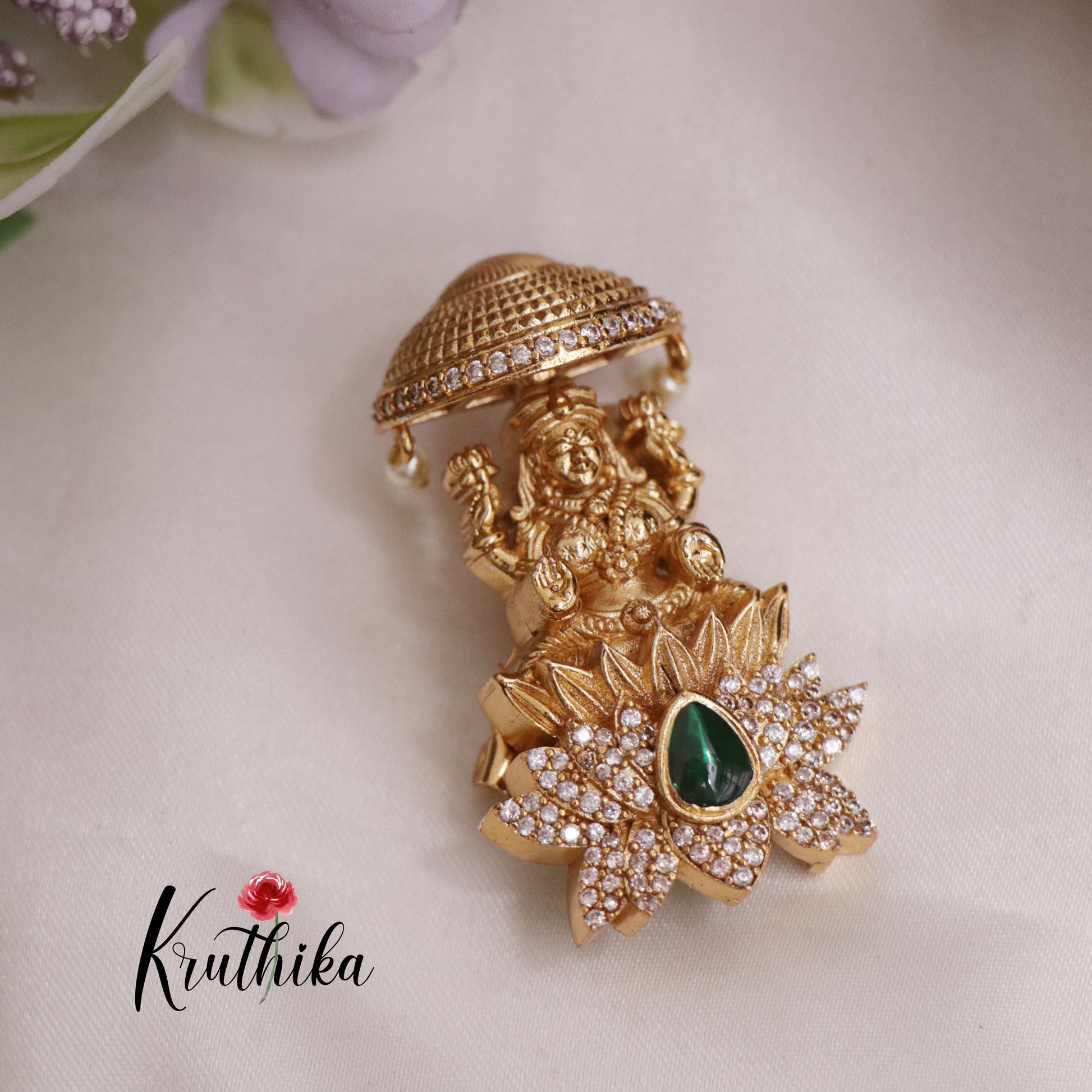 This exquisite temple Lakshmi saree pin combines traditional craftsmanship with contemporary sparkle. Featuring a divine Lakshmi motif rendered in antique finish, adorned with brilliant cubic zirconia stones, this pin secures your saree with refined sophistication. Available in four versatile colour options to complement any saree palette, it's an investment piece for the discerning wearer. The intricate detailing and quality construction ensure lasting beauty through countless celebrations and occasions.