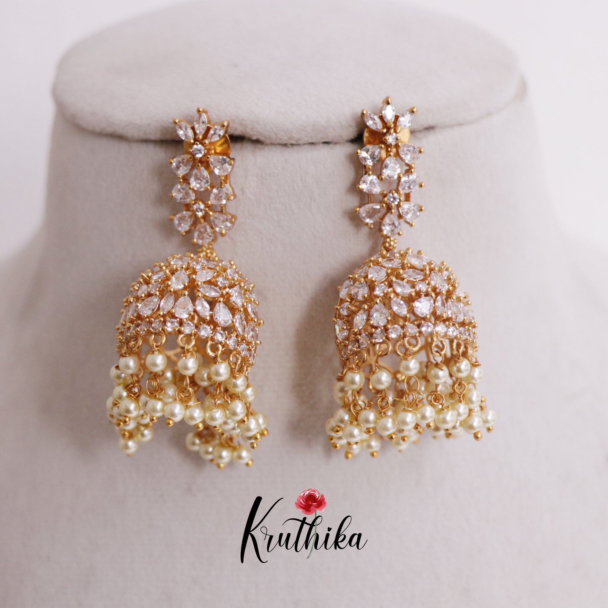 Beautiful CZ Sparkling Floral Pearl Jhumka Earrings E707 (Available in 2 colours)