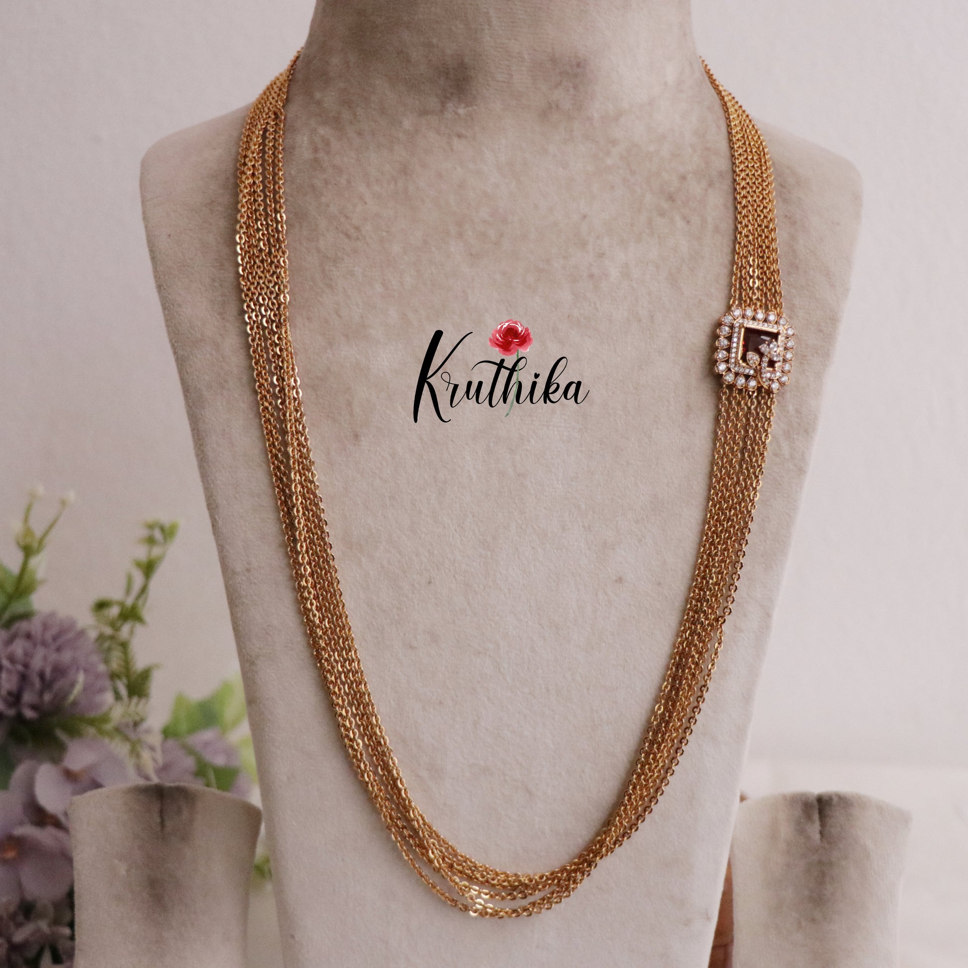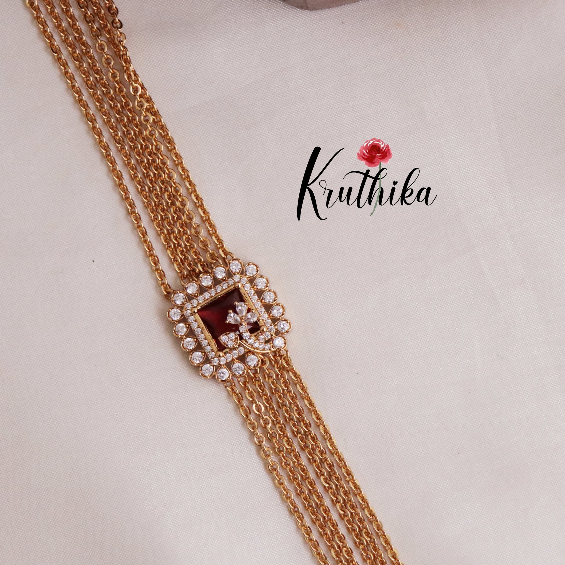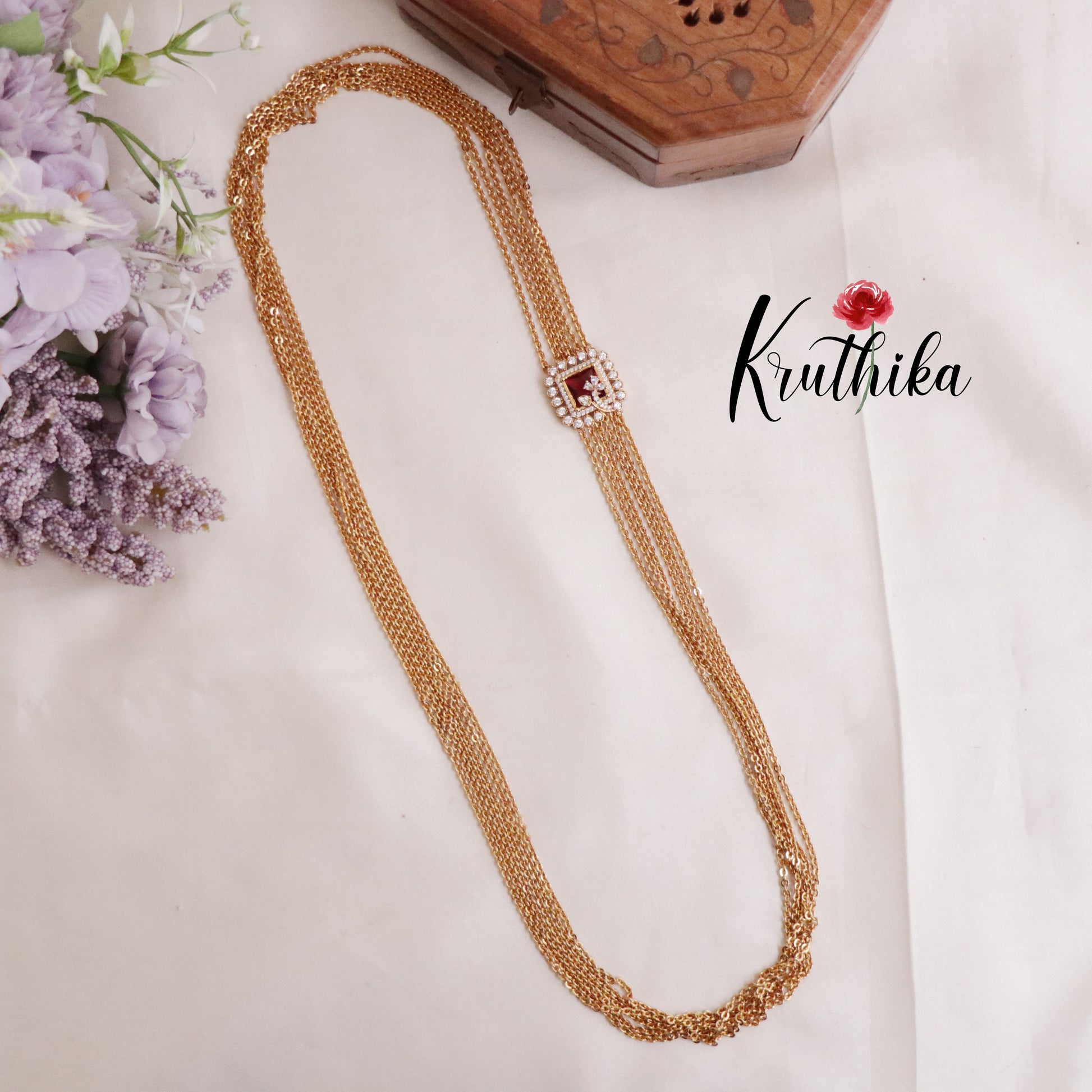 Our Four Layer Chandra Haaram with AD Pendant is a timeless piece that adds instant grandeur to any traditional look. Crafted with sparkling AD stones and finished in a classic temple-style polish, this haaram features four elegant layers that drape beautifully across the neckline. The statement design with delicate crescent-shaped (chandra) motifs running across the layers adds a touch of heritage charm.