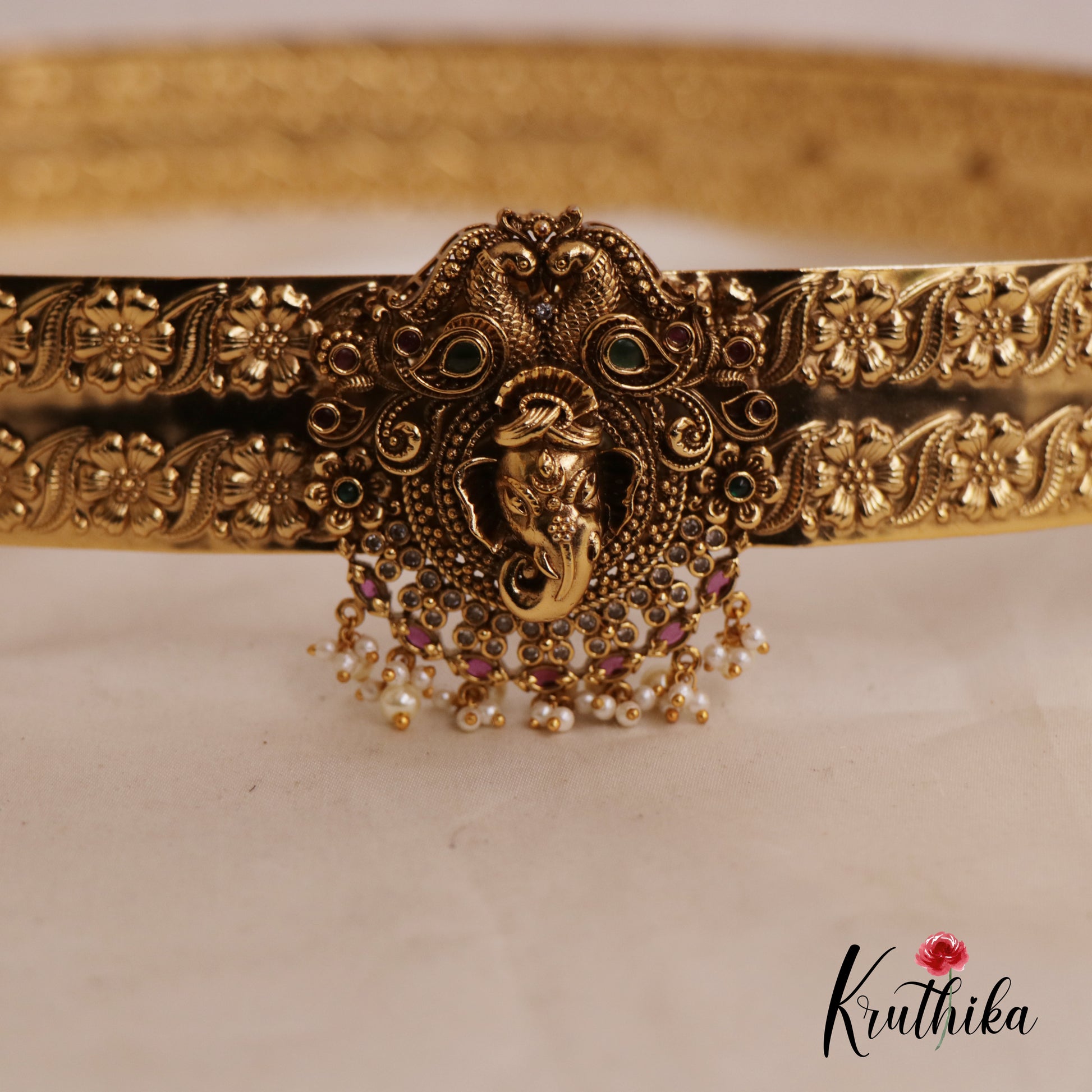 This elegant antique gold finish hip belt features an temple jewelry design, perfect for adding a regal touch to traditional attire. The centre is graced by a finely detailed Lord Ganesha motif, framed by twin peacocks and accented with subtle green and ruby coloured stones. Delicate pearl clusters droplets hang from the pendant, complementing the intricate floral scrollwork that spans the length of the belt.
