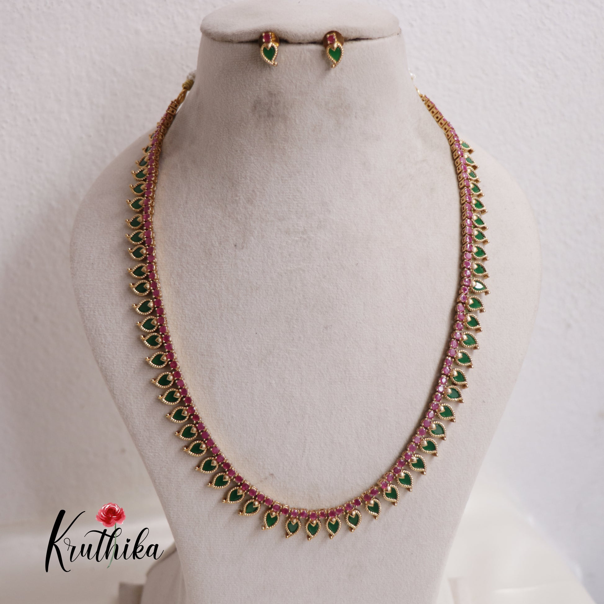 This Beautiful haaram paired with matching stud earrings, showcasing a classic South Indian aesthetic. The piece is crafted with a vibrant contrast of pink rubies lining the inner chain and mango shaped emerald green stones dangling along the outer edge. Each green stone is encased in a delicate gold toned beaded border, adding a touch of traditional temple style sophistication. Its sleek, flexible design allows it to drape gracefully, making it a perfect statement accessory for weddings, festivals, or formal ethnic occasions.