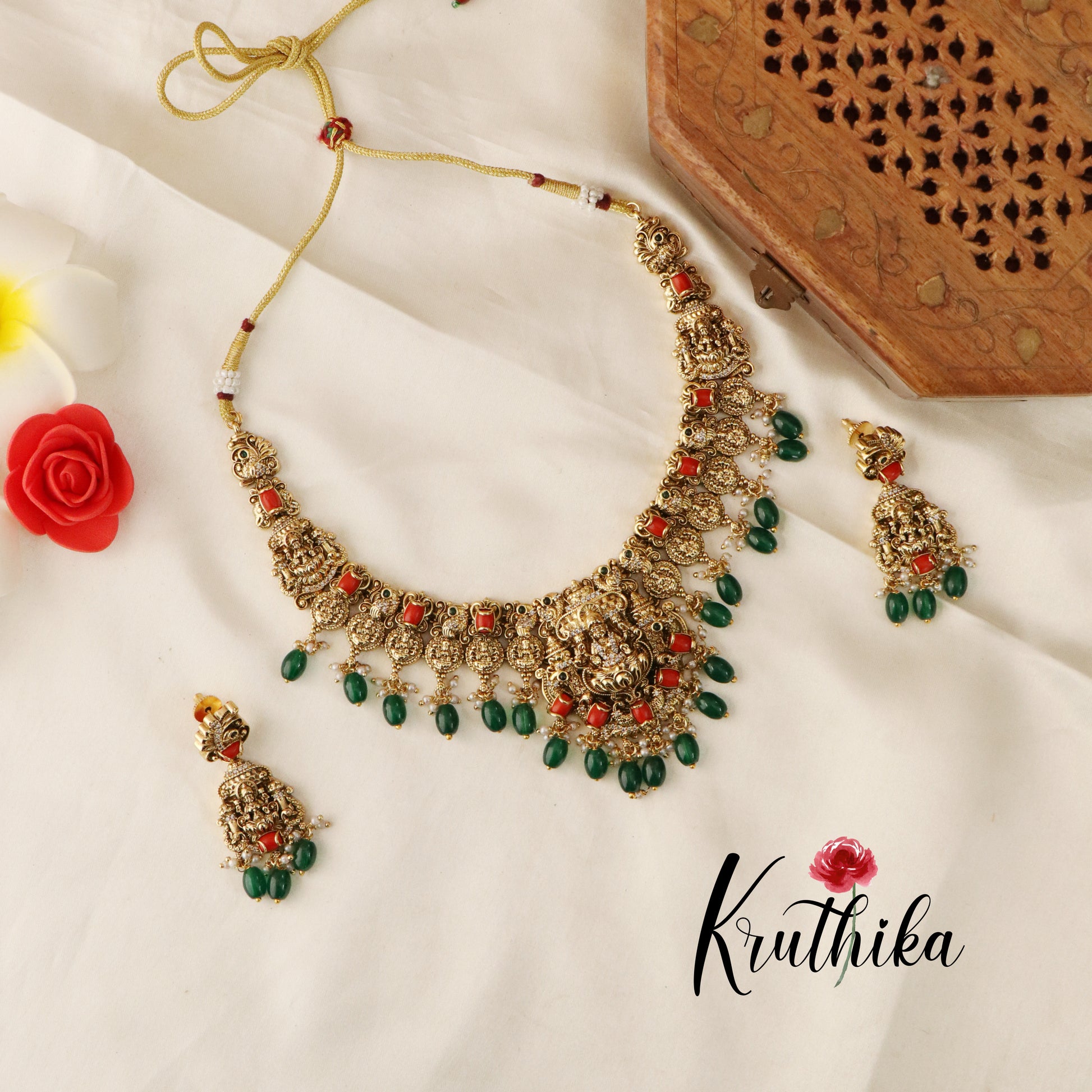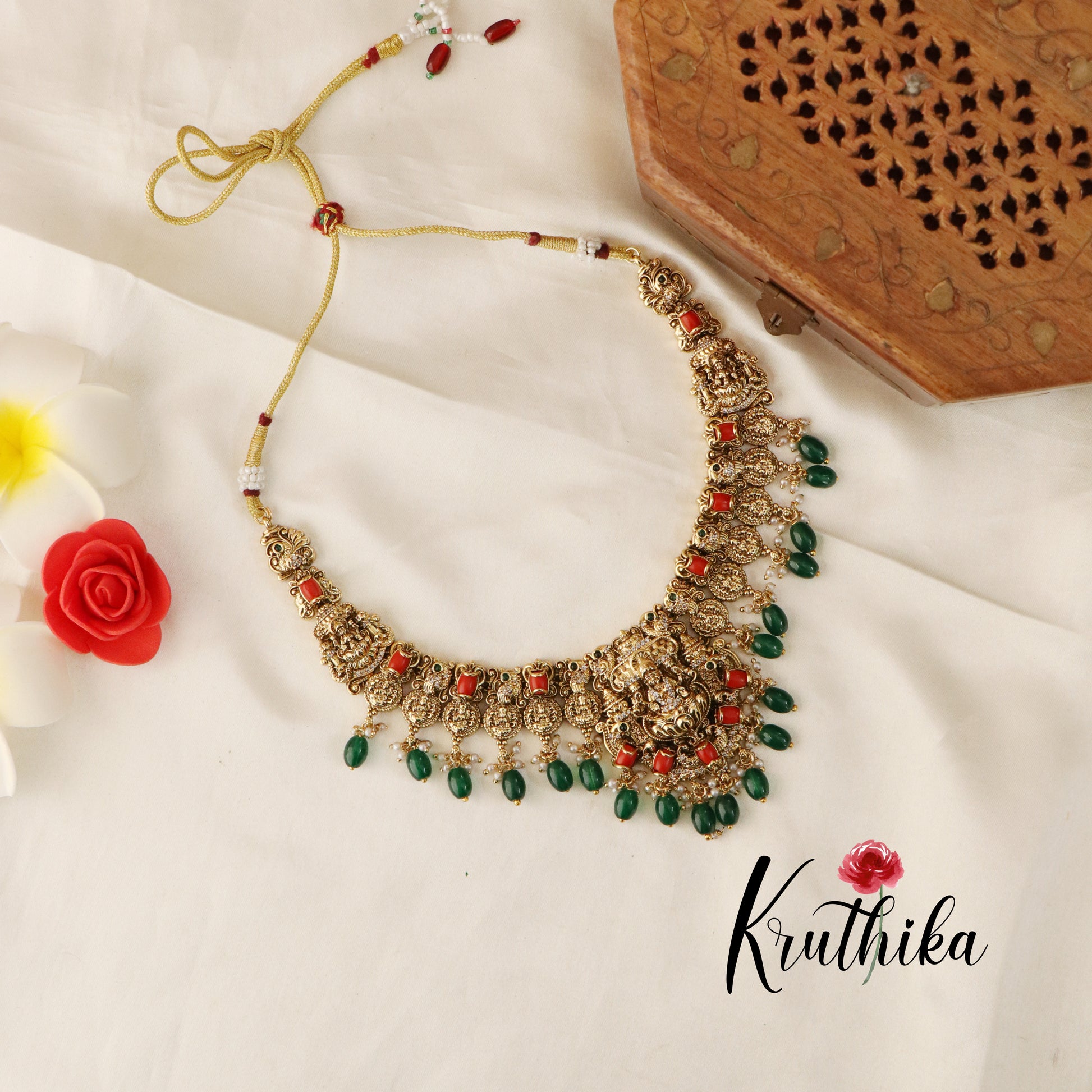 Beautiful Lakshmi Coral Stone Necklace-Green Beads NC1333