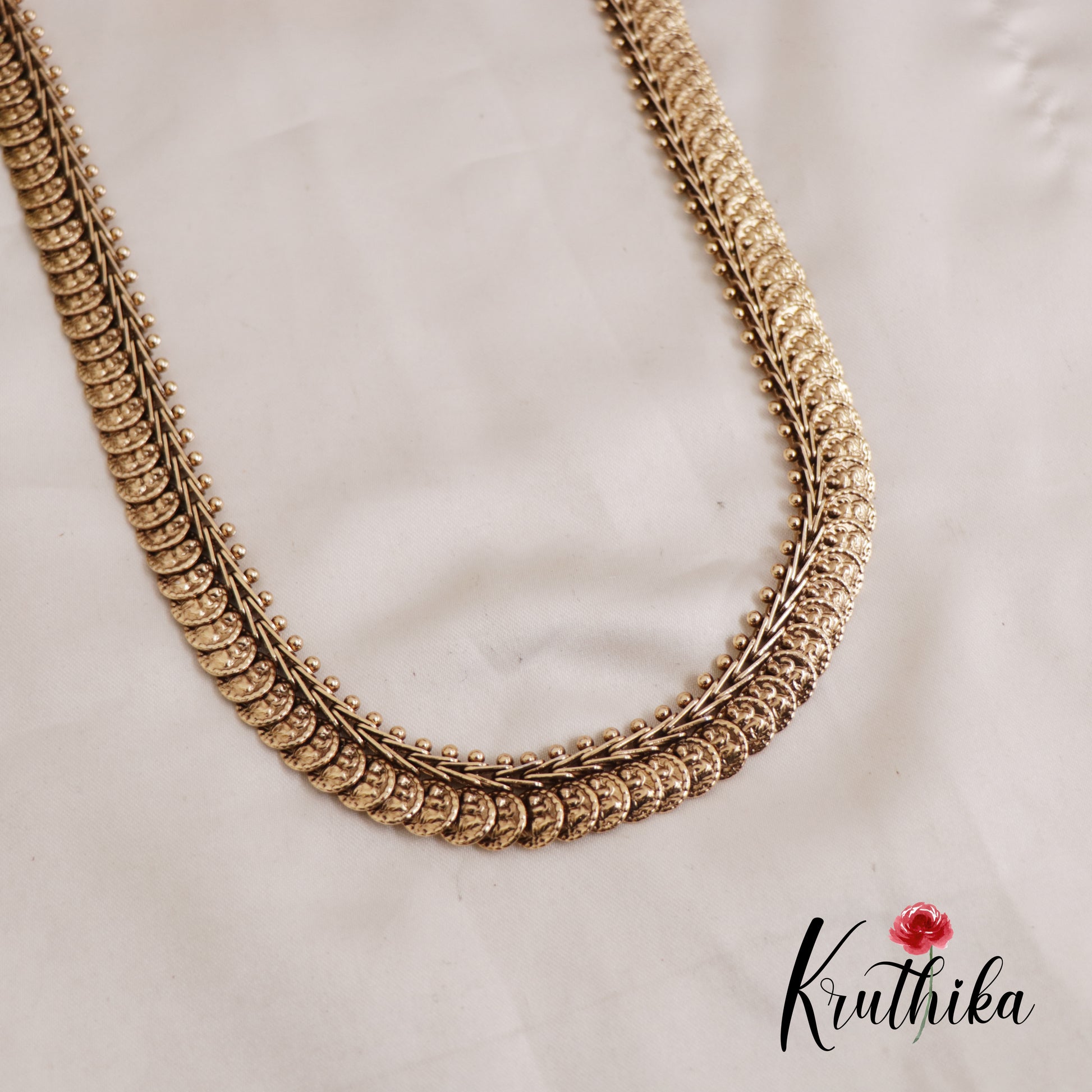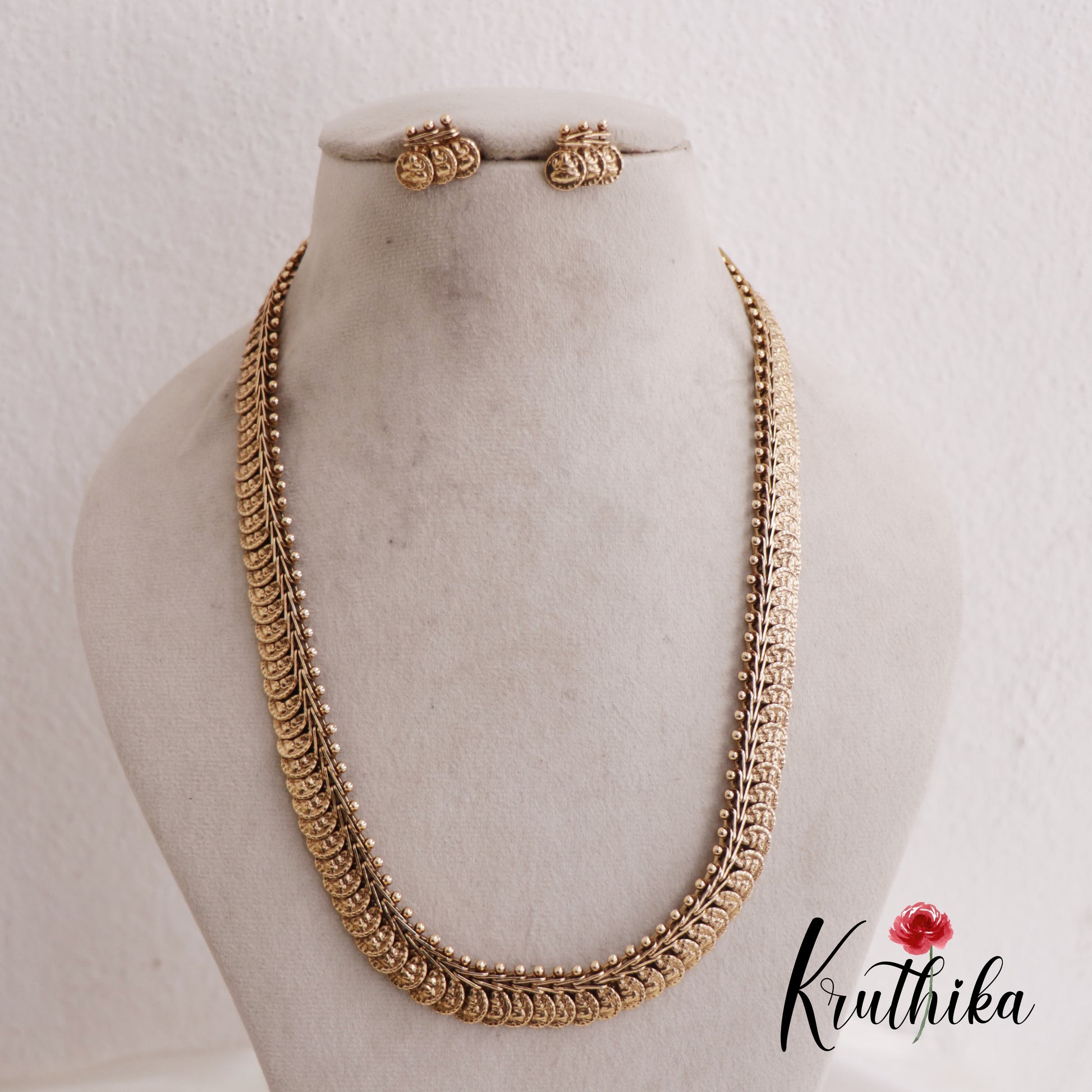 This beautiful long haaram set embodies timeless South Indian artistry with its intricate, antique gold finish. The haaram features a traditional kasu design, composed of overlapping coin like motifs that create a rich, textured drape. Paired with matching stud earrings, this set offers a sophisticated, regal look perfect for weddings, festivals, or festive occasions.