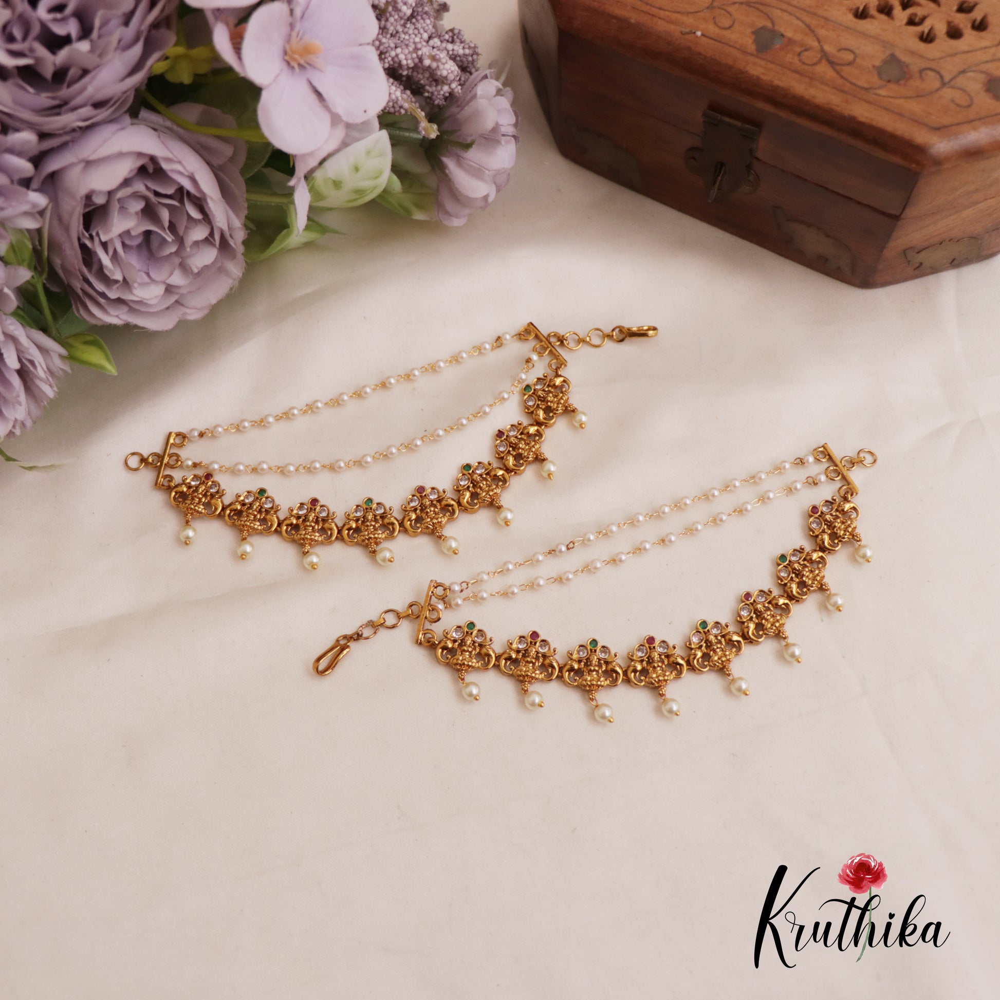 Elevate your traditional attire with these exquisite Temple style Matt Gold Earchains. These chains feature intricately crafted Lakshmi motifs highlighted by subtle ruby and emerald colored stone accents. Designed with a dual layered structure, the top strand consists of delicate pearl seed beads, while the lower strand is adorned with traditional gold finished medallions and dangling pearl droplets. Perfect for weddings and festive occasions, they offer both aesthetic elegance and functional support for heavy earrings.