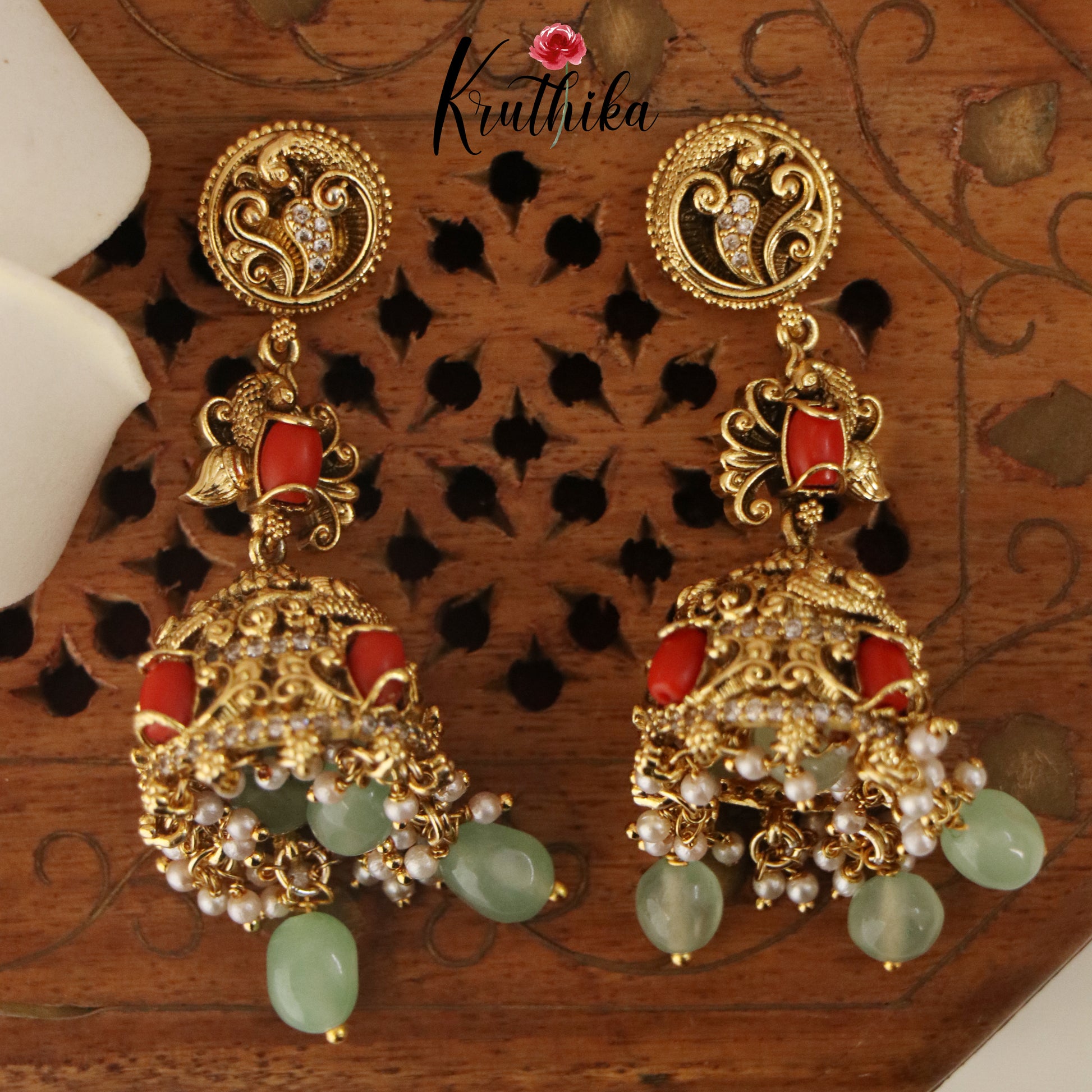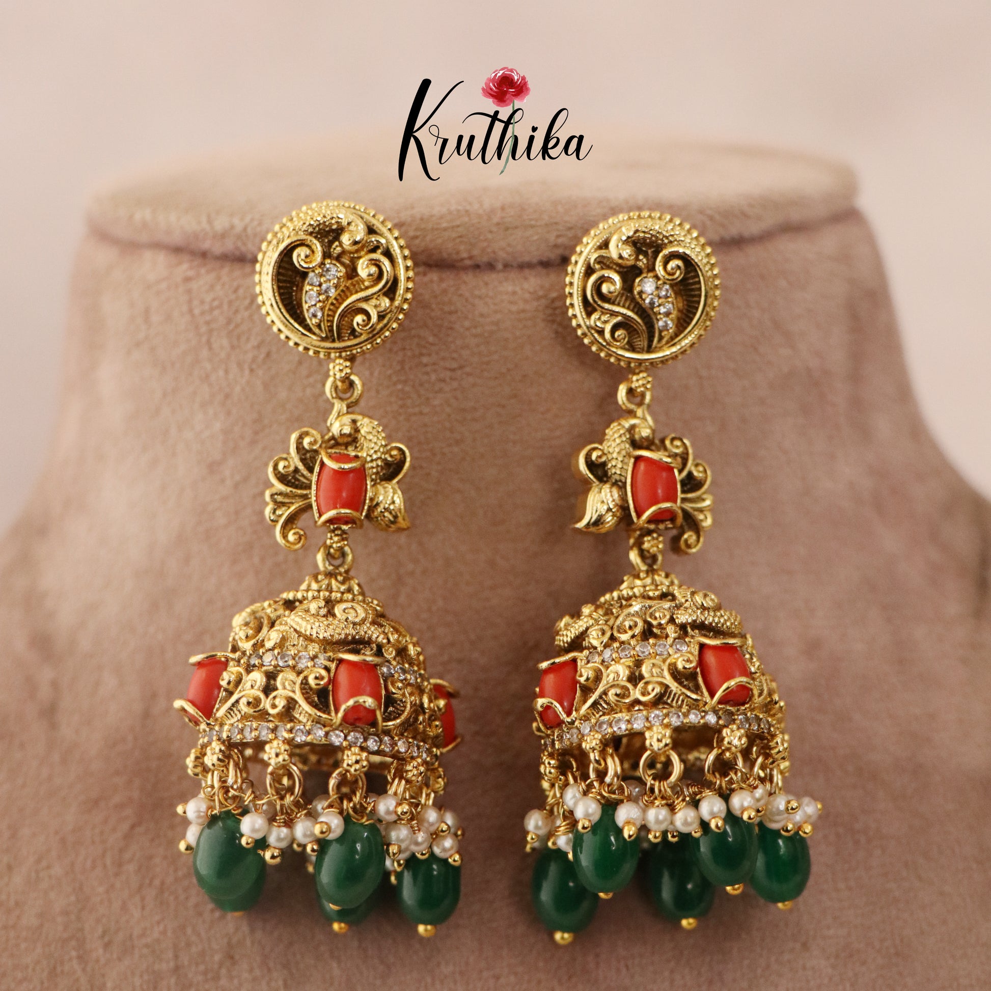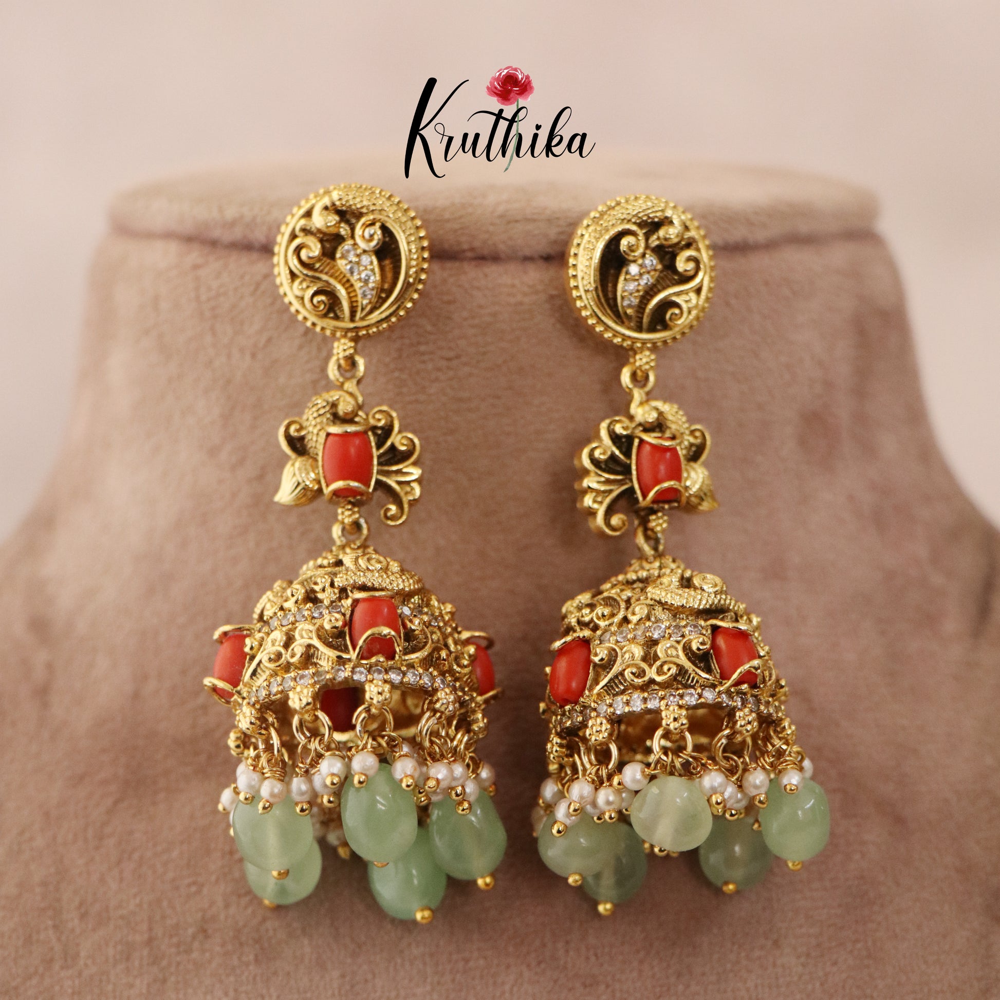 Beautiful Peacock Coral Bead Jhumkas E420 ( Available in 2 Colours)