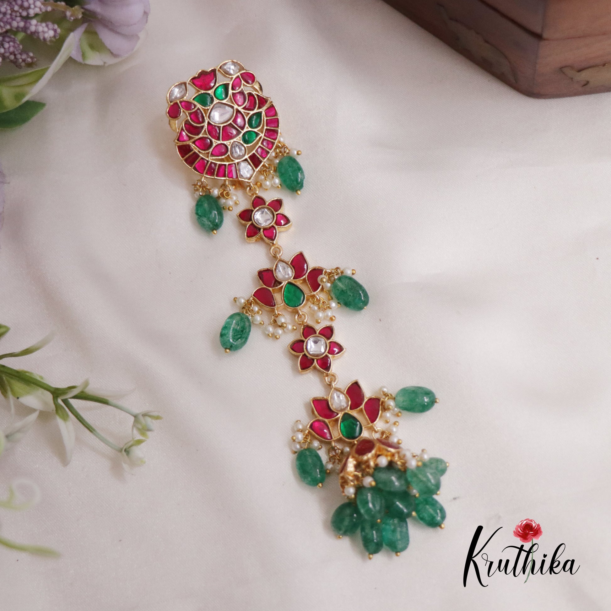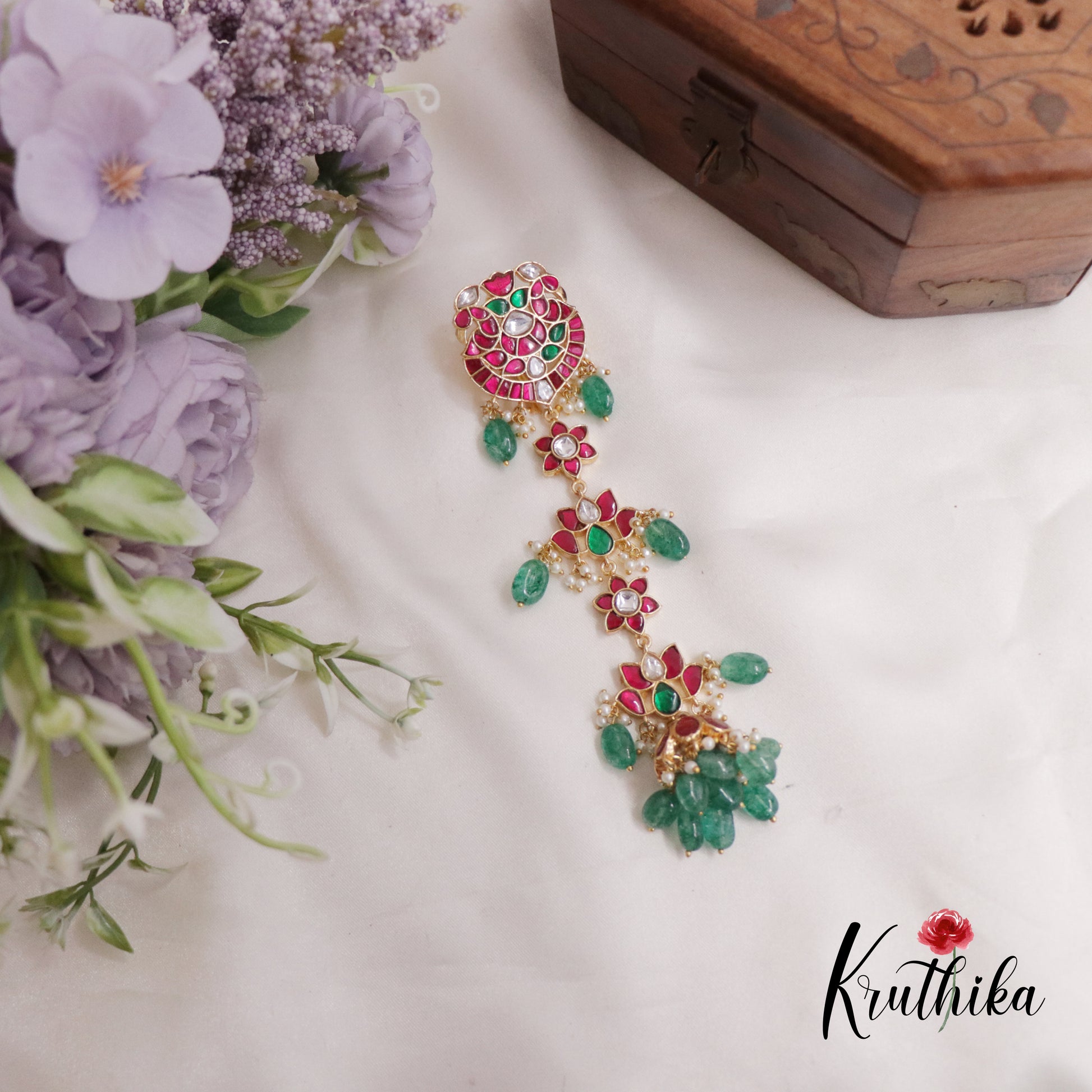 Exquisite peacock and lotus motifs crafted in traditional Jadau technique, this Jada Billa showcases intricate gemstone inlay work against a lustrous gold base. Each detail reflects centuries-old artisanal craftsmanship, with precisely placed stones creating dimensional depth and radiant sparkle. The peacock design symbolizes grace and elegance, while the lotus represents purity and prosperity in Indian heritage. Perfect for festive occasions, weddings, or adding timeless sophistication to your jewellery collection. A masterpiece that celebrates authentic Indian artistry and enduring beauty.