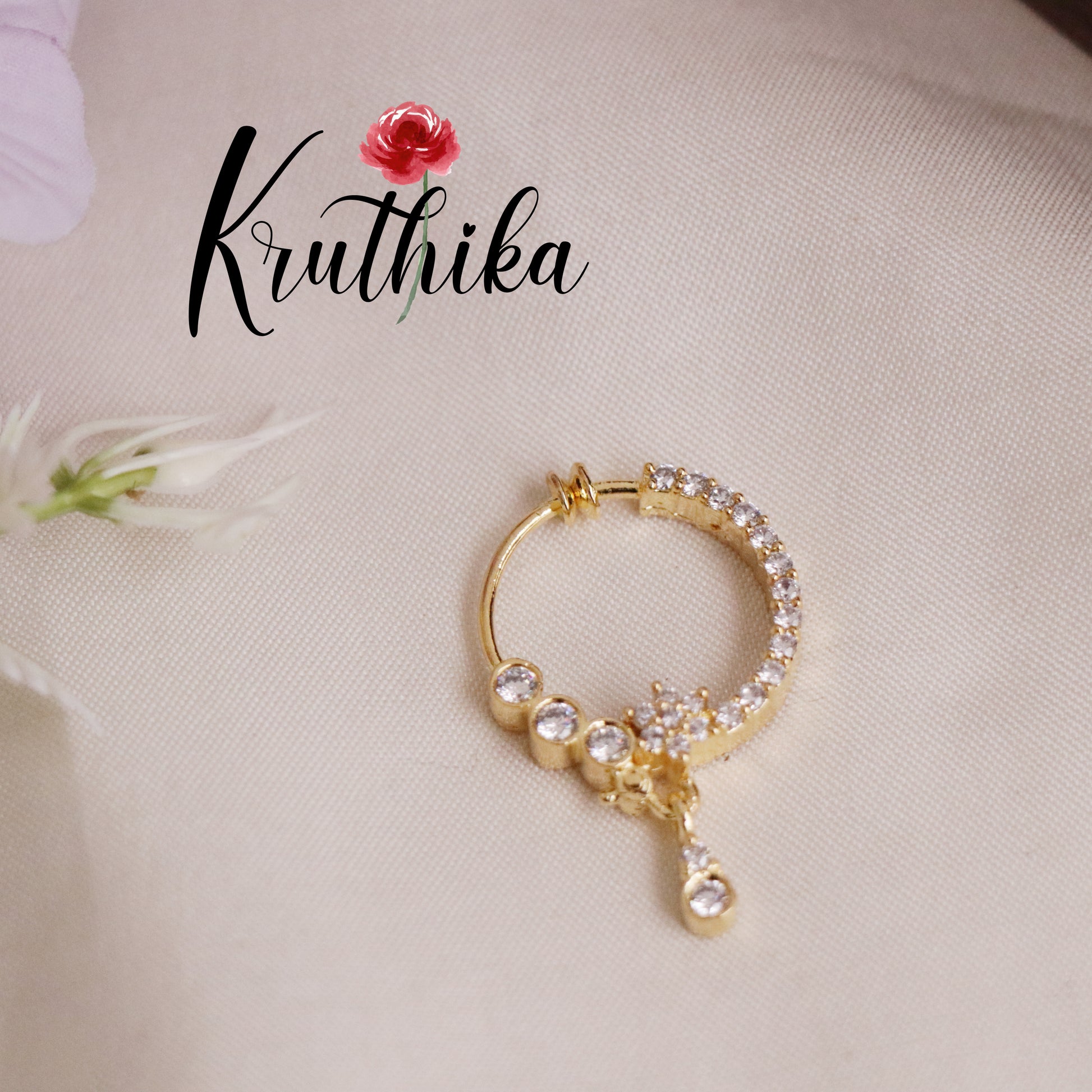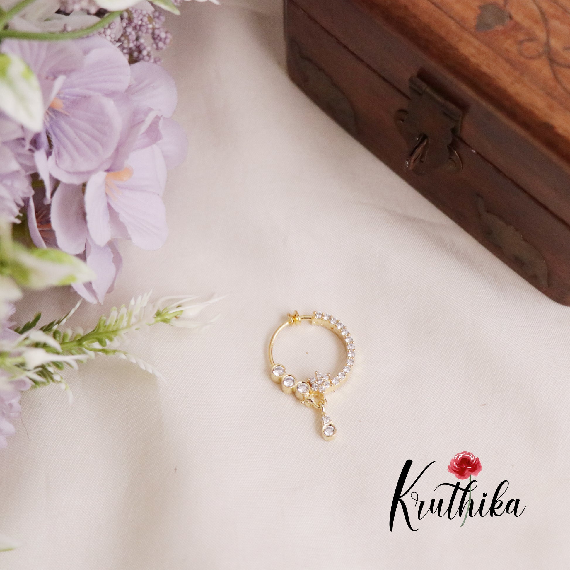 A traditional nose ring, or Nath, with a screw design combines cultural elegance with contemporary convenience. Crafted from high-quality metal, it features intricate detailing, often adorned with CZ stones or filigree patterns. The screw mechanism ensures a secure fit, making it easy to wear while adding a timeless charm to any look. Perfect for festive occasions or everyday elegance, this piece embodies tradition and style.