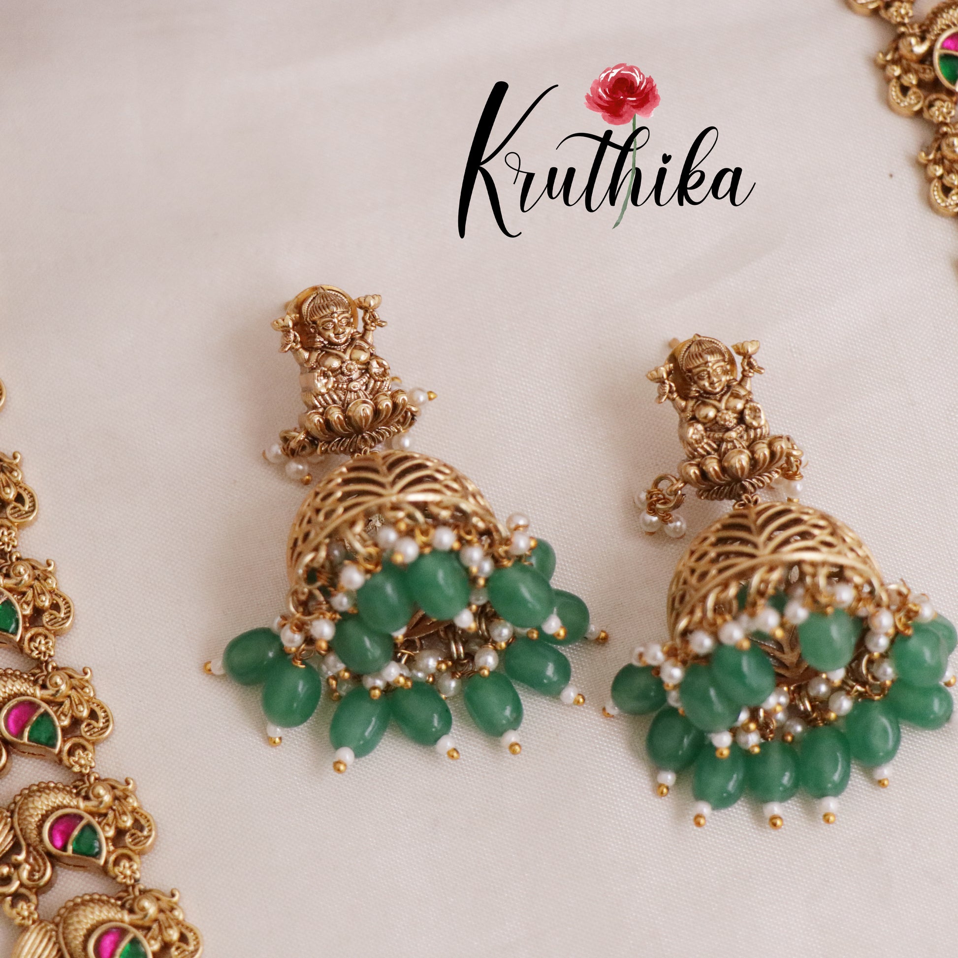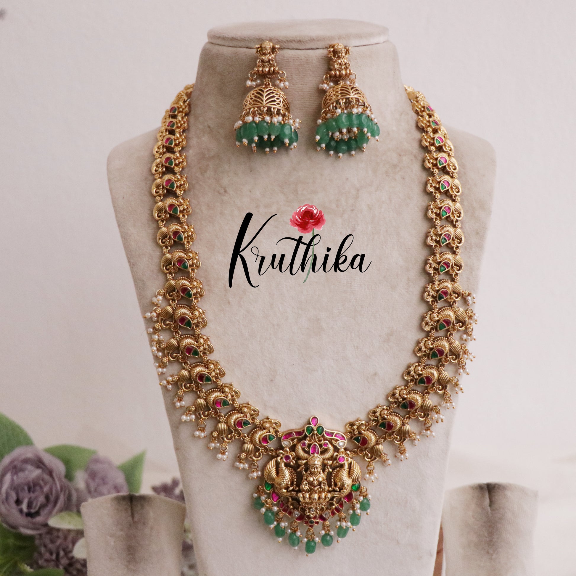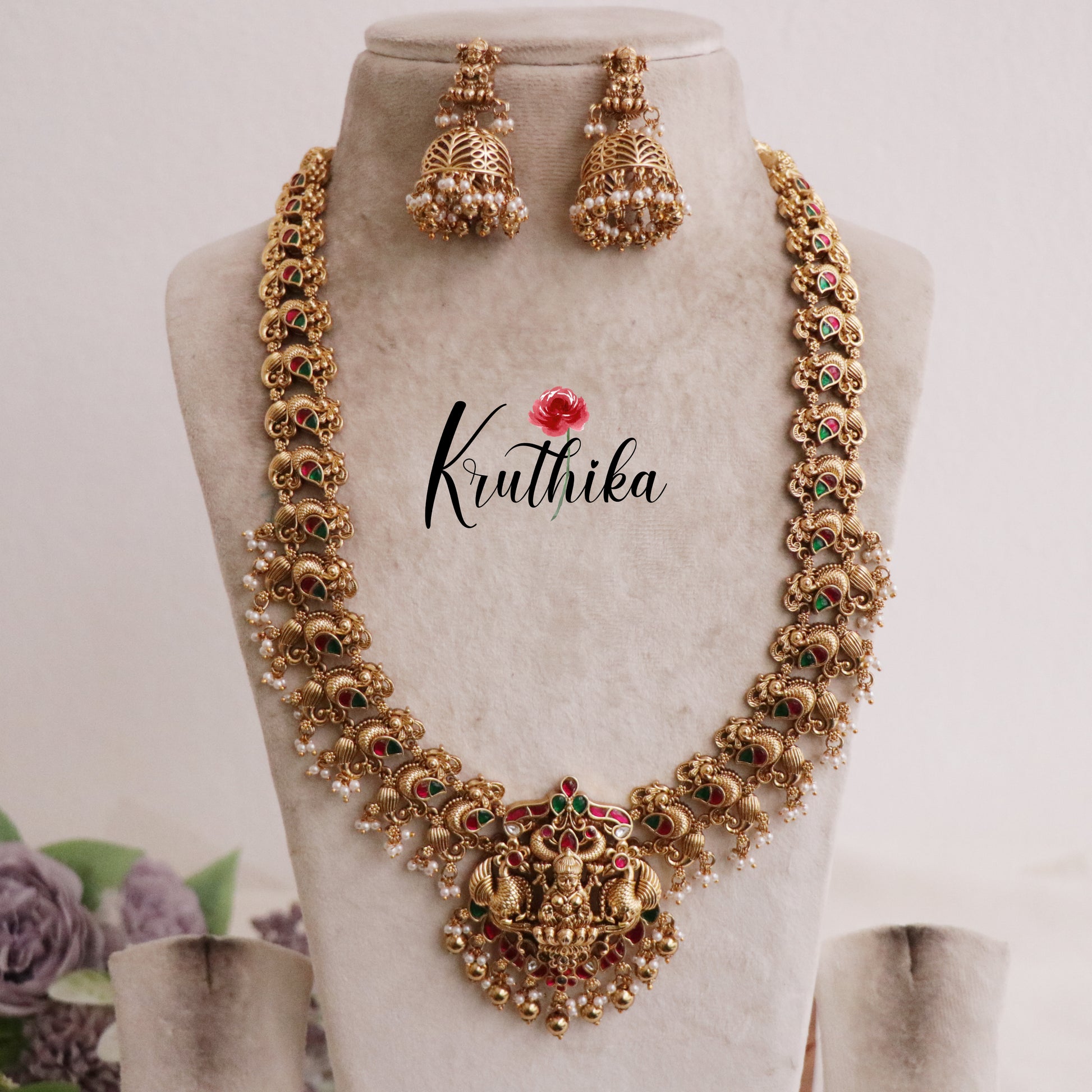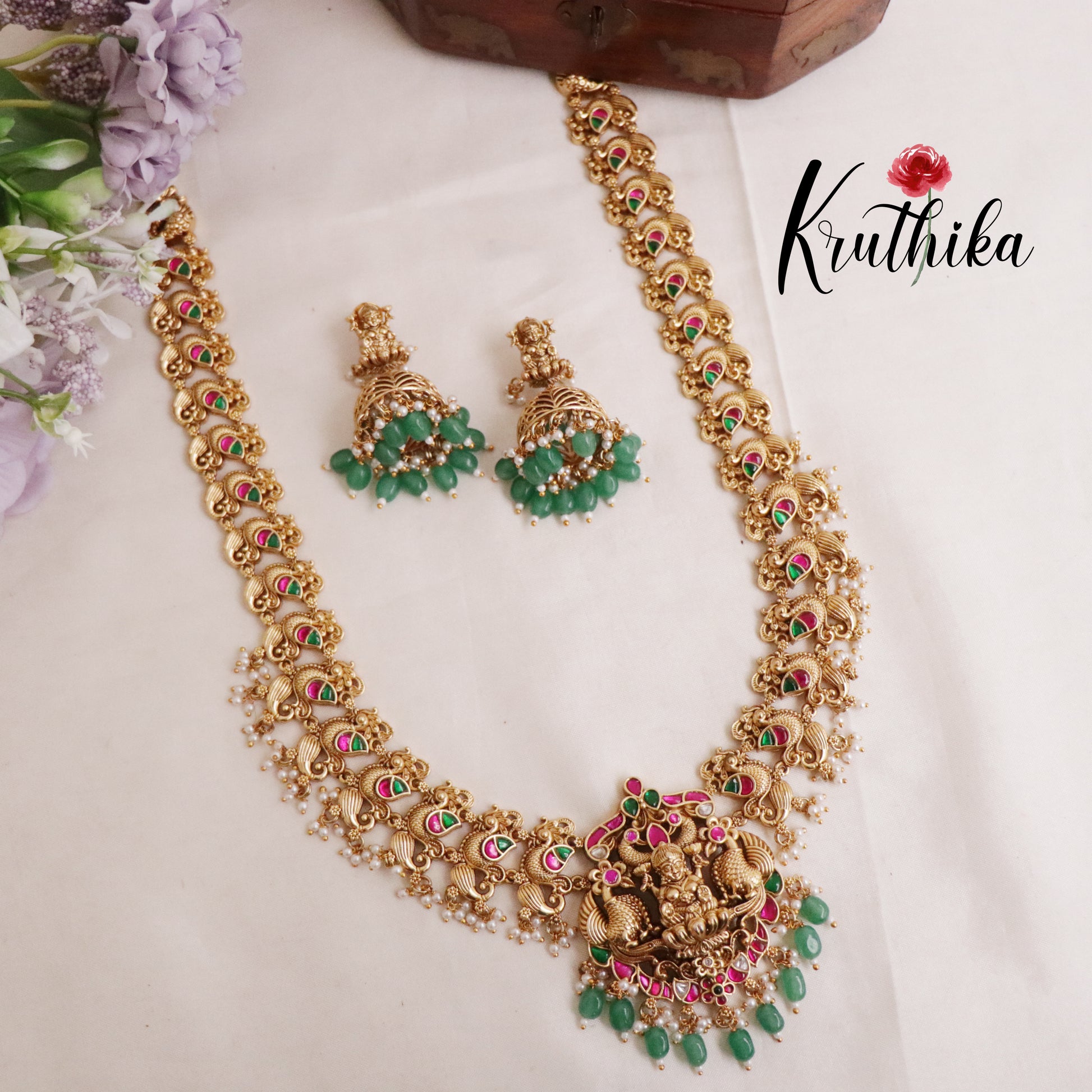 Enhance your style with our stunning, Beautiful Traditional Temple Lakshmi Haaram with Jadau Stones paired perfectly with matching earrings. Crafted with high-quality stones & beads, this set combines timeless elegance with a modern touch. Ideal for special occasions or adding a touch of glamour to your look.