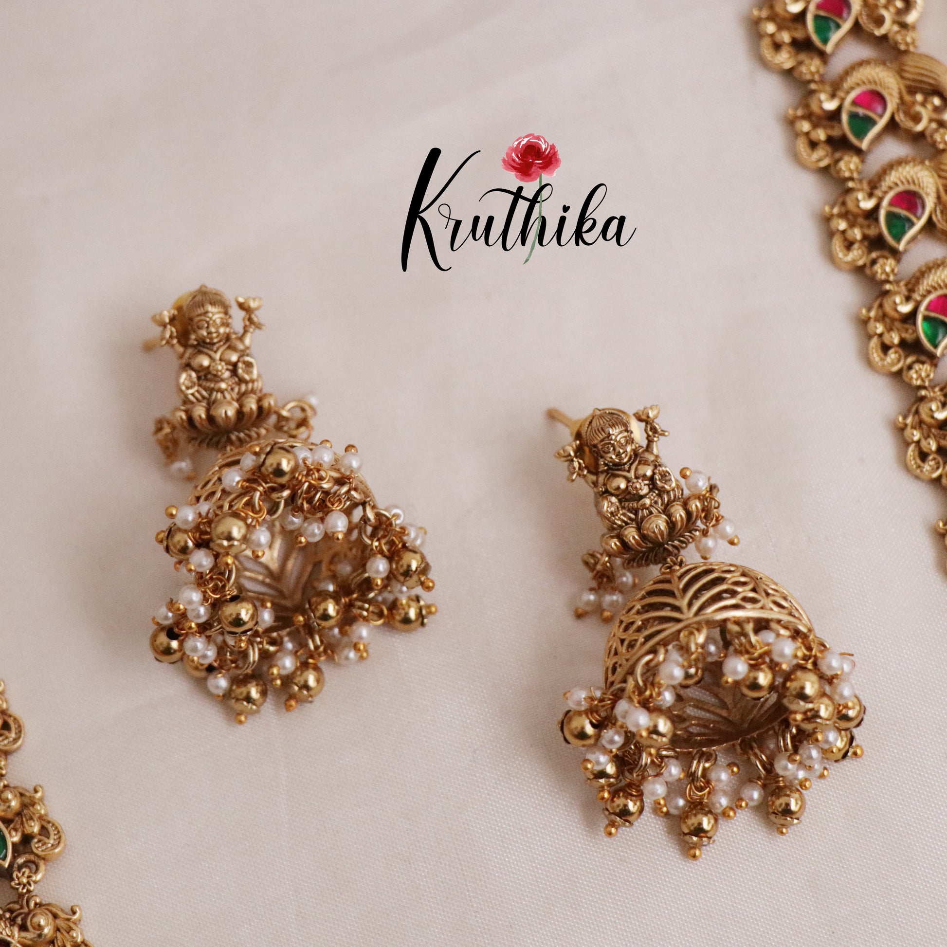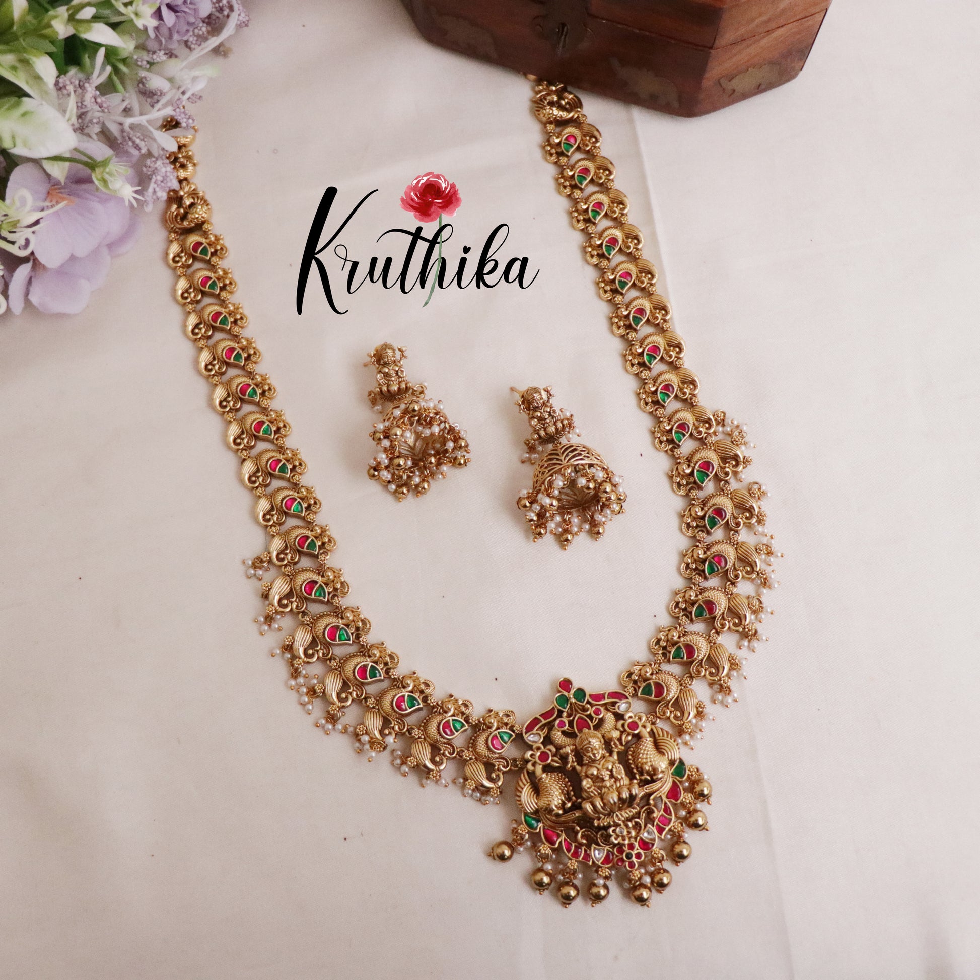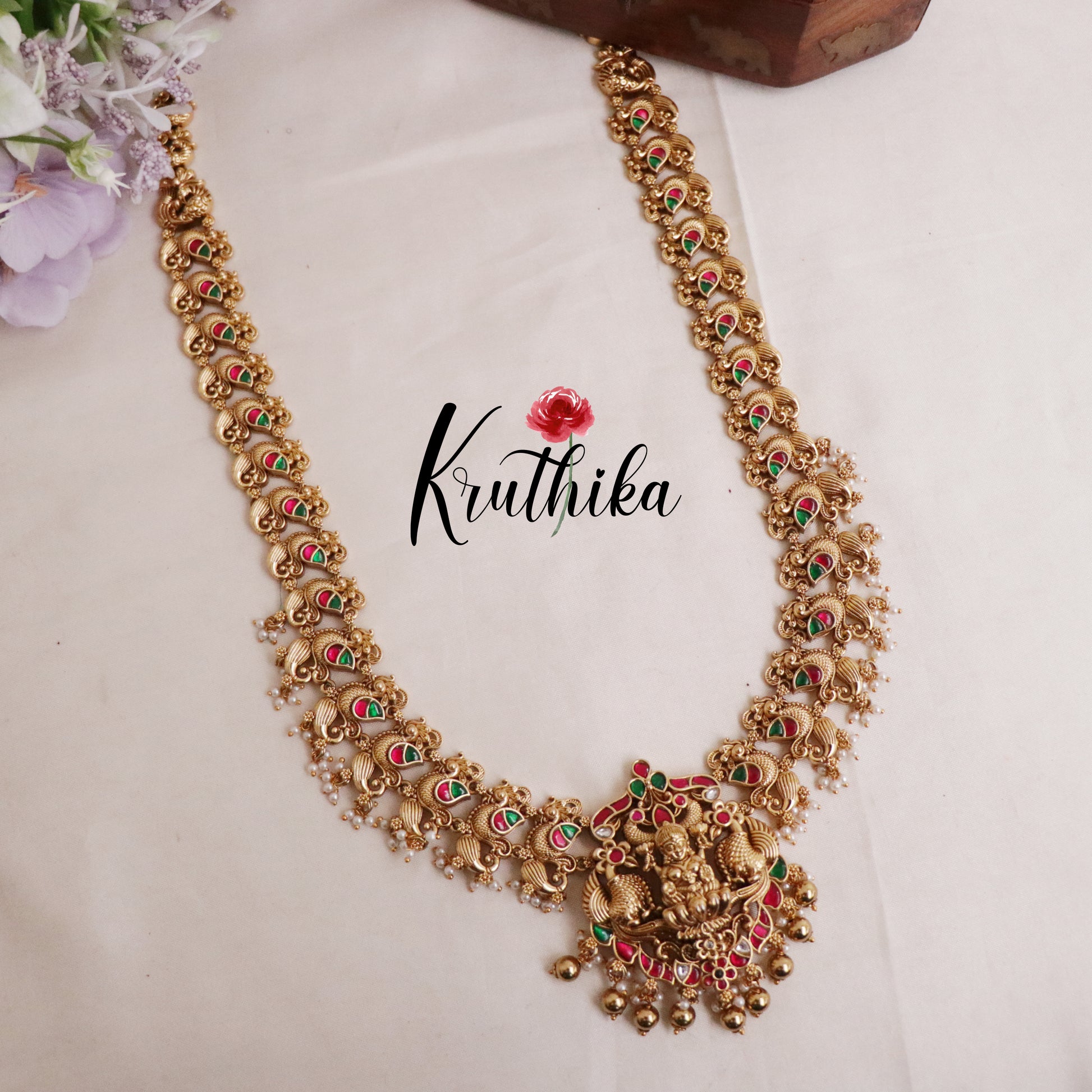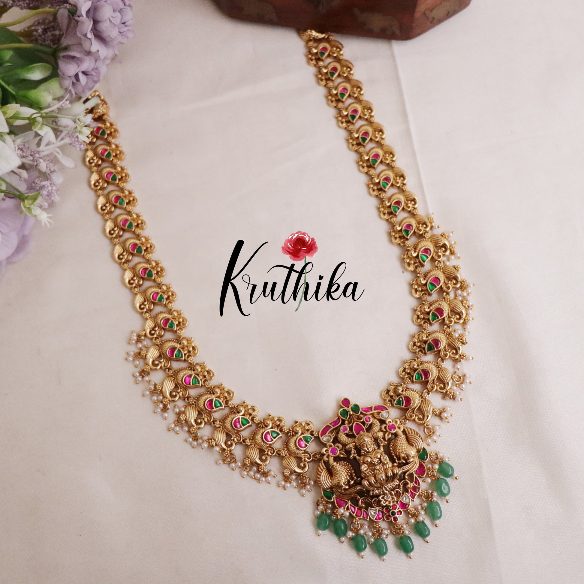 Enhance your style with our stunning, Beautiful Traditional Temple Lakshmi Haaram with Jadau Stones paired perfectly with matching earrings. Crafted with high-quality stones & beads, this set combines timeless elegance with a modern touch. Ideal for special occasions or adding a touch of glamour to your look.