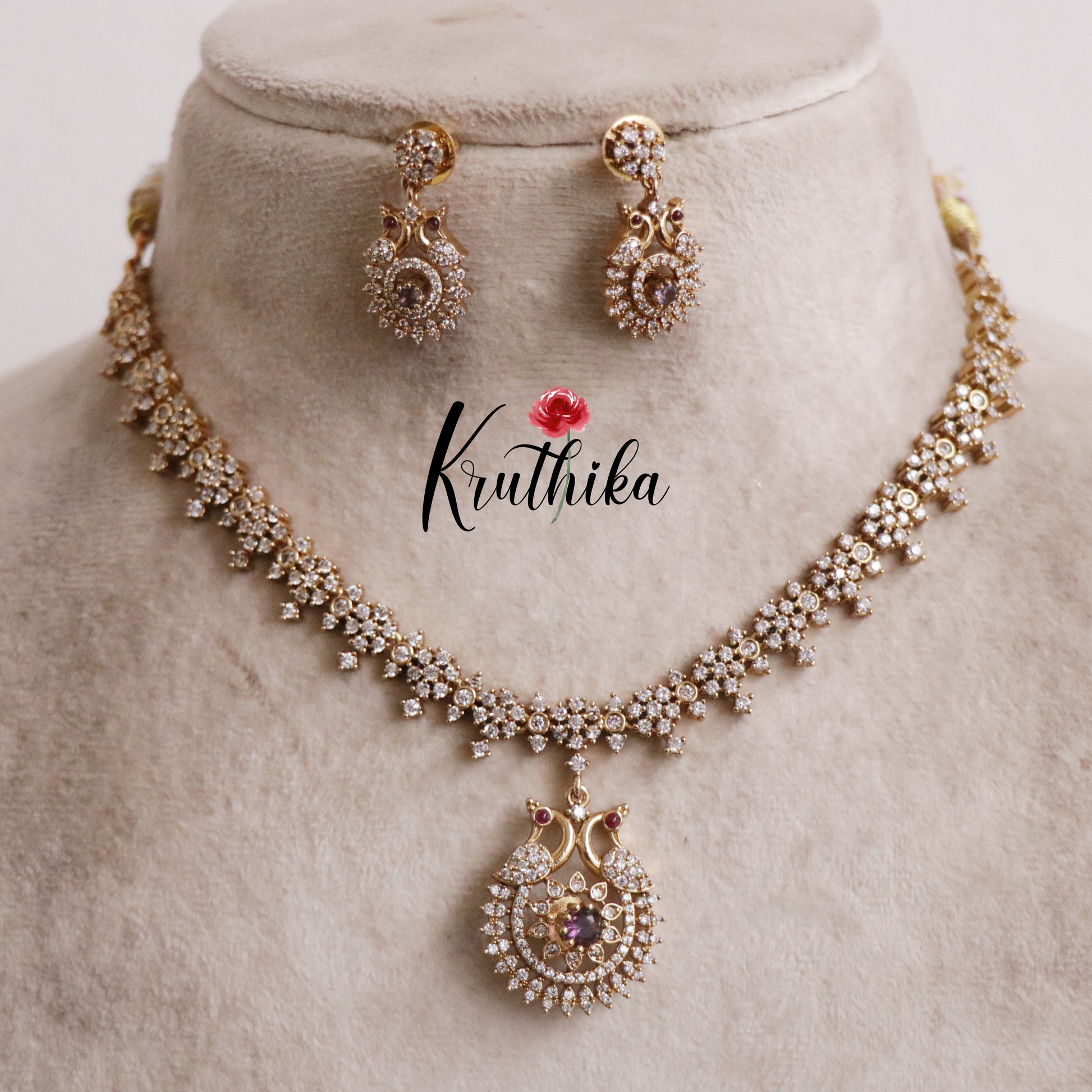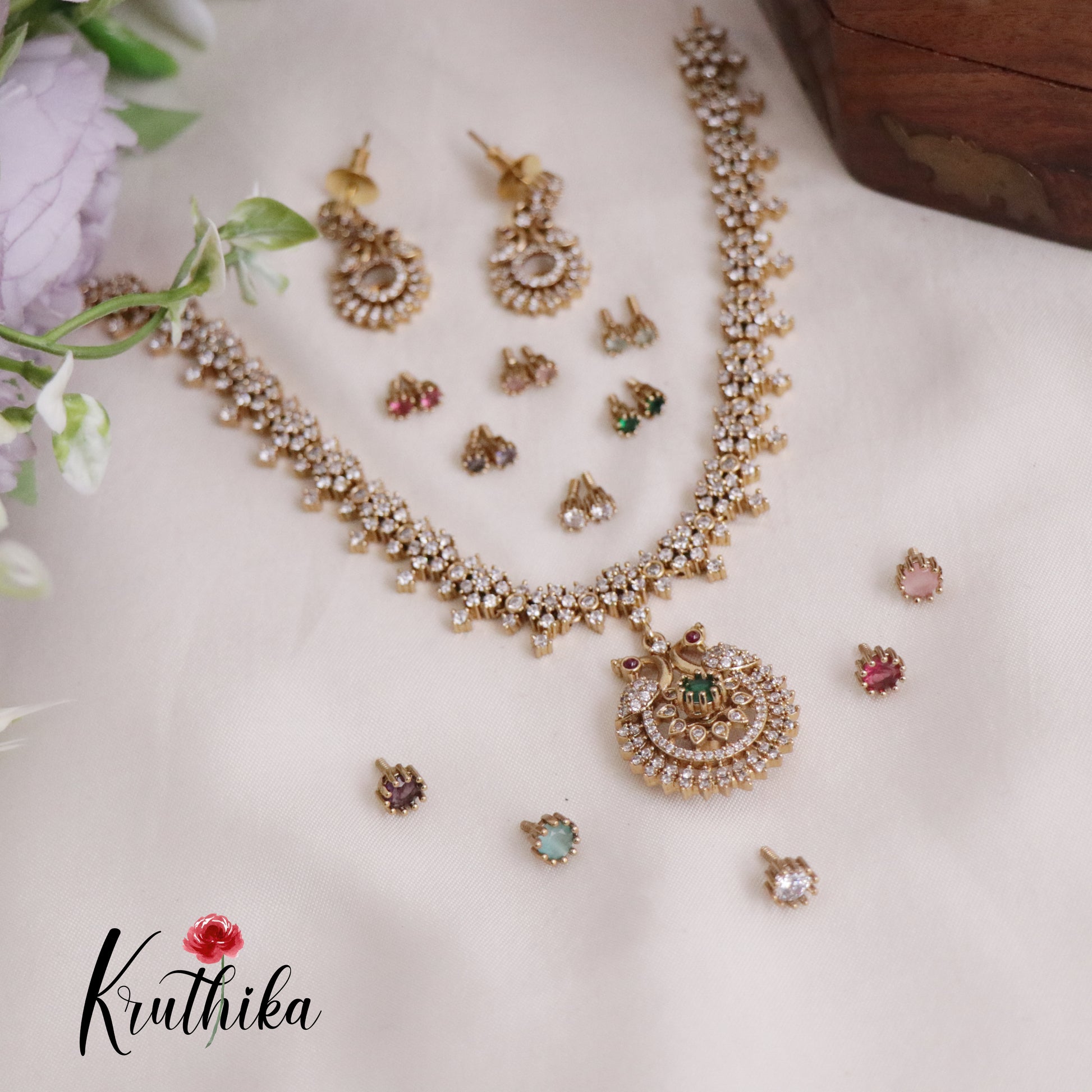 Enhance your style with our stunning, Beautiful Twin CZ Peacock Changeable Necklace Set paired perfectly with matching earrings and Maan Tikka. Crafted with high-quality stones & beads, this set combines timeless elegance with a modern touch. Ideal for special occasions or adding a touch of glamour to your look.