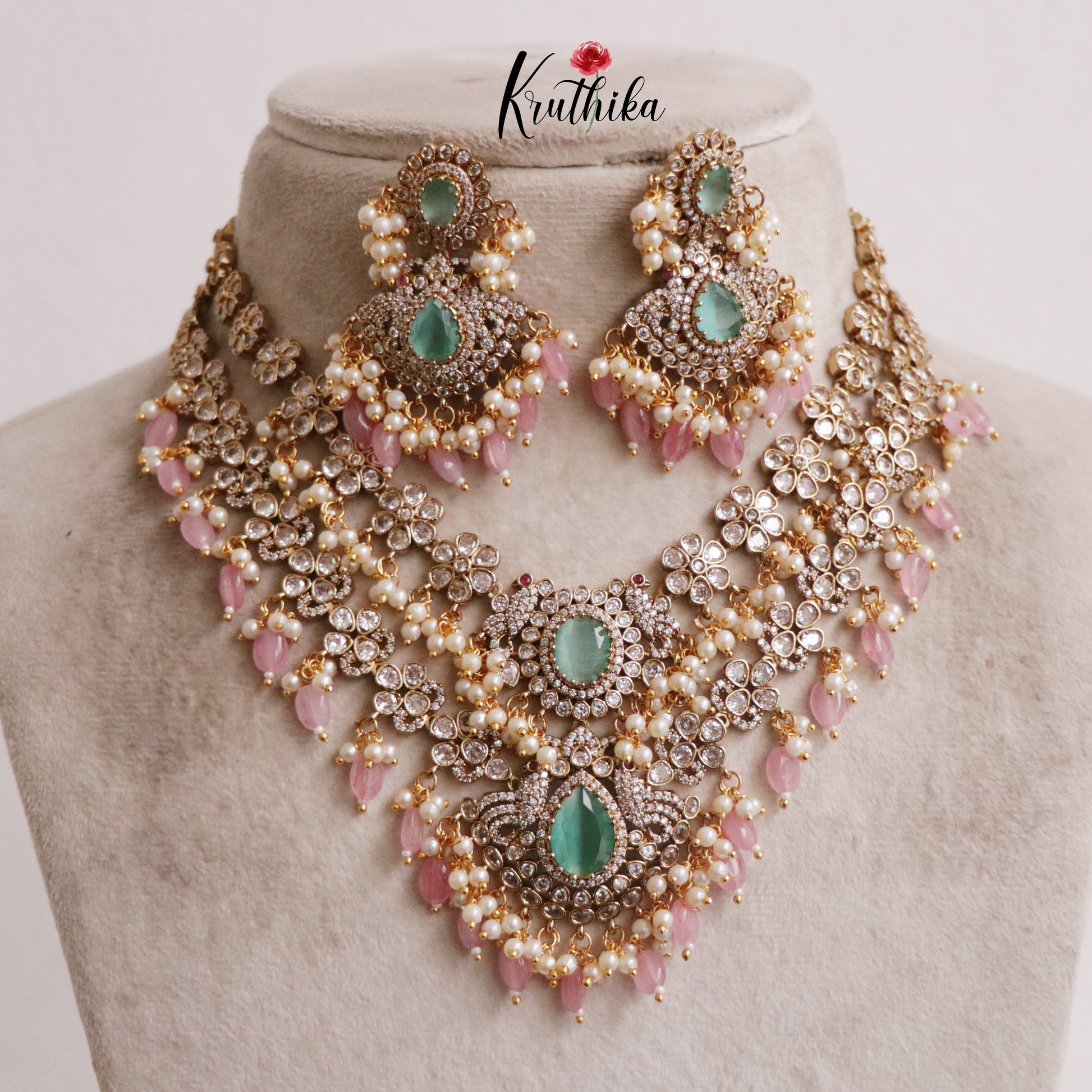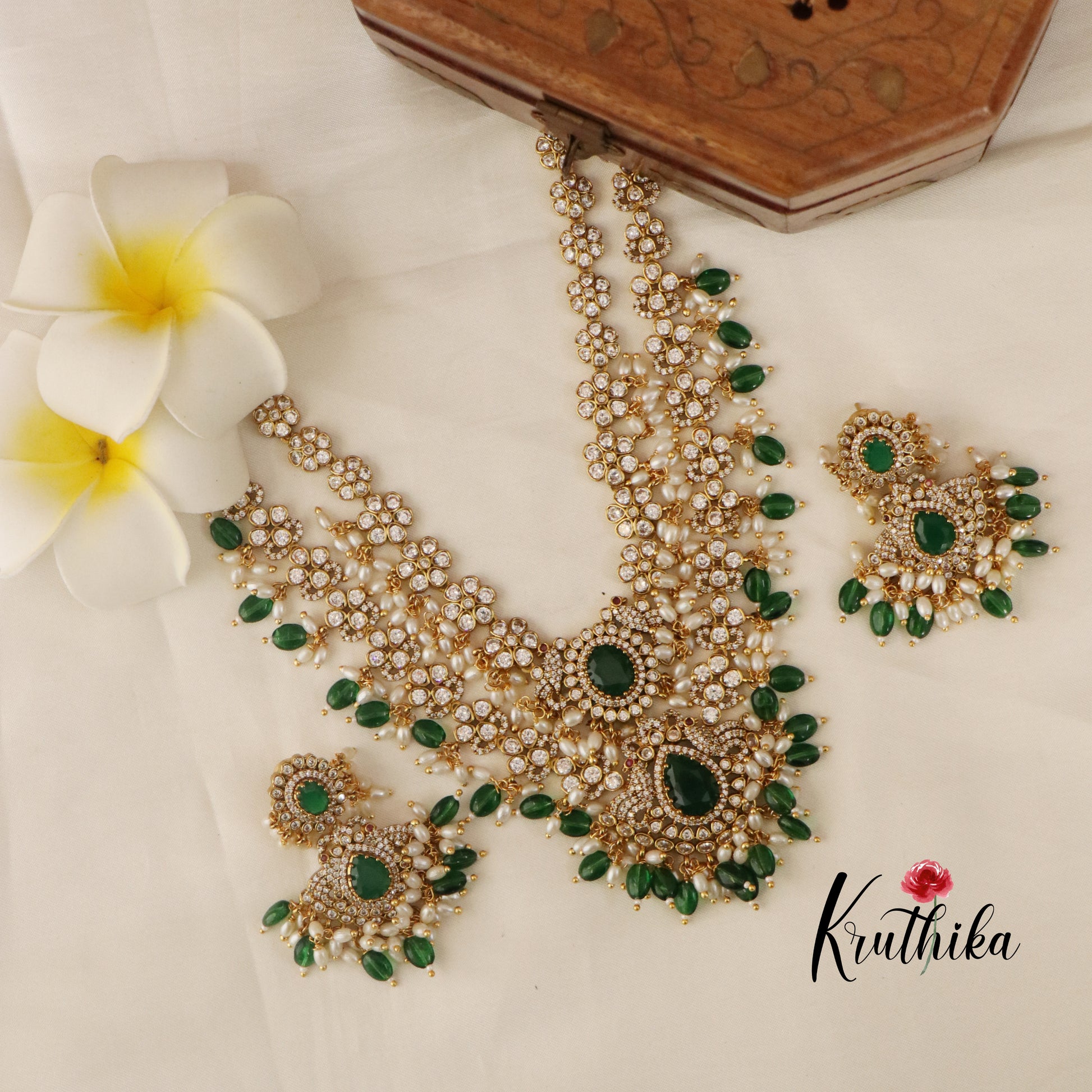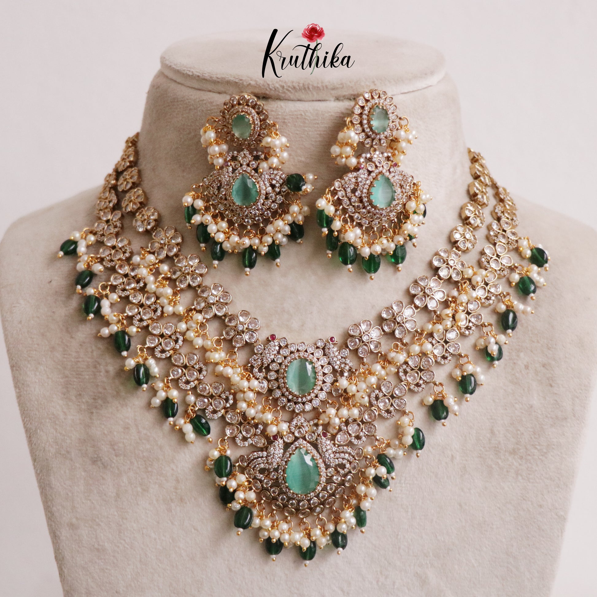 Enhance your style with our stunning Two Layer Victorian Flower Necklace with Green Beads, paired perfectly with matching earrings. Crafted with high-quality stones & beads, this set combines timeless elegance with a modern touch. Ideal for special occasions or adding a touch of glamour to your look.