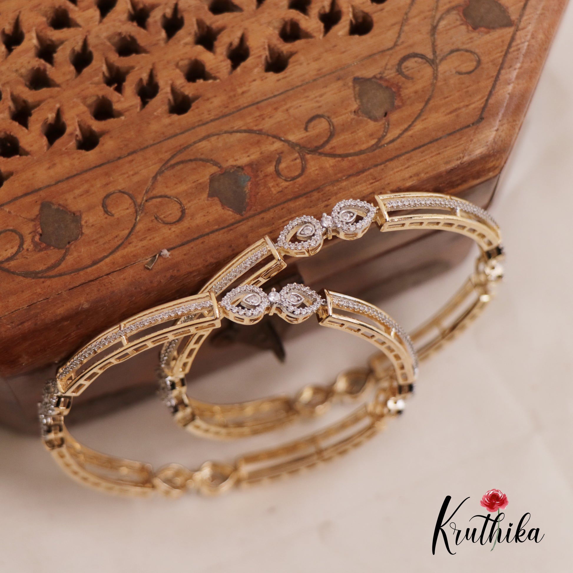 These elegant gold toned bangles feature a sophisticated contemporary design that blends traditional warmth with modern precision. The bands are crafted with a unique cut out geometric framework, accented by parallel rows of shimmering white stones for a touch of brilliance. At the centre, a delicate teardrop motif serves as the focal point, making these bangles a versatile choice for both festive occasions and refined daily wear.