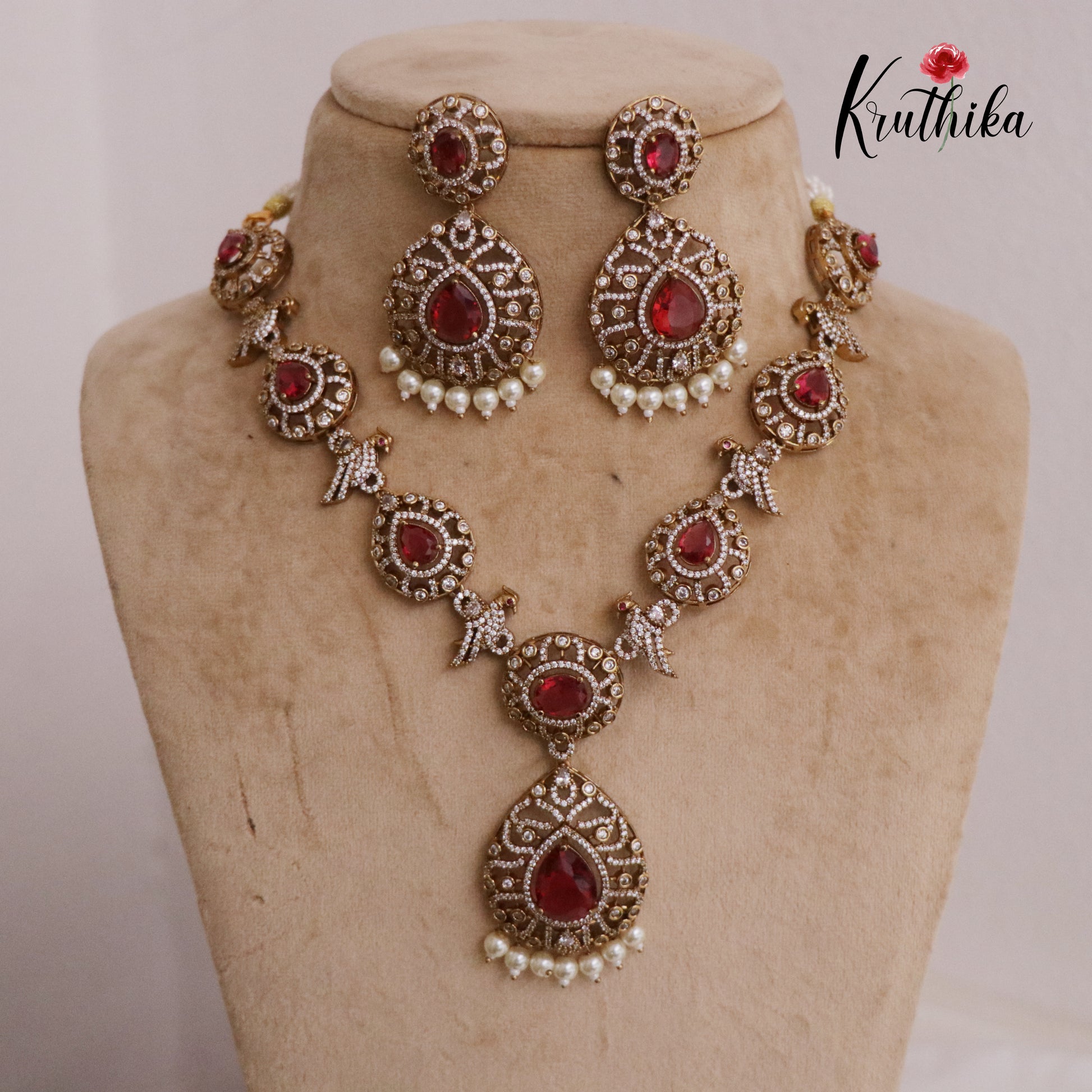 Embrace timeless elegance with this stunning Classic AD Victorian Peacock Necklace, a masterpiece inspired by regal heritage designs. Featuring intricate peacock motifs adorned with lustrous AD stones that catch light beautifully, this necklace brings sophistication to any occasion. Available in two complementary color options, it effortlessly transitions from festive celebrations to everyday wear. The Victorian-inspired craftsmanship ensures lasting quality, while the graceful peacock symbolism adds meaningful charm to your jewelry collection. Perfect for those who appreciate classic beauty with a touch of grandeur.