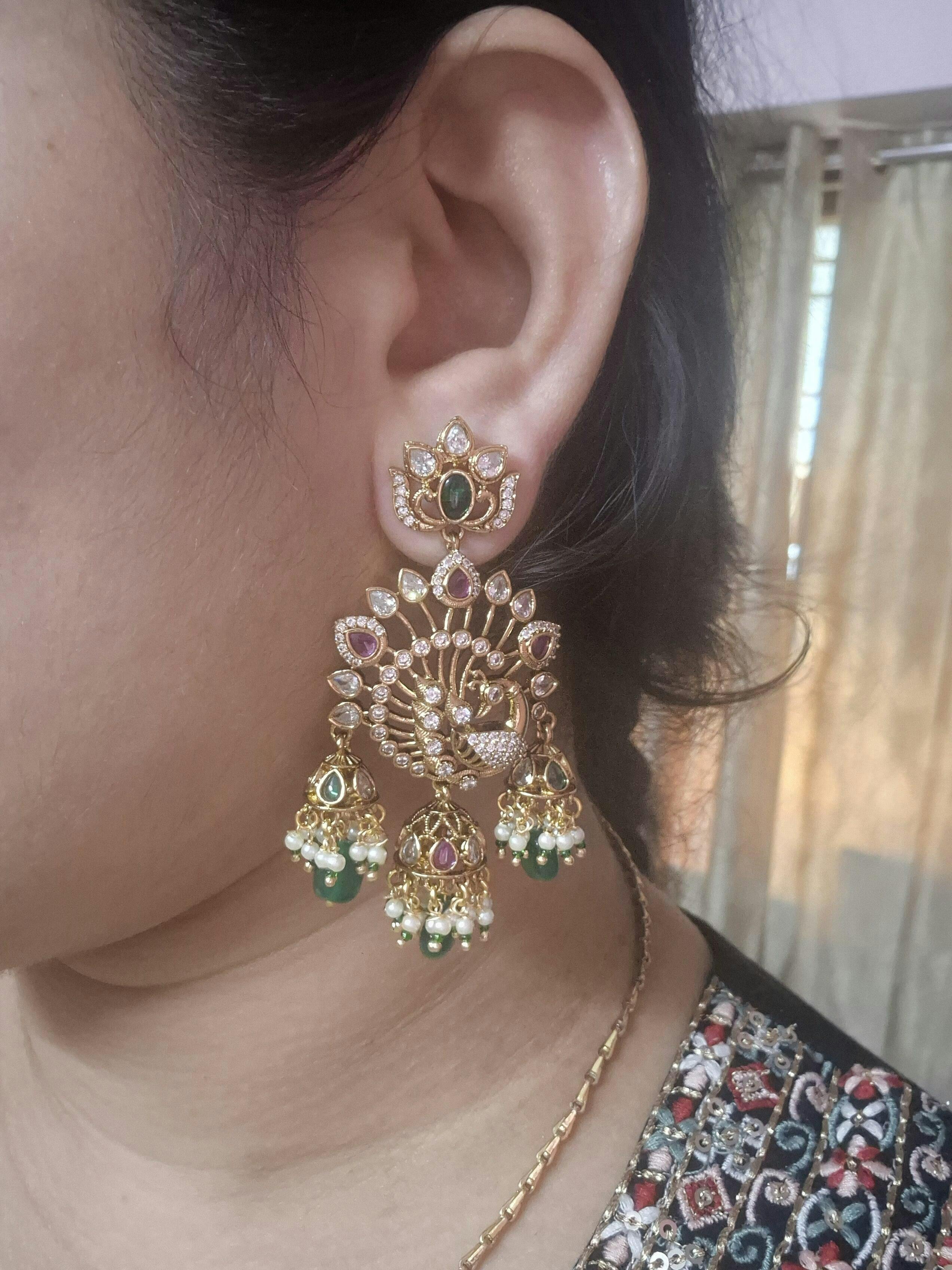 Elevate your ethnic ensemble with these exquisite CZ Peacock Triple Jhumkas, a timeless addition to any jewellery collection. Crafted with precision, these earrings feature intricate peacock motifs adorned with lustrous cubic zirconia stones that catch light beautifully. The classic design ensures versatility, complementing both traditional and contemporary outfits with effortless grace. Available in two stunning colour options, these jhumkas offer flexibility to match your personal style. Perfect for festive occasions, weddings, or everyday elegance, they deliver the sophistication of fine jewellery with accessible luxury. Experience the perfect blend of artistry and quality craftsmanship.