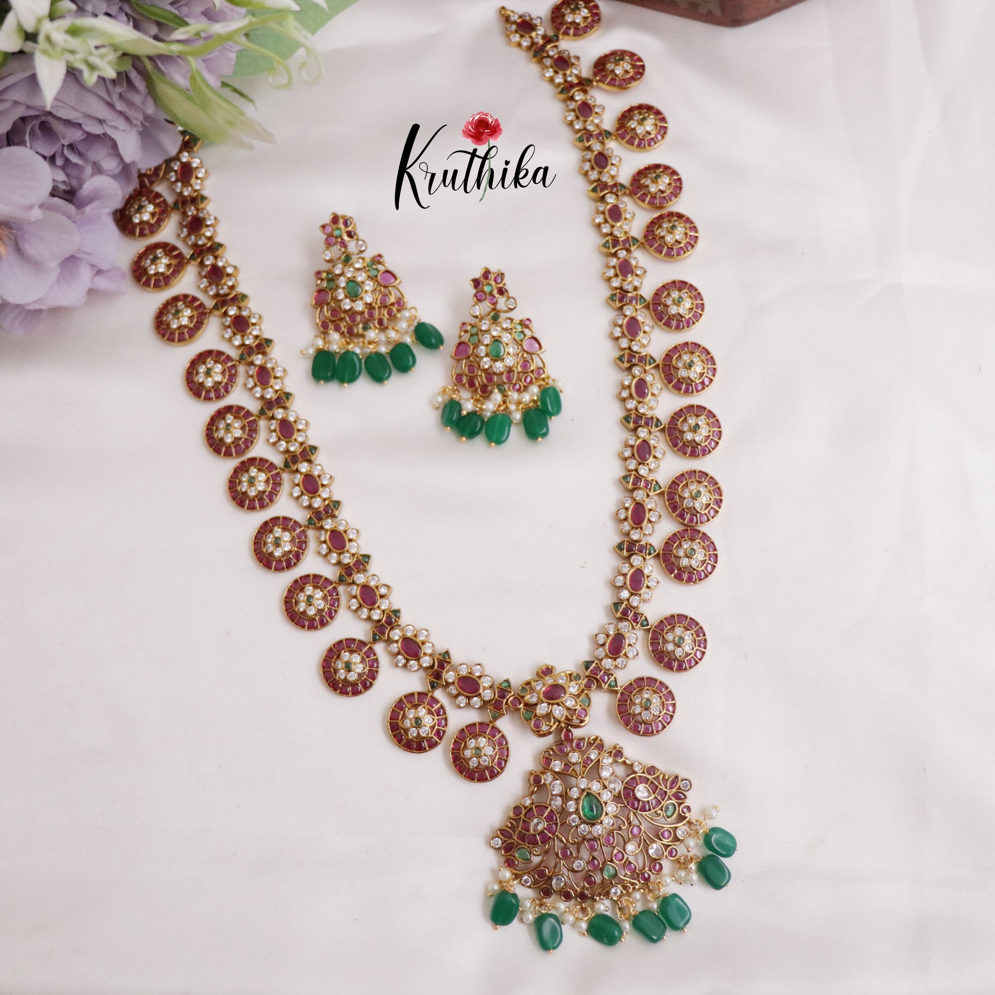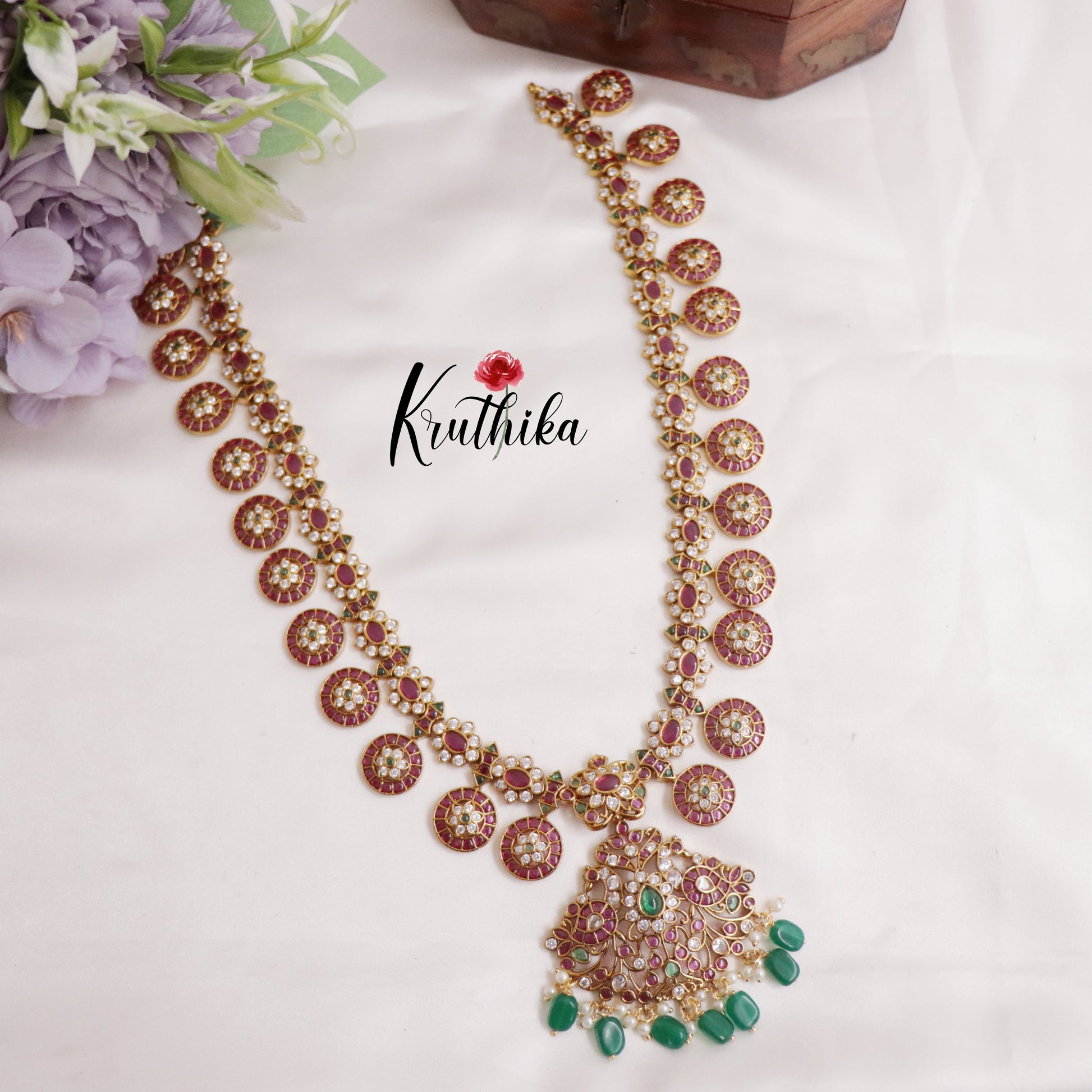 Enhance your style with our stunning, Classic Kemp Kasu Haaram with Detachable Pendant with Green Beads Drops Crafted with high-quality stones & beads, this set combines timeless elegance with a modern touch. Ideal for special occasions or adding a touch of glamour to your look.