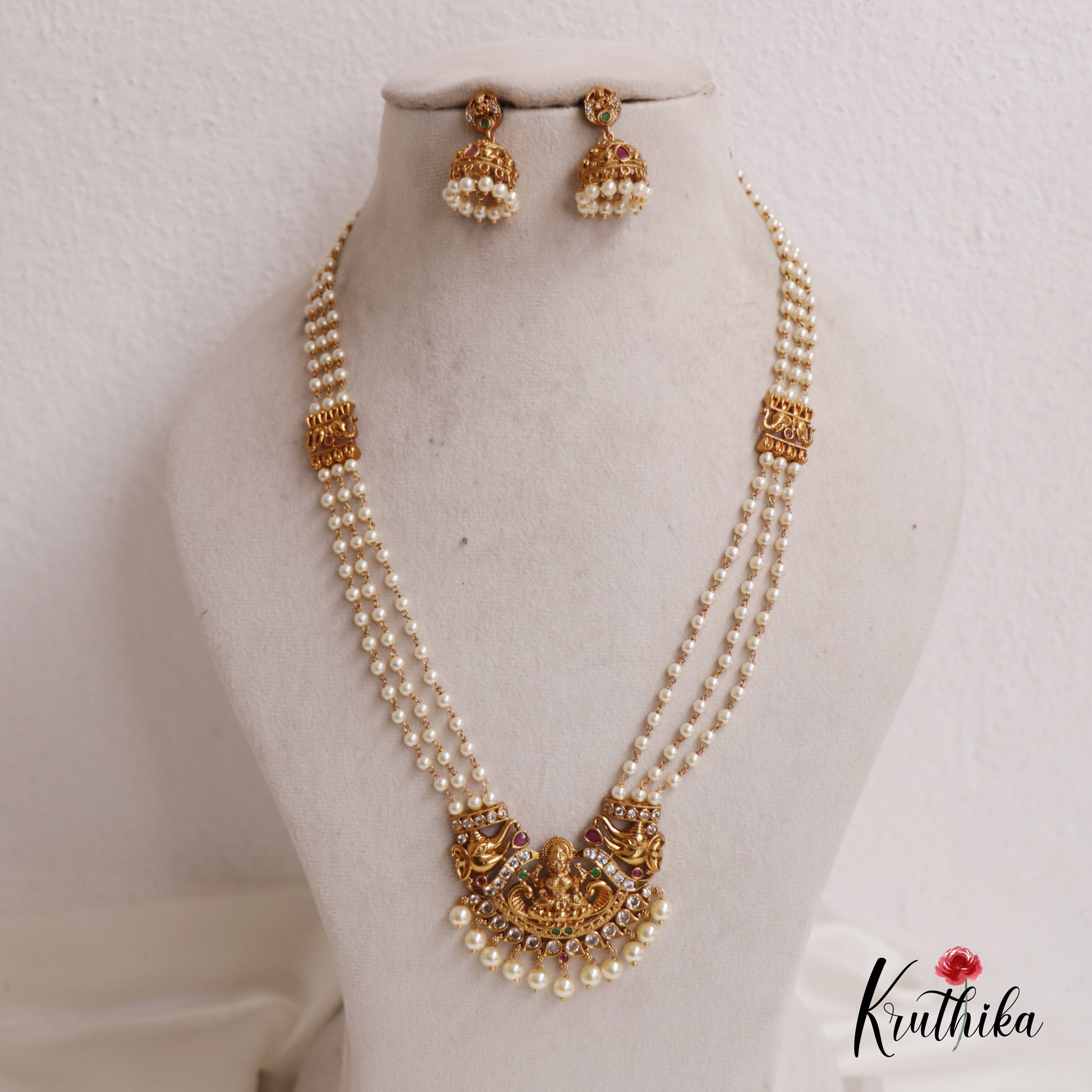 This Classic jewelry set features a triple layered pearl haaram paired with matching Jhumka earrings, embodying a classic South Indian aesthetic. The centerpiece is a stunning Temple jewelry style pendant in an antique gold finish, intricately handcrafted with a traditional lakshmi motif and accented by delicate pearl droplets. The multi strand pearl chain is punctuated by ornate gold toned spacers, making this a timeless accessory perfect for weddings, festivals or formal ethnic celebrations.