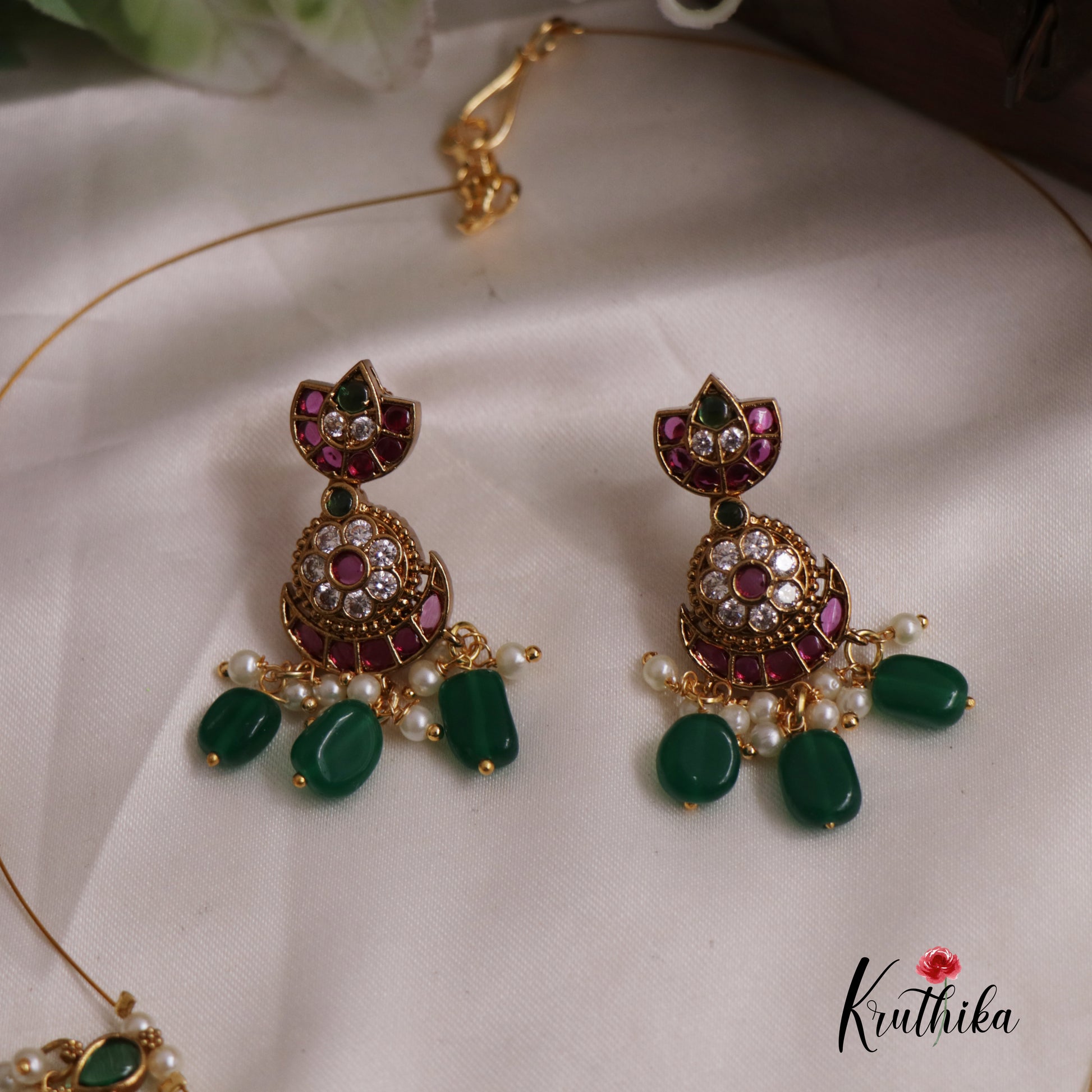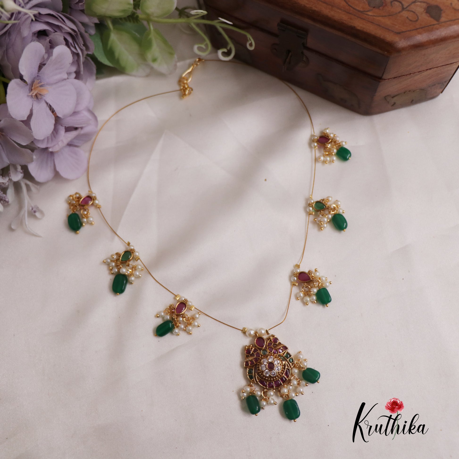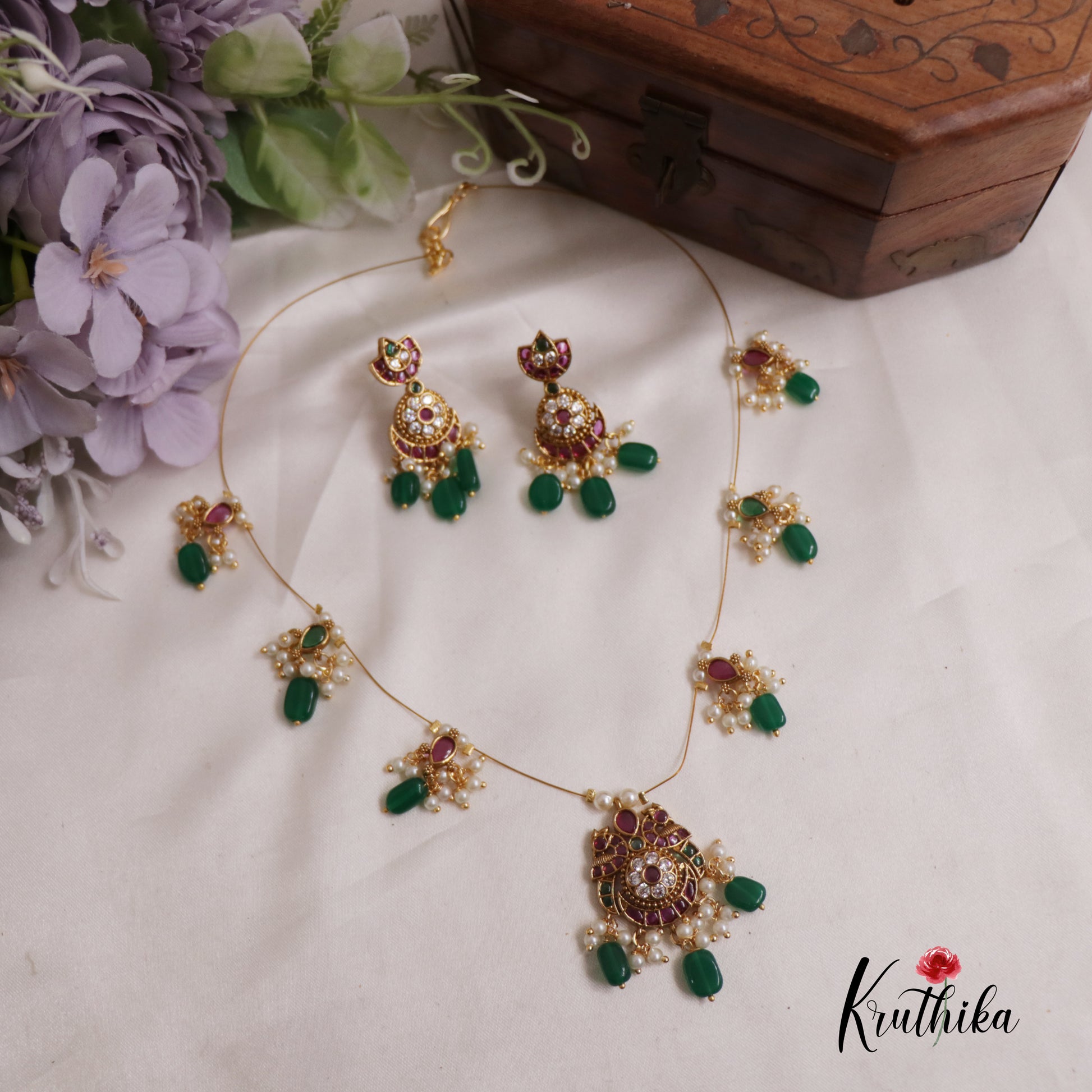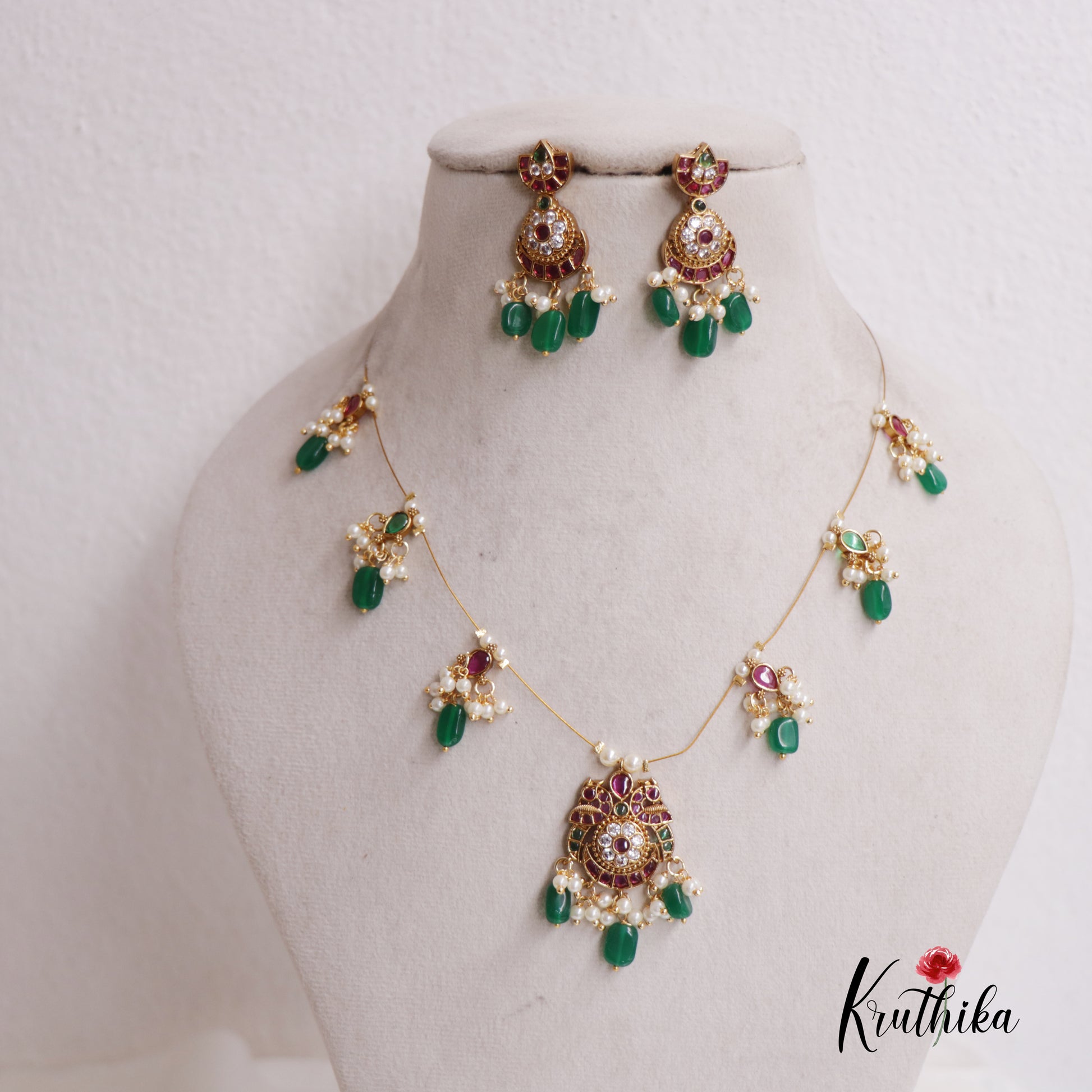 A masterpiece of traditional elegance, this ornate set features intricate gold-work paired with rich Pink Kemp stones and delicate teardrop Green Pearl accents. The "invisible" strand design allows the regal pendant and matching chandelier earrings to take centre stage, offering a timeless look for your most celebrated marriage, ceremonies and special occasions.
