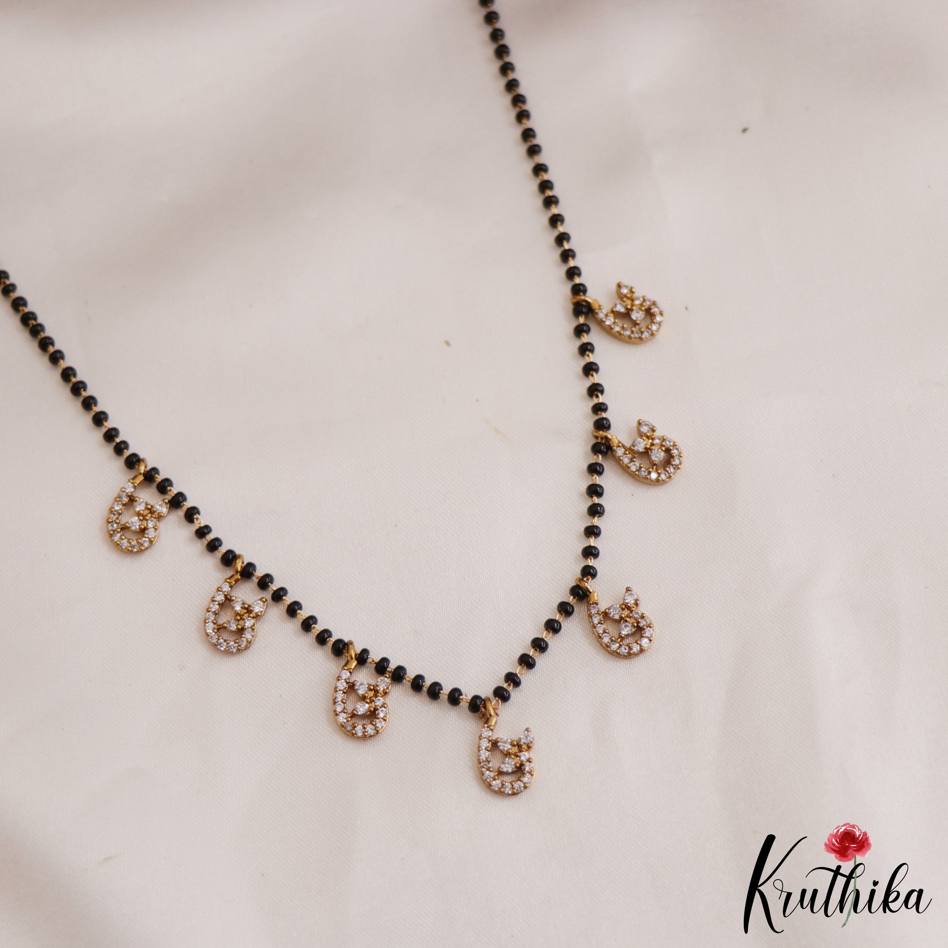 This elegant mangalsutra offers a contemporary twist on a sacred tradition, blending cultural significance with modern aesthetics. It features a delicate strand of classic black beads accented by a series of seven gracefully curved, stone studded charms that catch the light with every movement. This minimalist piece is perfect for the modern woman who seeks a versatile accessory that transitions effortlessly from daily wear to special occasions.