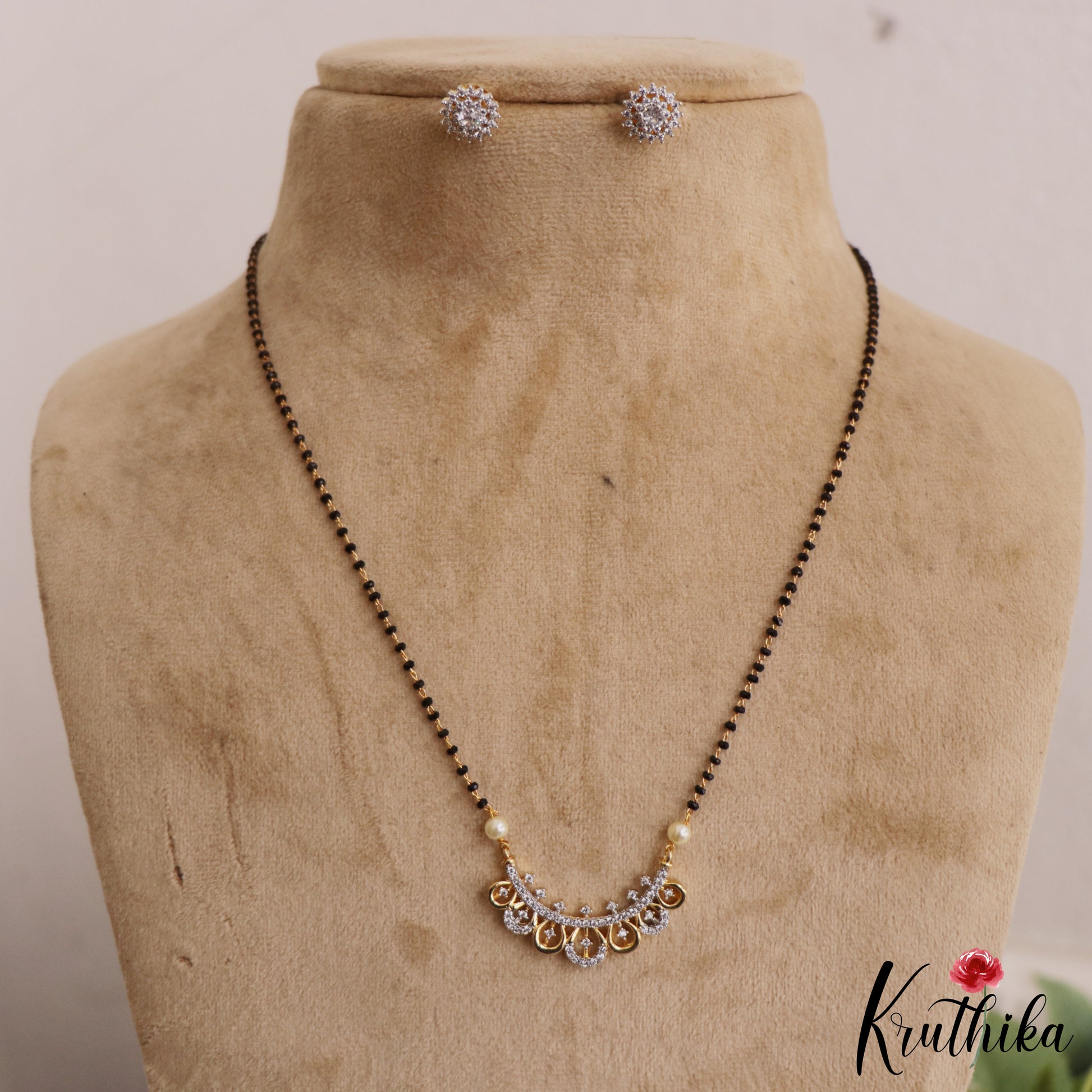 This elegant mangalsutra and earring set blends traditional symbolism with contemporary grace. The necklace features a delicate single strand of classic black beads leading to a refined, crescent shaped pendant adorned with shimmering white stones and intricate gold toned metalwork. Complementing the set are matching round stud earrings that mirror the brilliant stonework of the pendant. Designed with a lightweight and minimalist aesthetic, this set is perfect for everyday wear or special occasions, offering a sophisticated touch to any attire.