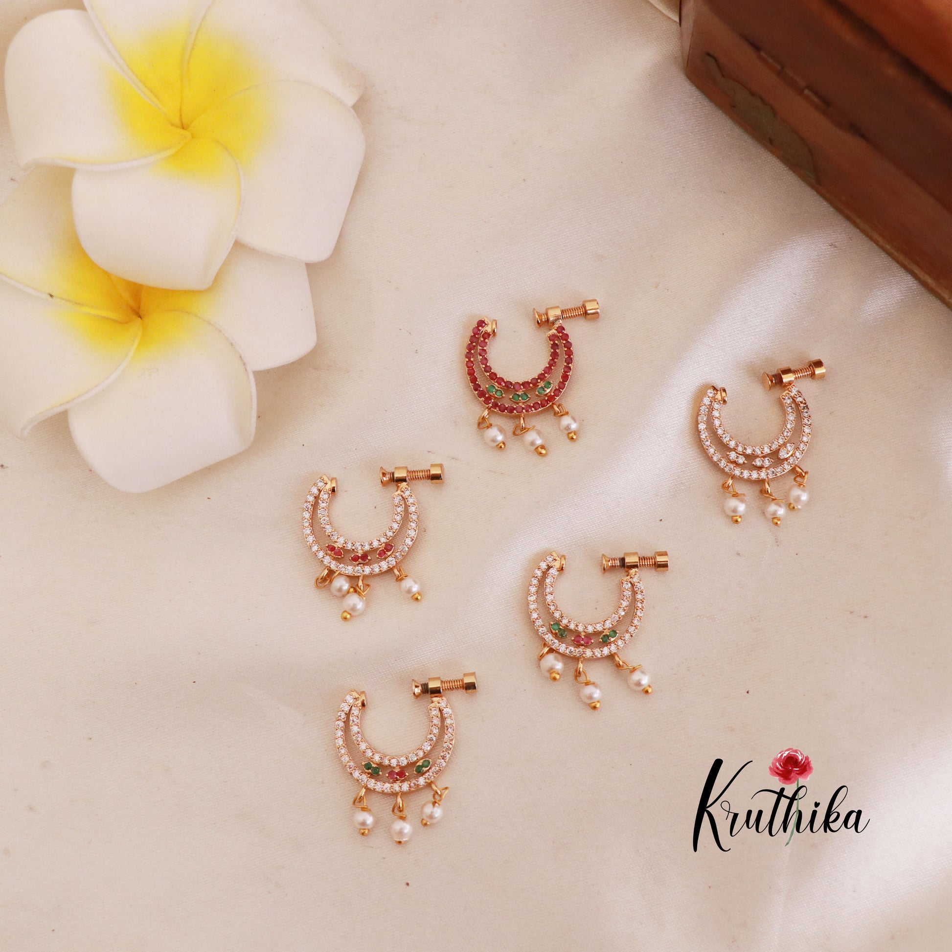 A traditional nose ring, or Nath, with a screw design combines cultural elegance with contemporary convenience. Crafted from high-quality metal, it features intricate detailing, often adorned with CZ stones or filigree patterns. The screw mechanism ensures a secure fit, making it easy to wear while adding a timeless charm to any look. Perfect for festive occasions or everyday elegance, this piece embodies tradition and style.
