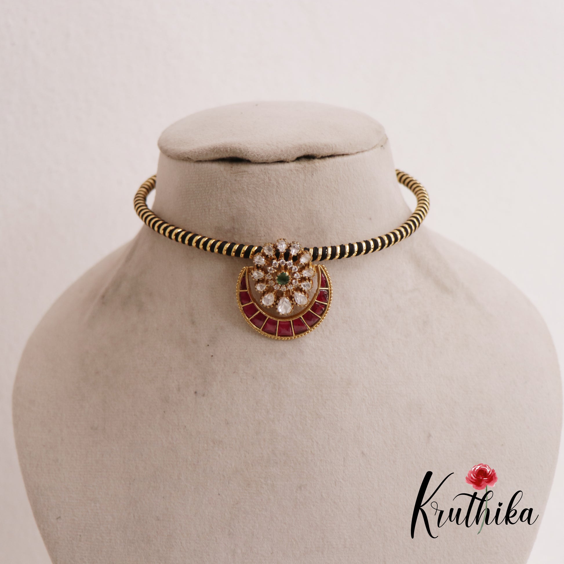 This elegant Hasli necklace features a contemporary twist on traditional Indian artistry. The centerpiece is a stunning Jadau pendant, crafted with a floral cluster of shimmering white stones and a vibrant ruby red crescent base. The pendant is anchored by a flexible, accented with delicate line wrapping for a sophisticated, textured finish. Combining the regal charm of heritage jewelry with a modern, minimalist, this piece is a versatile statement accessory perfect for both festive occasions and elegant evening wear.