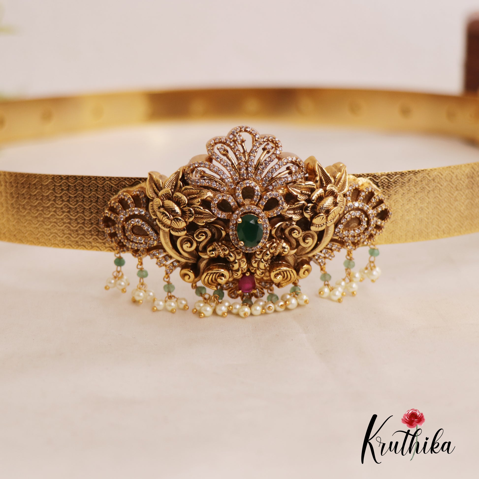 This elegant Hip Belt a meticulously textured gold finish band that offers a modern, sleek fit. The centrepiece is a stunning floral inspired medallion intricately detailed with sparkling stones, a vibrant emerald green centre and delicate ruby accents. Finished with graceful pearl and bead clusters that dangle subtly, this traditional waist belt is the perfect statement piece to elevate your ethnic attire with a touch of timeless royalty.