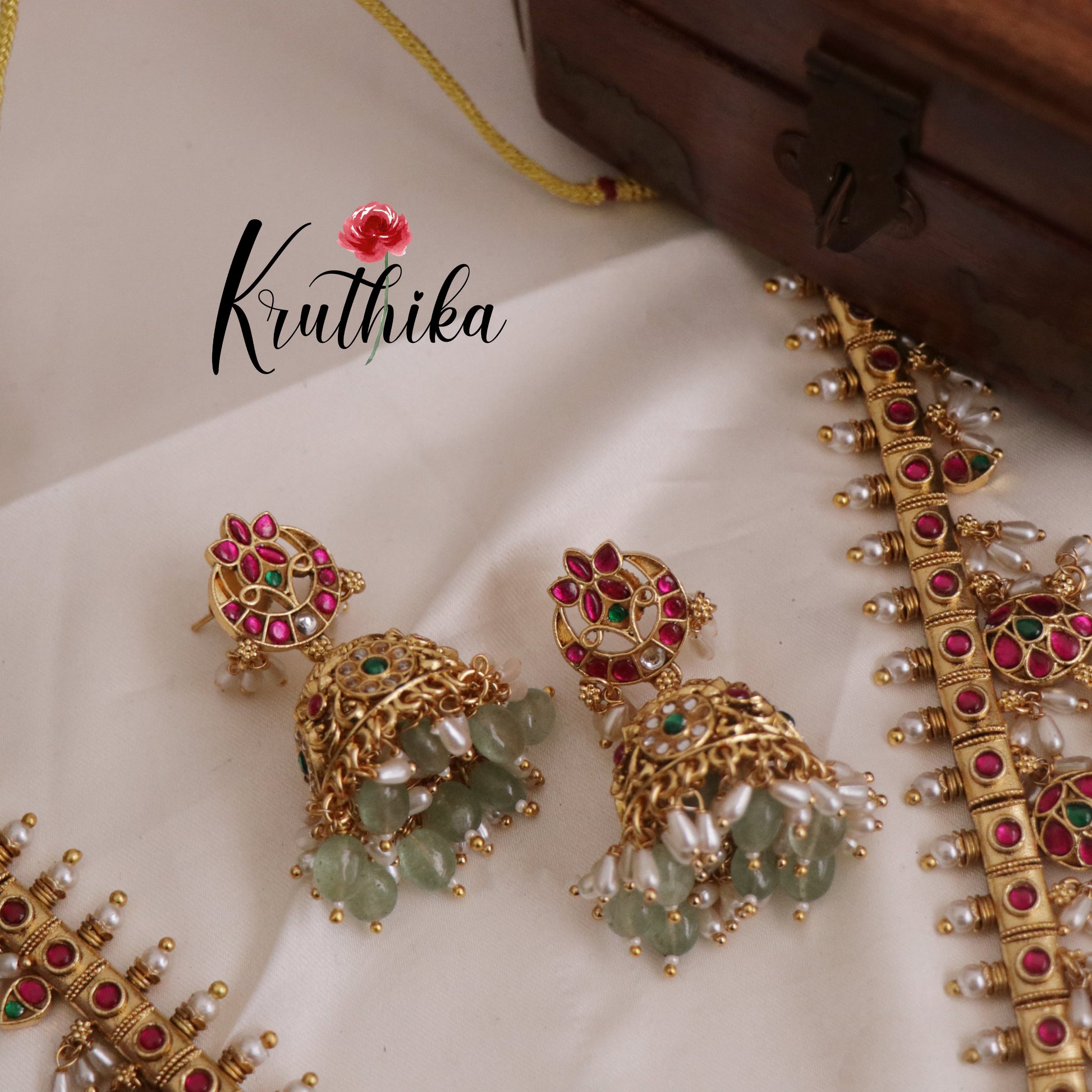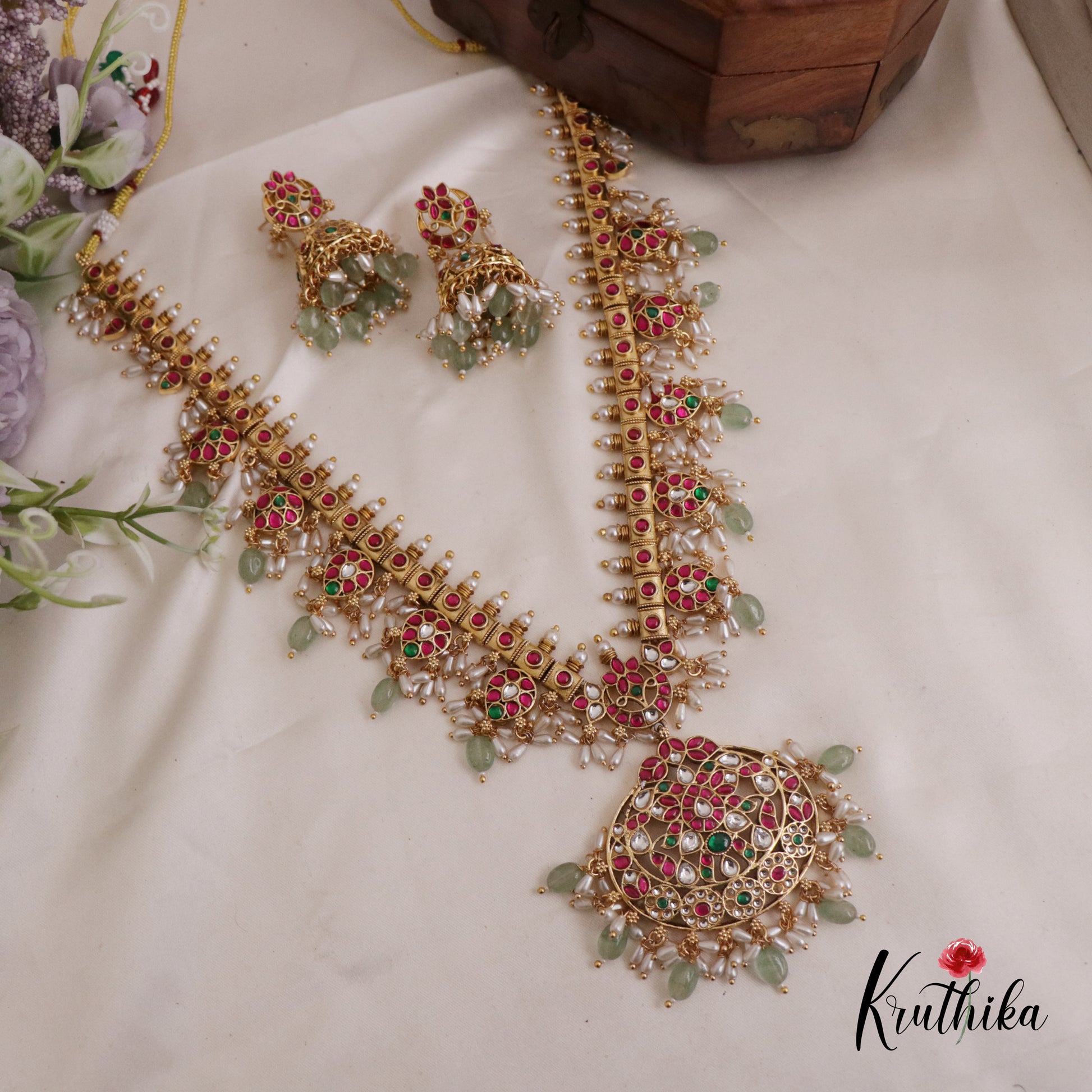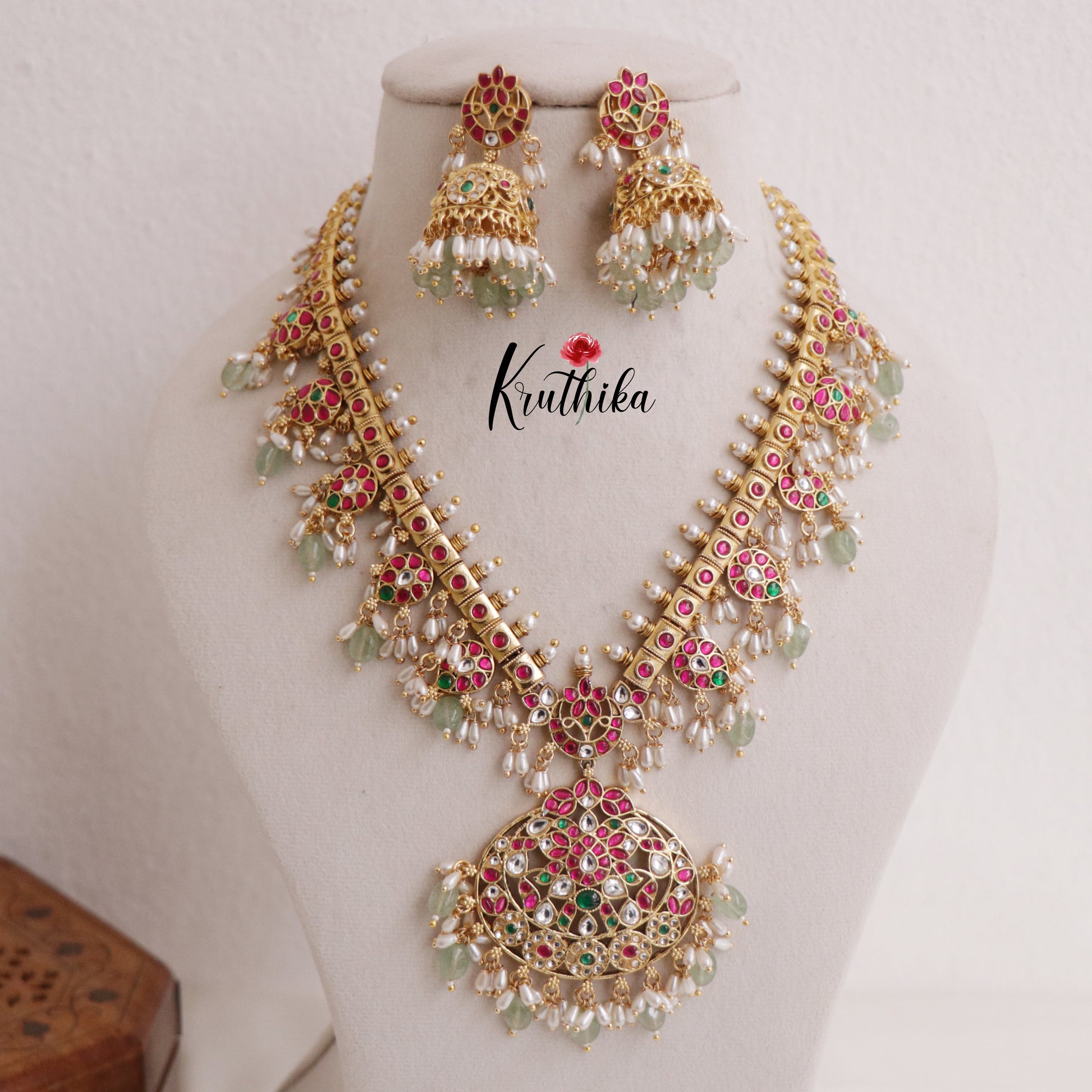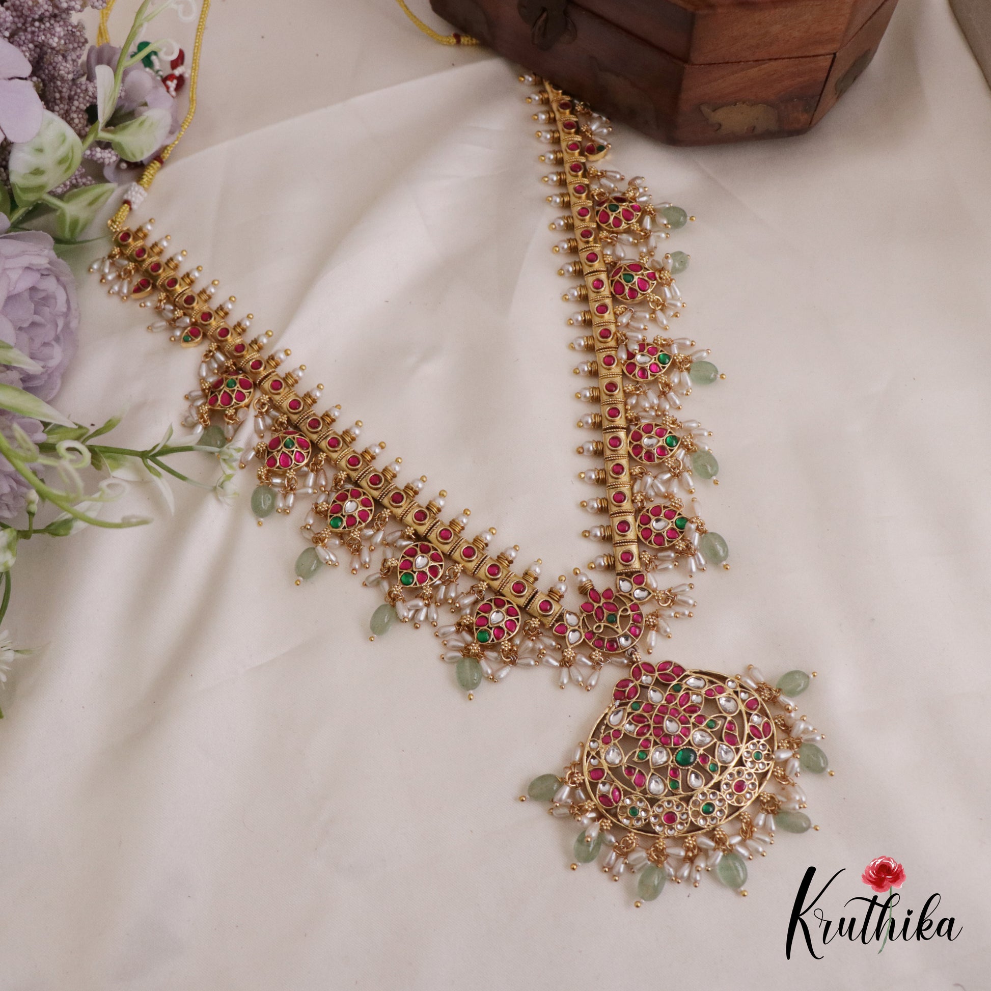 Enhance your style with our stunning Elegant Jadau Guttapusalu Haaram paired perfectly with matching earrings. Crafted with high-quality stones & beads, this set combines timeless elegance with a modern touch. Ideal for special occasions or adding a touch of glamour to your look.